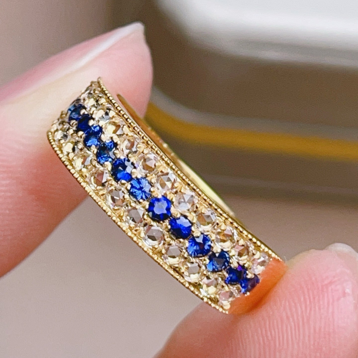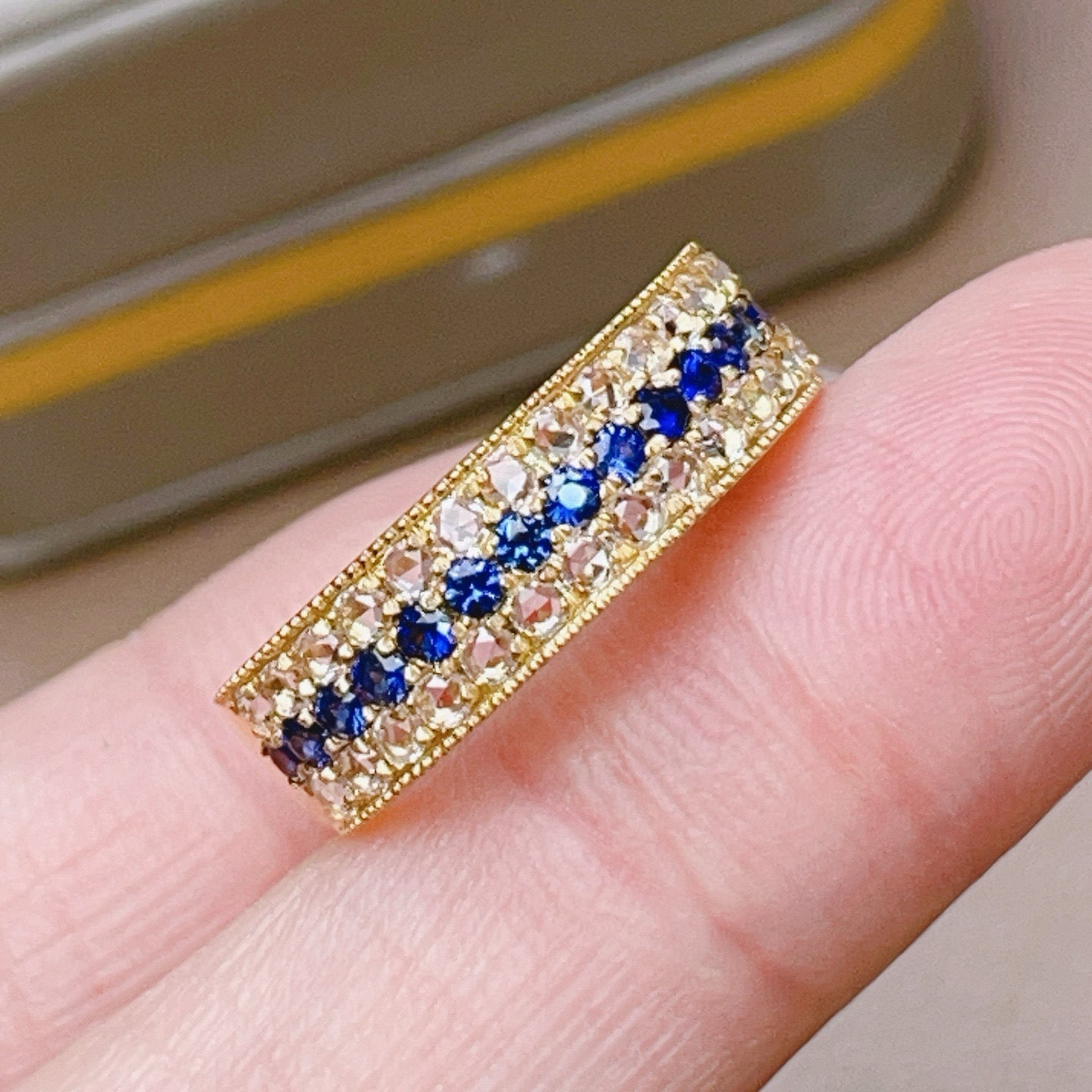 Ref:231023013 // Gold Content:14K Gold // Ring Size:7.25US // // Main Gemstone:Sapphire // Shape:Round // Carat Weight:0.31ct // Color:Blue // Treatment:Natural // Cut Grade:G // // Adjacent Gemstone 2 : Sapphire // Number of stones:28 // Shape:Round // Color:White // Treatment:Natural // Cut Grade:G //