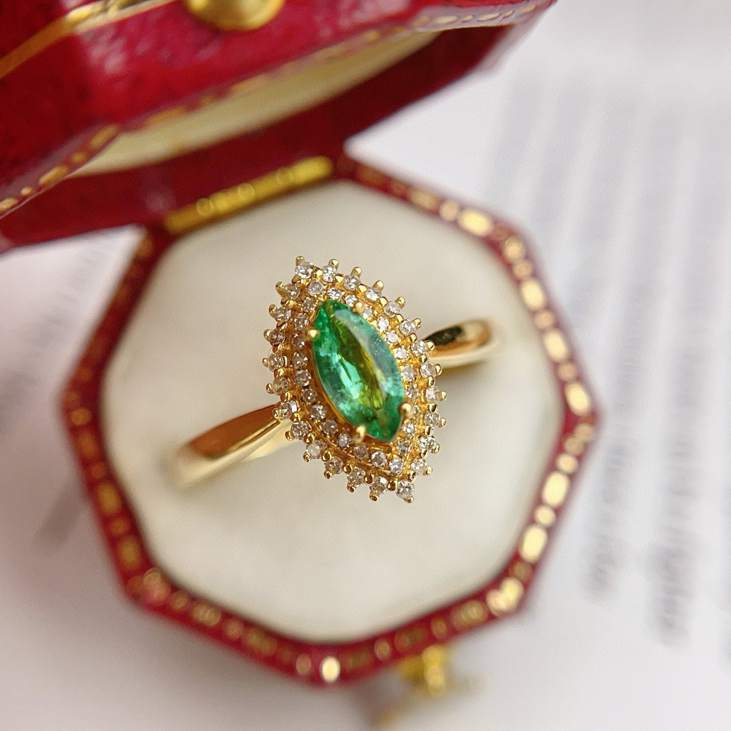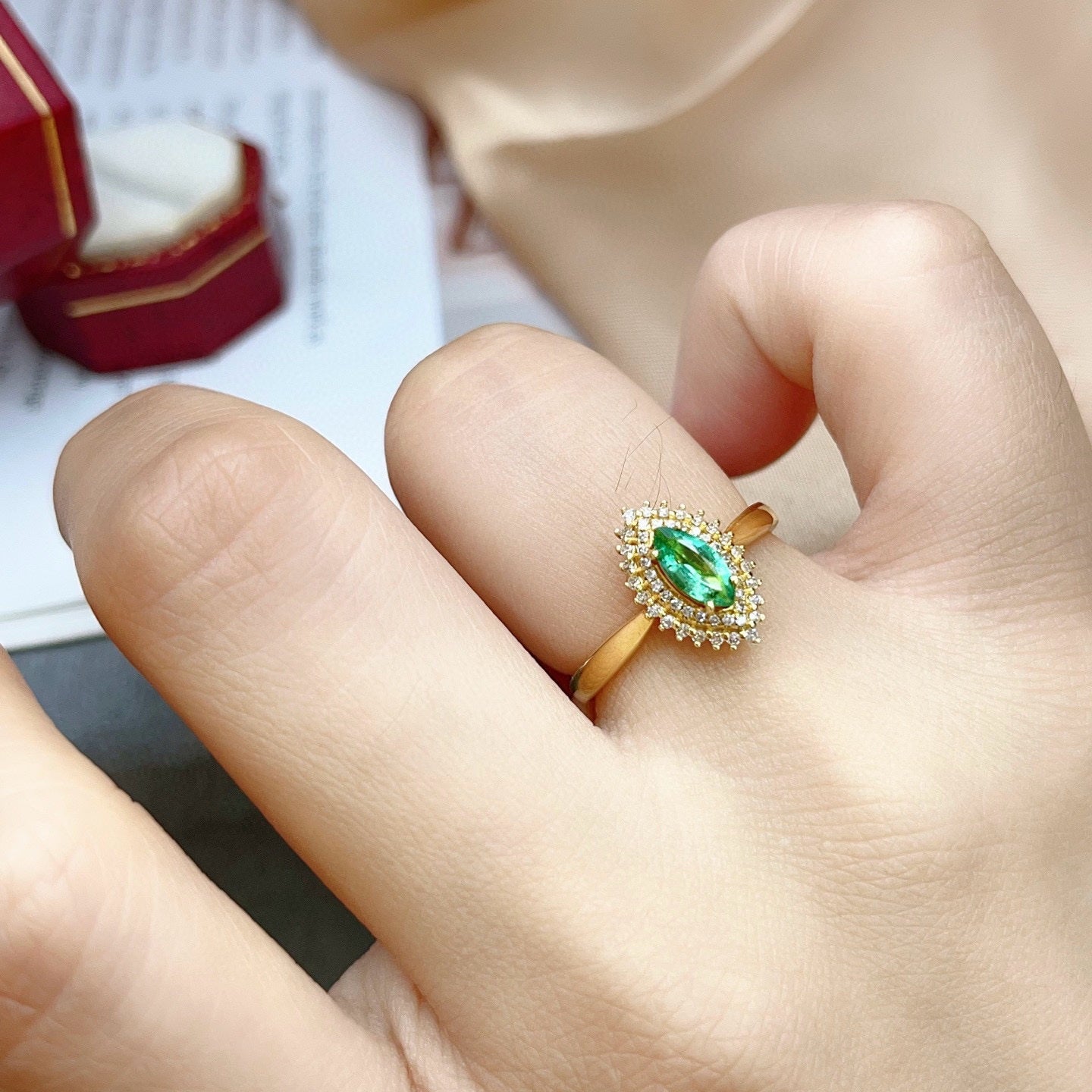 Ref:231021222 // Gold Content:14K Gold // Ring Size:7.25US // // Main Gemstone:Emerald // Shape:Marquise // Carat Weight:0.40ct // Color:Green // Treatment:Natural // // Adjacent Gemstone 2 : Diamond // Number of stones:48 // Shape:Round // Clarity Grade:VS-SI // Color:H // Treatment:Natural // Cut Grade:G //