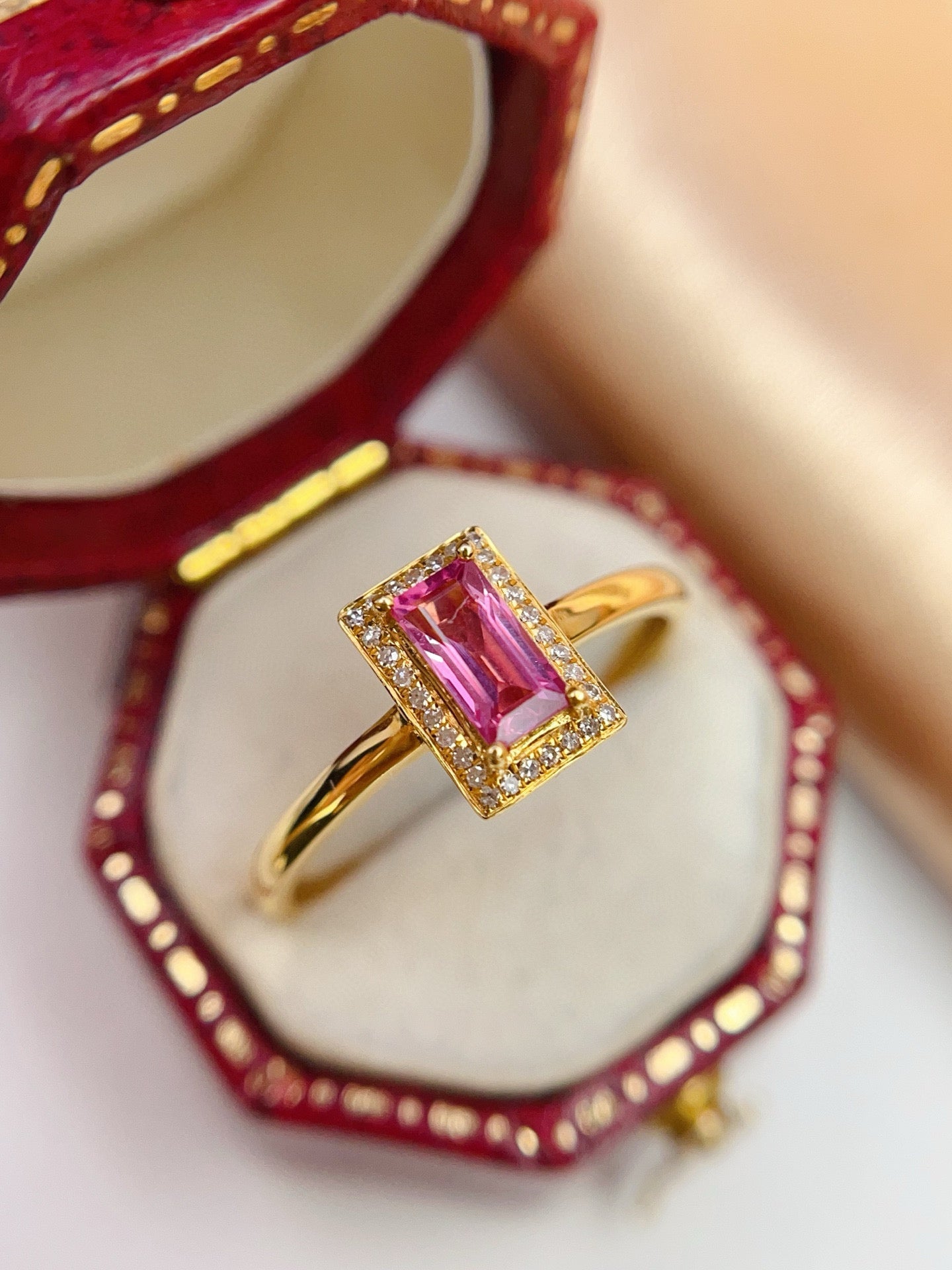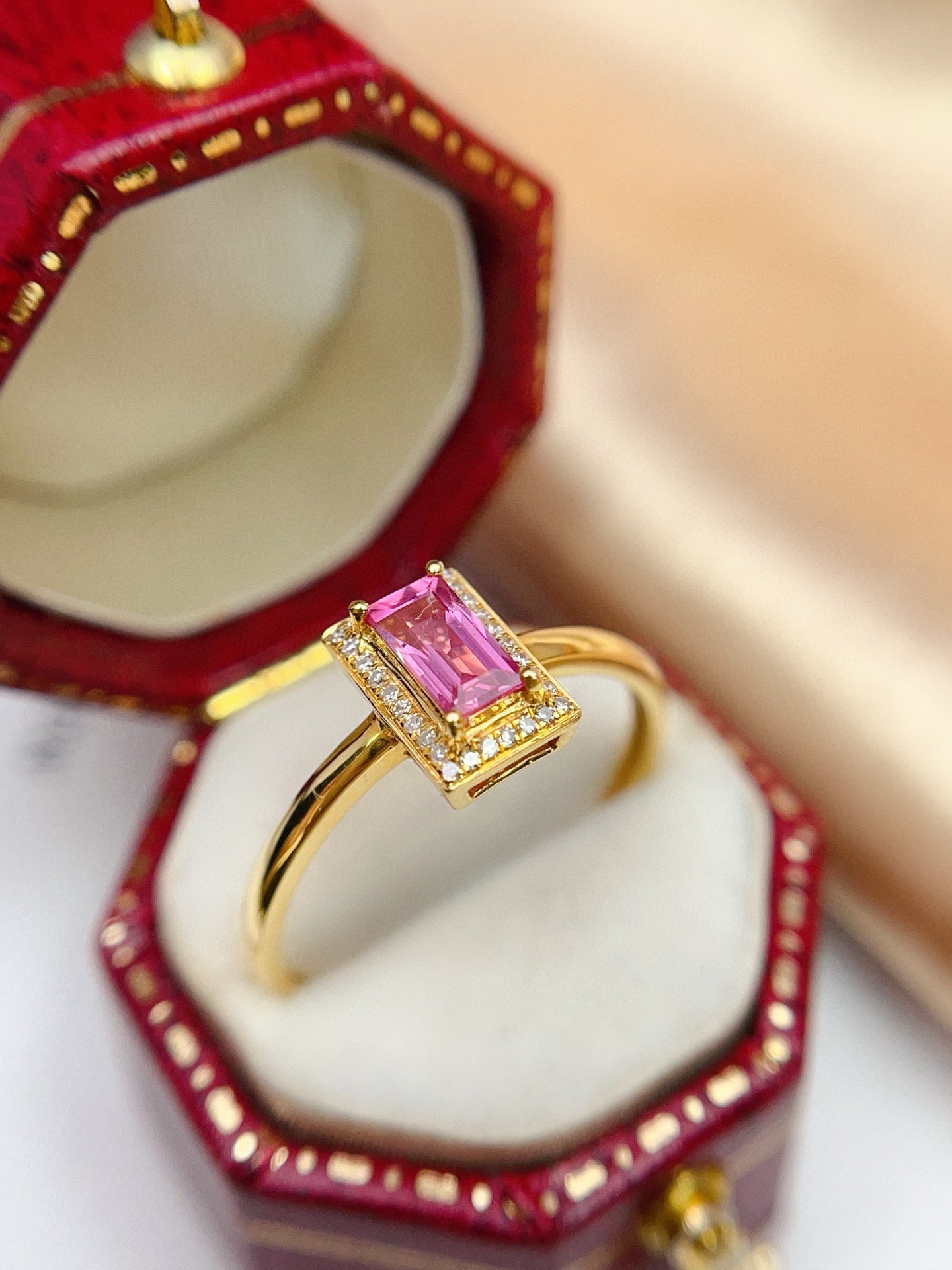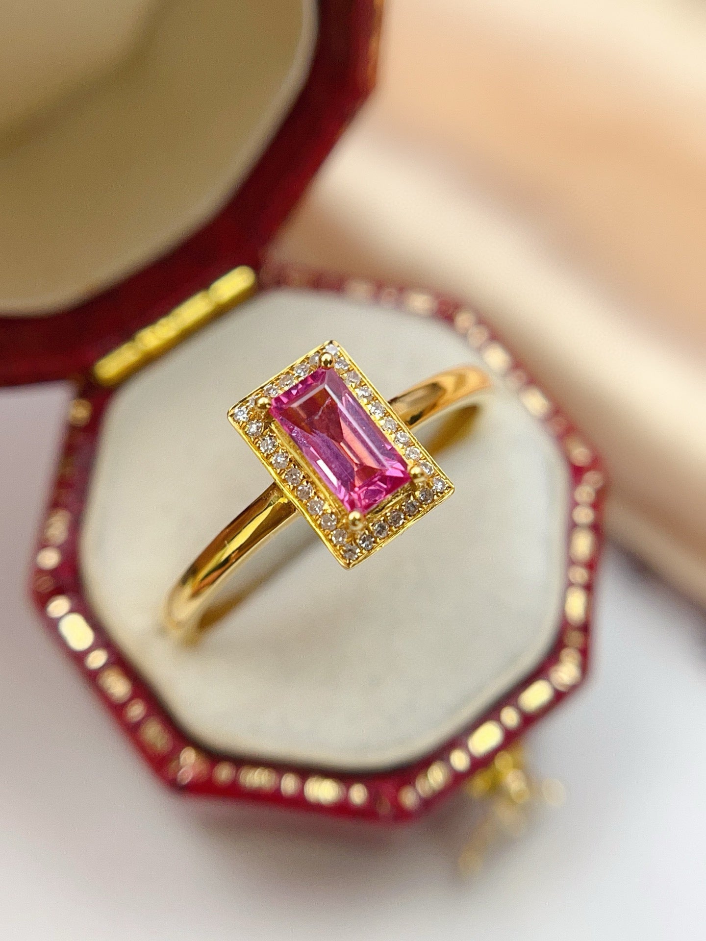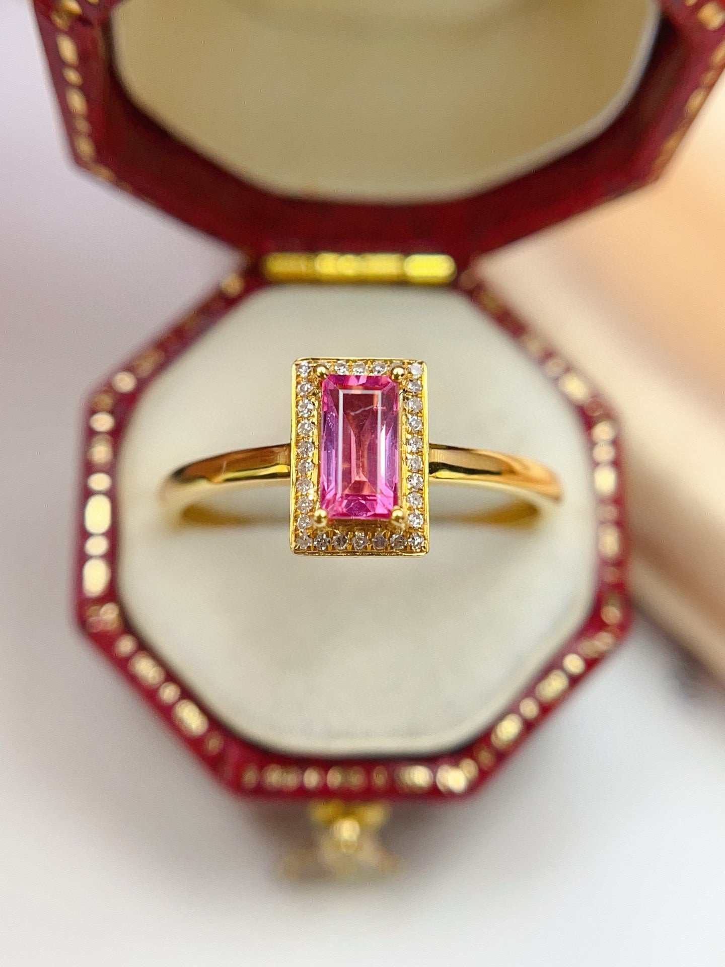 Ref:231027191 // Gold Content:14K Gold // Ring Size:7.25US // // Main Gemstone:Sapphire // Shape:Rectangle // Carat Weight:0.45ct // Color:Pink // Treatment:Natural // // Adjacent Gemstone 2 : Diamond // Number of stones:24 // Shape:Round // Clarity Grade:VS-SI // Color:H // Treatment:Natural // Cut Grade:G //