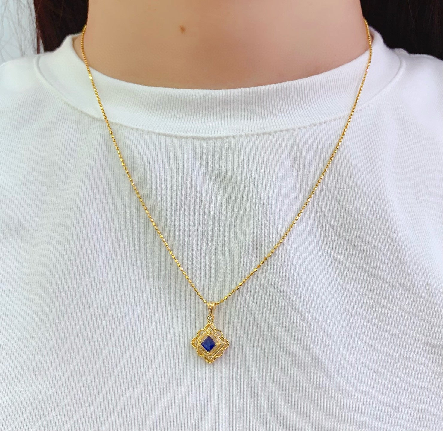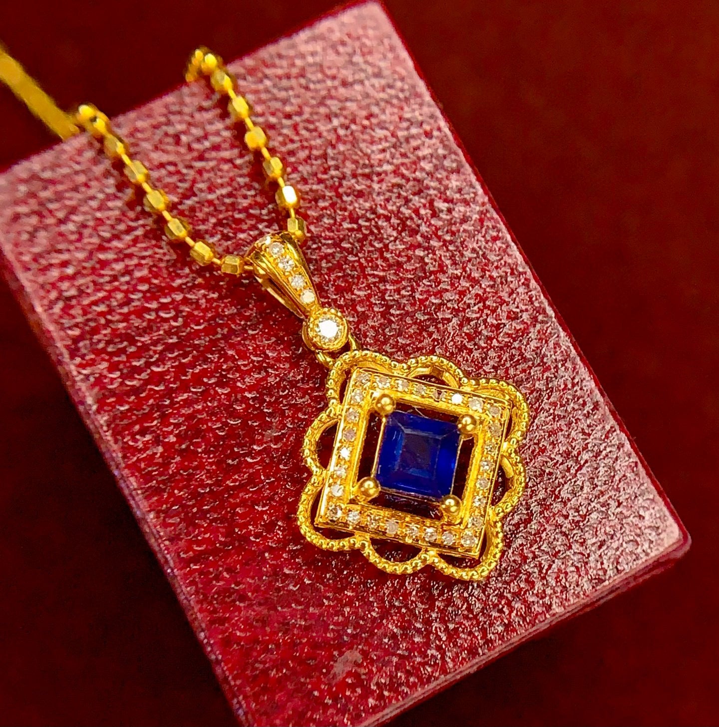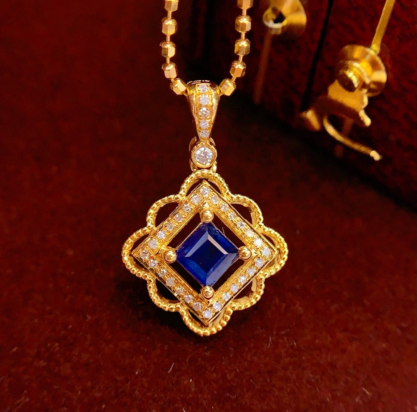 Ref:231025107 // Gold Content:14K Gold // Main Gemstone:Sapphire // Shape:Square // Carat Weight:0.5ct // Color:Blue // Treatment:Natural // // Adjacent Gemstone 2 : Diamond // Number of stones:34 // Shape:Round // Clarity Grade:VS-SI // Color:H // Treatment:Natural // Cut Grade:G //