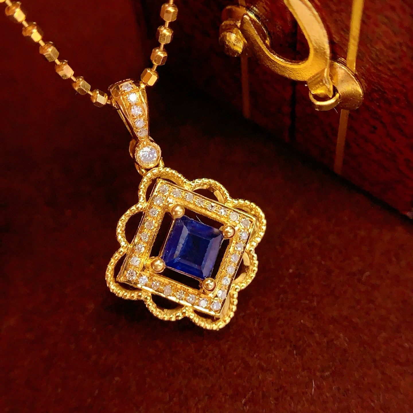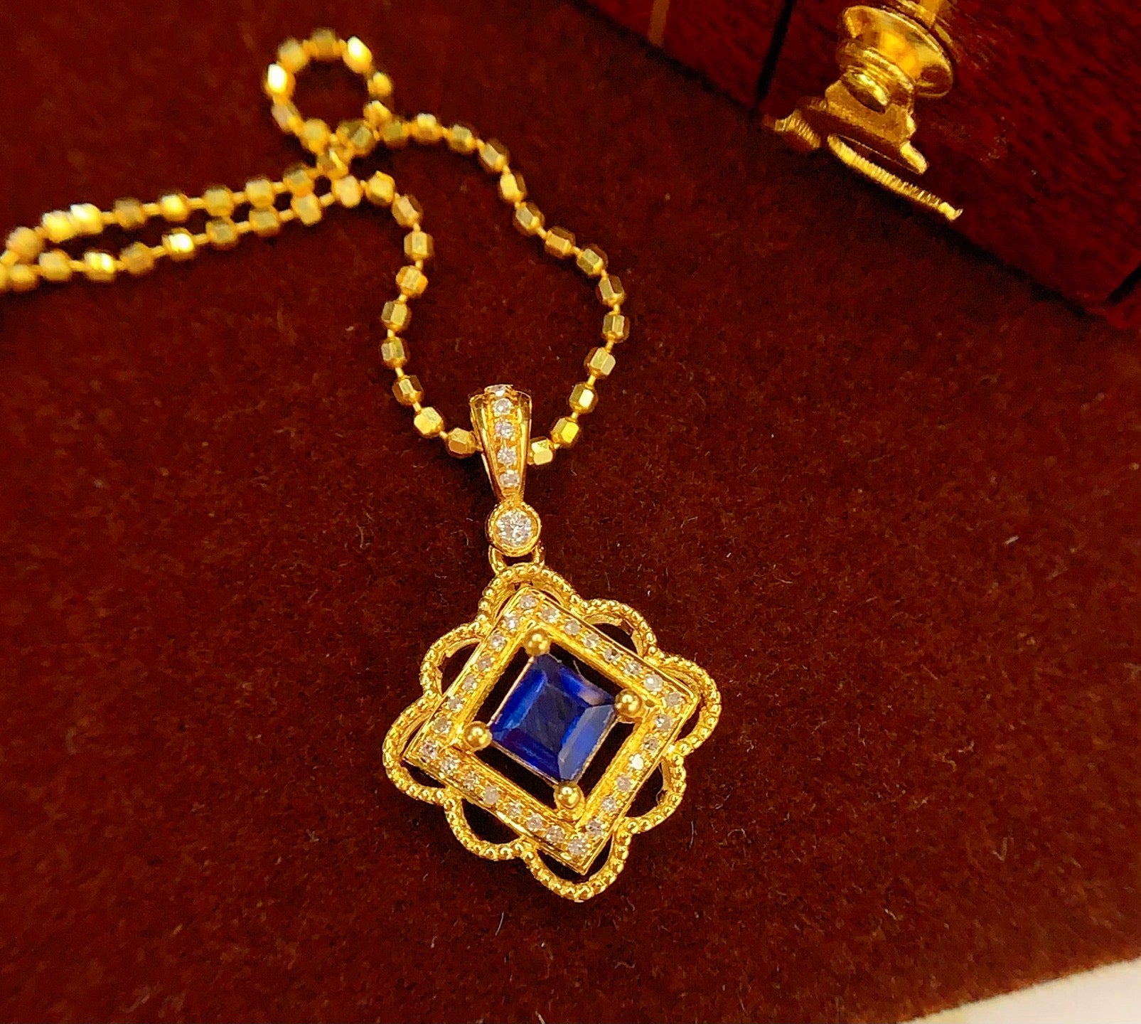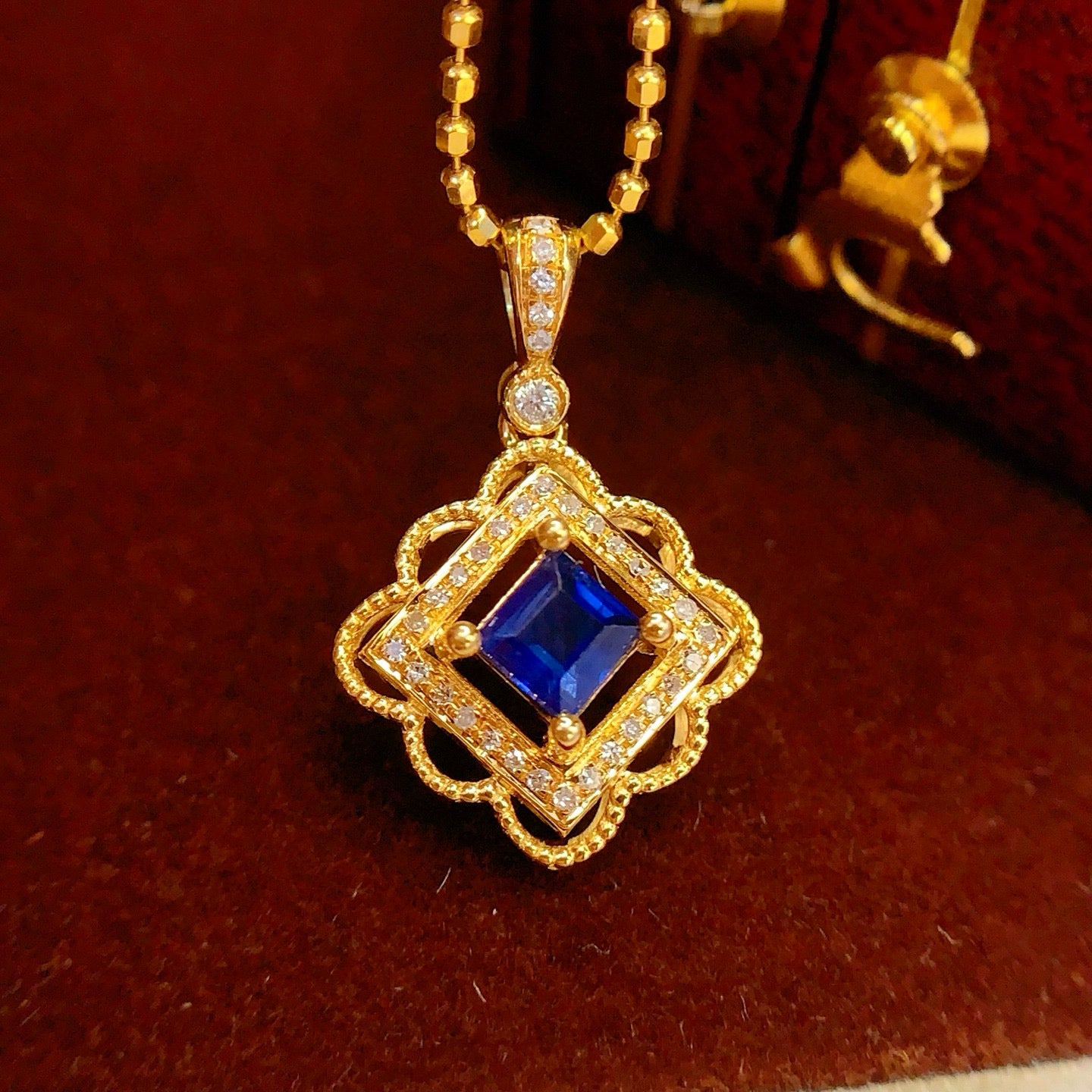 Ref:231025107 // Gold Content:14K Gold // Main Gemstone:Sapphire // Shape:Square // Carat Weight:0.5ct // Color:Blue // Treatment:Natural // // Adjacent Gemstone 2 : Diamond // Number of stones:34 // Shape:Round // Clarity Grade:VS-SI // Color:H // Treatment:Natural // Cut Grade:G //