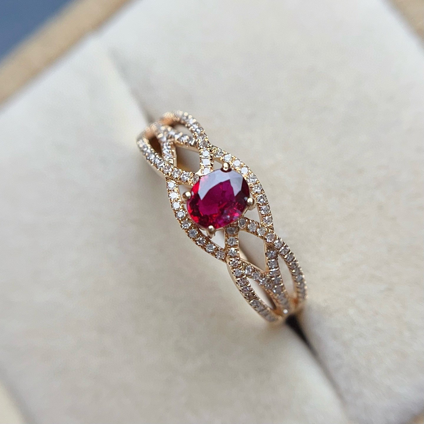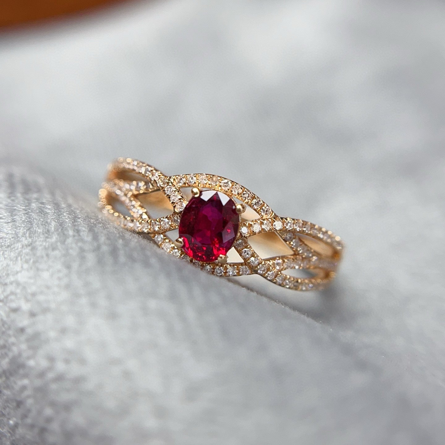 Ref:231027200 // Gold Content:14K Gold // Ring Size:7.25US // // Main Gemstone:Ruby // Shape:Oval // Carat Weight:0.50ct // Color:Red // Treatment:Natural // // Adjacent Gemstone 2 : Diamond // Number of stones:100 // Shape:Round // Clarity Grade:VS-SI // Color:H // Treatment:Natural // Cut Grade:G //