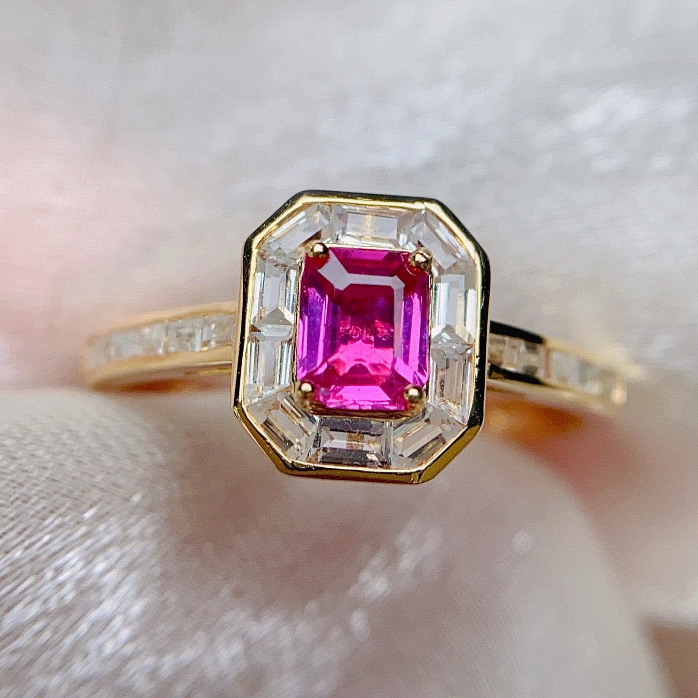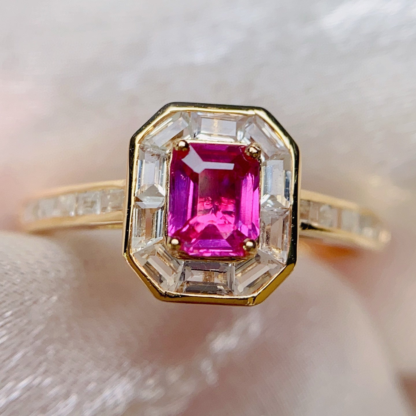 Ref:231027073 // Gold Content:14K Gold // Ring Size:7.25US // // Main Gemstone:Ruby // Shape:Octagonal // Carat Weight:0.50ct // Color:Red // Treatment:Natural // // Adjacent Gemstone 2 : Sapphire // Number of stones:20 // Shape:Baguette // Color:White // Treatment:Natural //