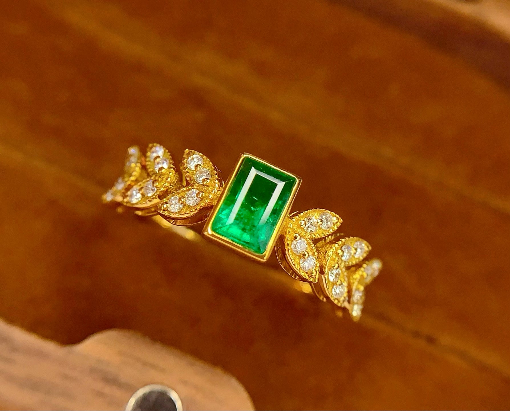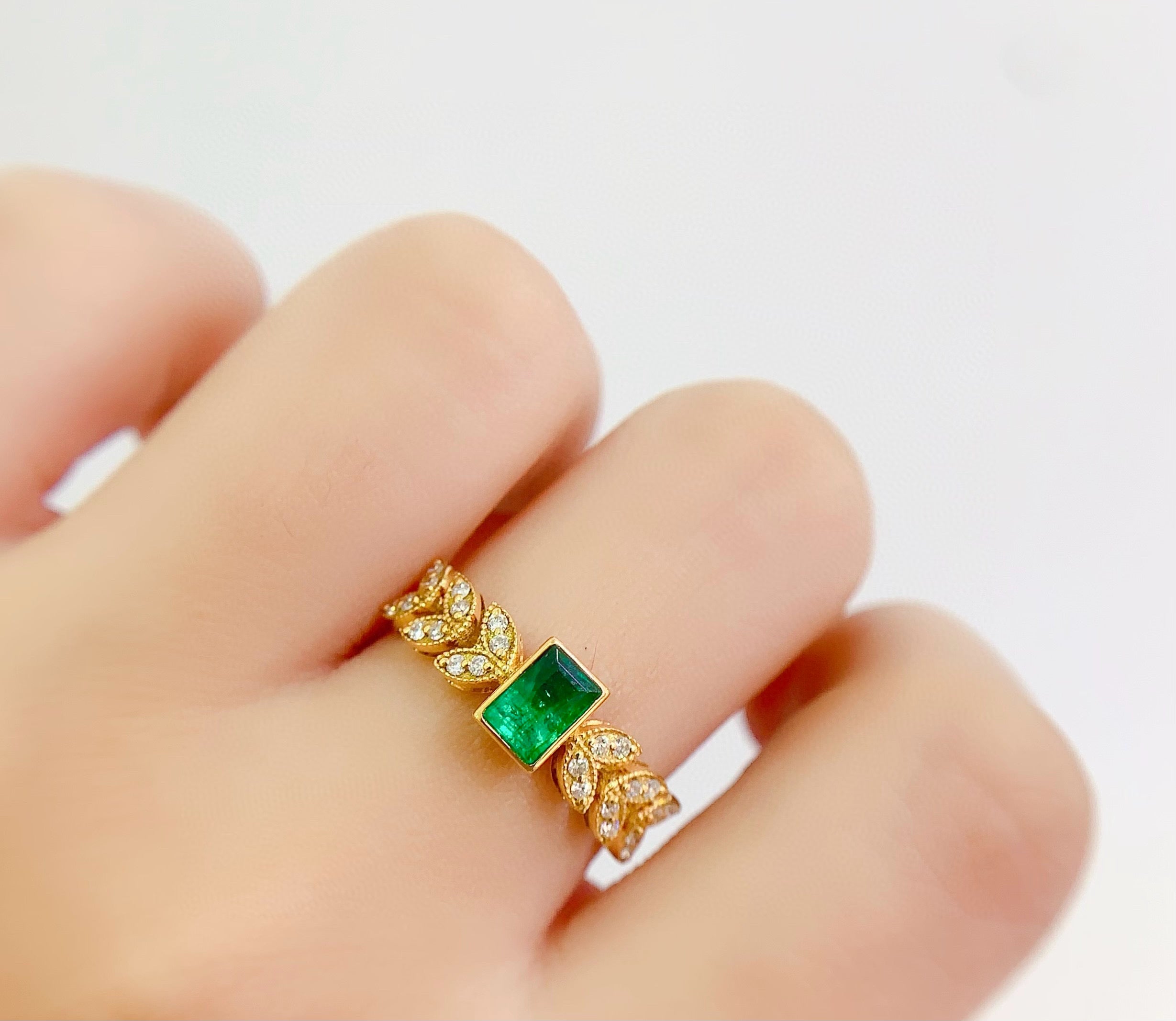 Ref:231025186 // Gold Content:14K Gold // Ring Size:7.25US // // Main Gemstone:Emerald // Shape:Rectangle // Carat Weight:0.55ct // Color:Vivid Green // Treatment:Natural // // Adjacent Gemstone 2 : Diamond // Number of stones:24 // Shape:Round // Clarity Grade:VS-SI // Color:H // Treatment:Natural // Cut Grade:G //