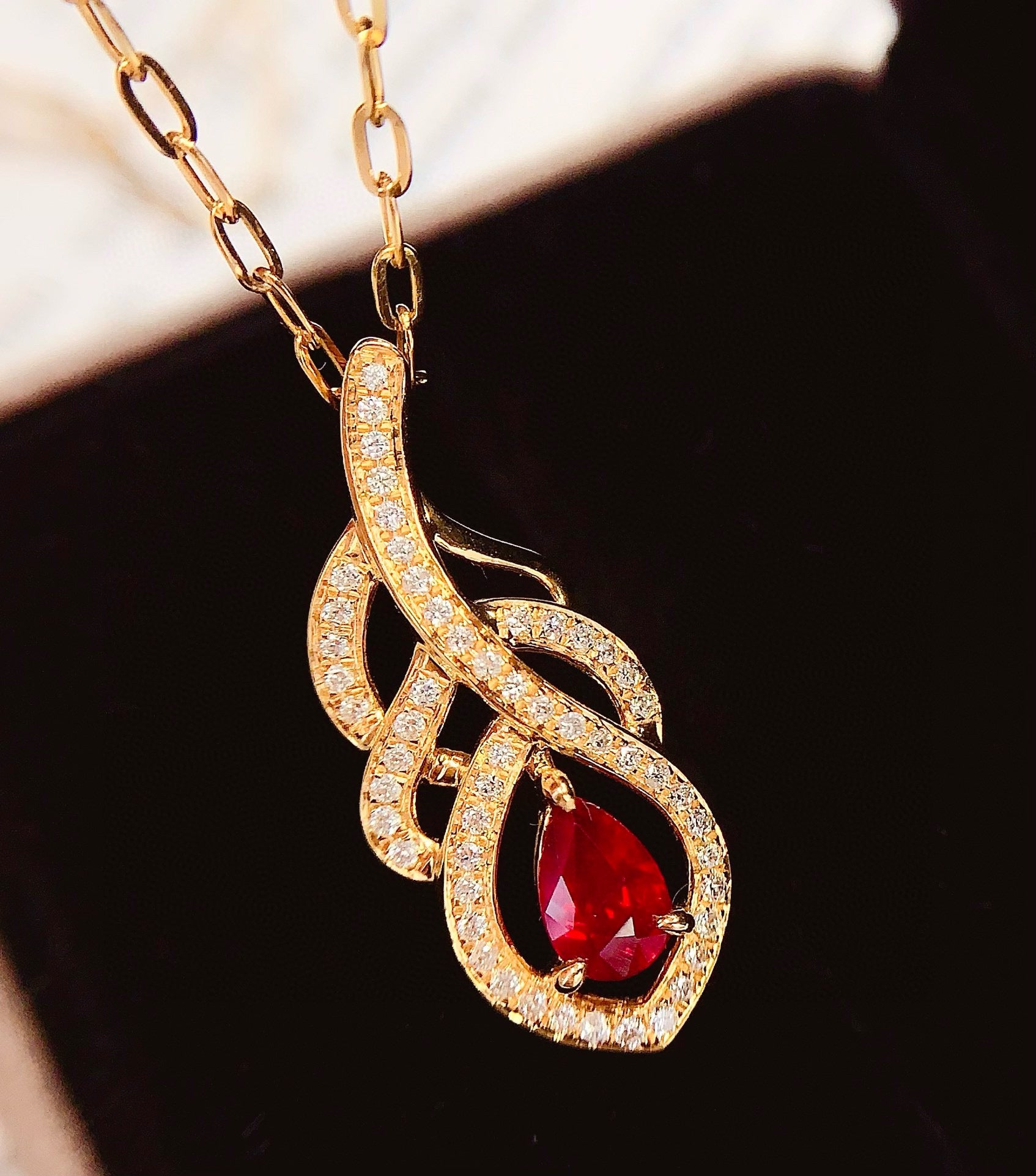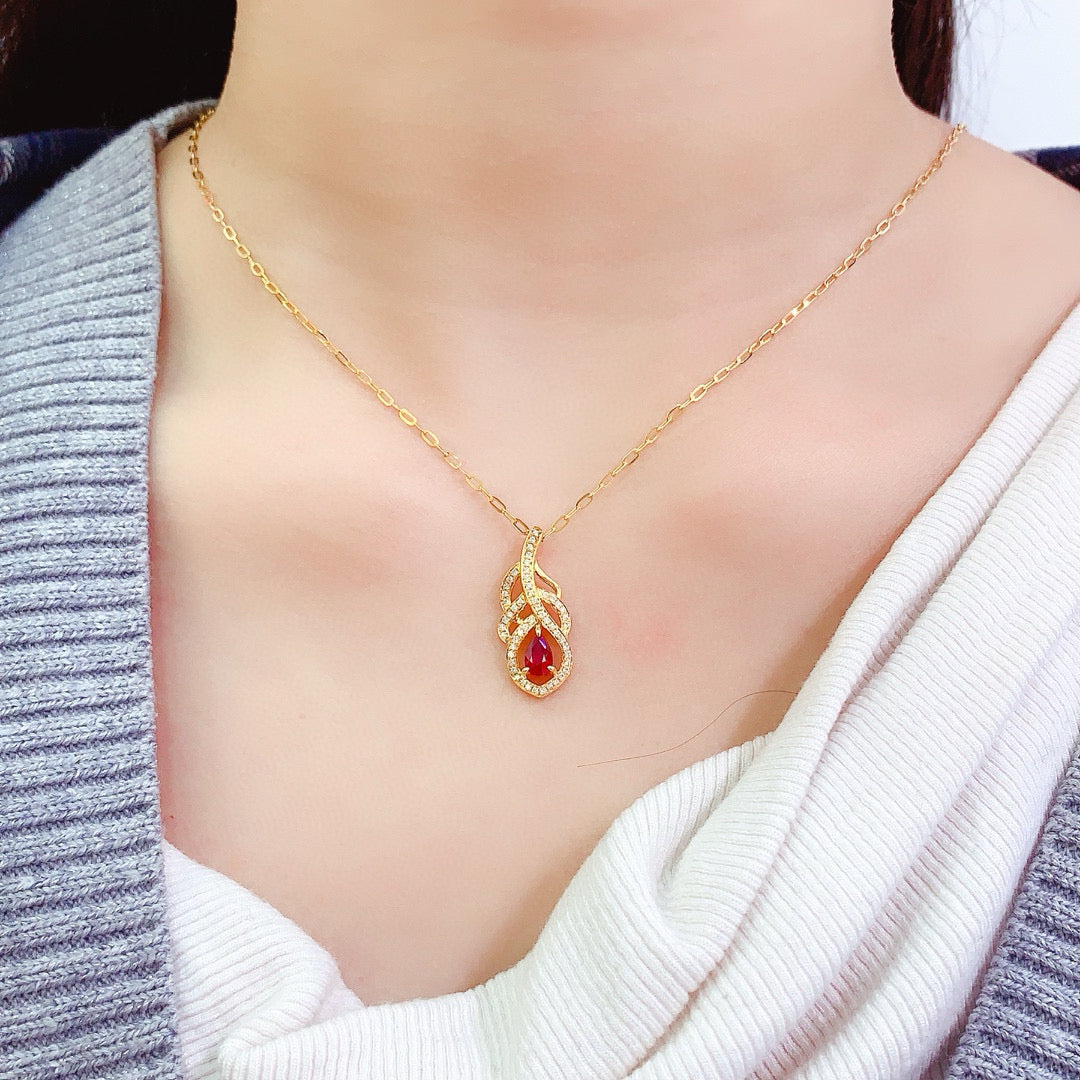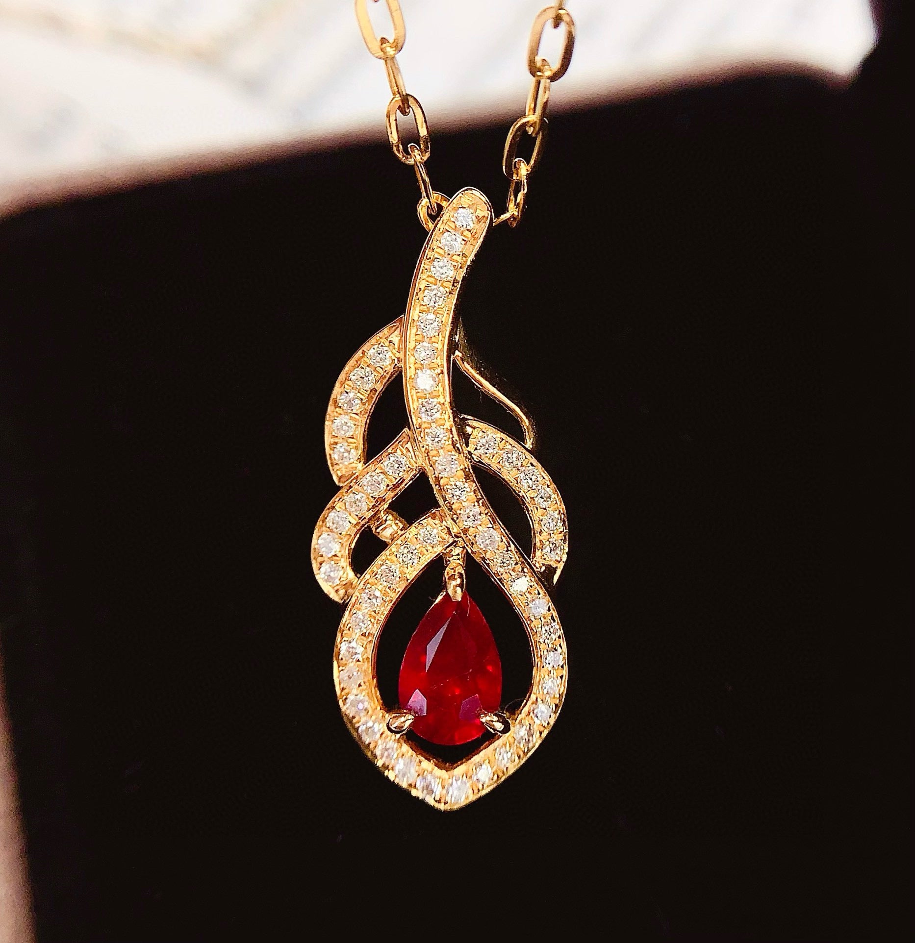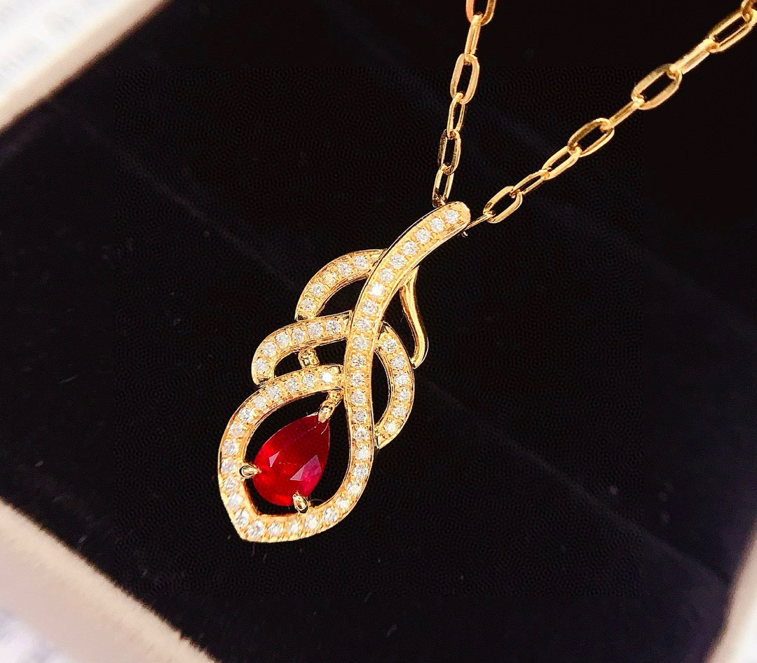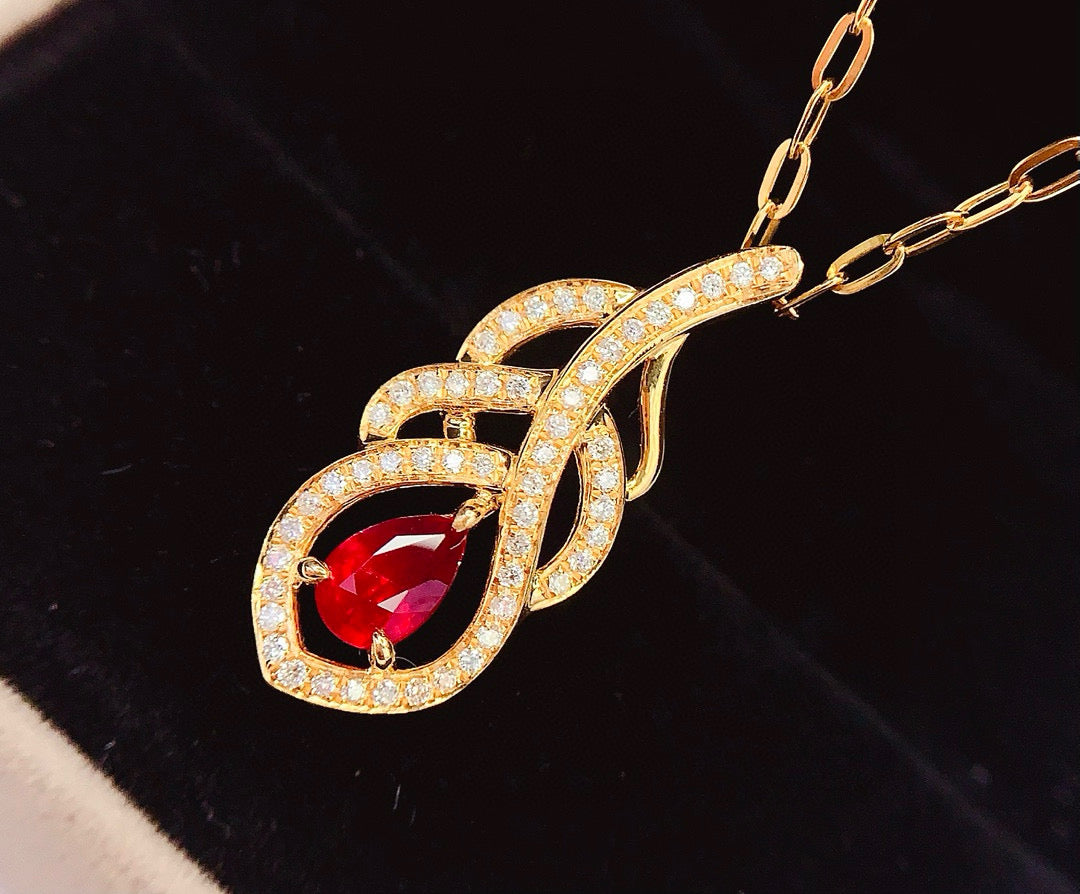 Ref:231027107 // Gold Content:14K Gold // Main Gemstone:Ruby // Shape:Pear // Carat Weight:0.7ct // Color:Red // Treatment:Natural // // Adjacent Gemstone 2 : Diamond // Number of stones:53 // Shape:Round // Clarity Grade:VS-SI // Color:H // Treatment:Natural // Cut Grade:G //