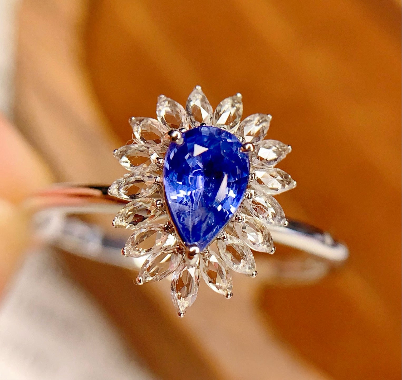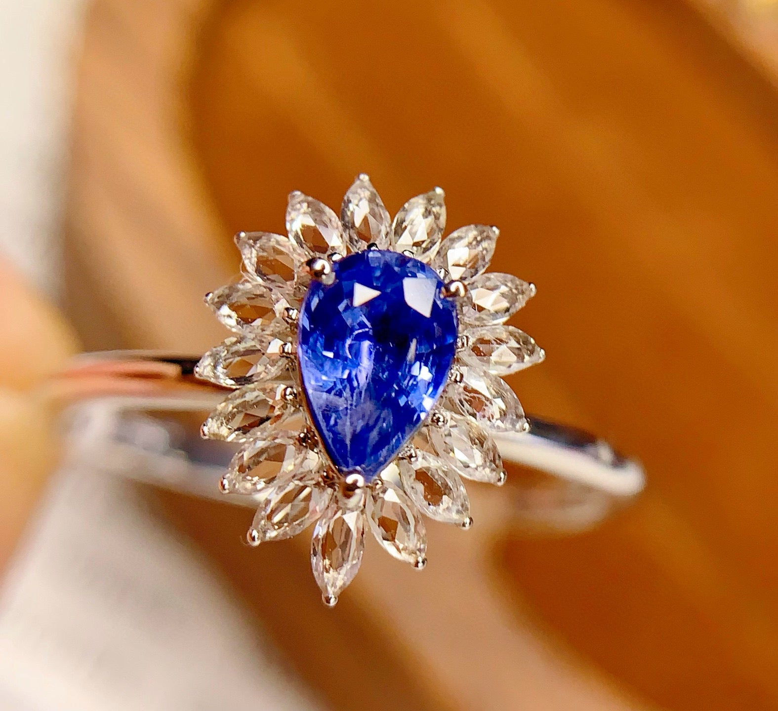 Ref:231025174 // Gold Content:14K Gold // Ring Size:7.25US // // Main Gemstone:Sapphire // Shape:Pear // Carat Weight:0.7ct // Color:Blue // Treatment:Natural // // Adjacent Gemstone 2 : Sapphire // Number of stones:17 // Shape:Marquise // Color:White // Treatment:Natural //