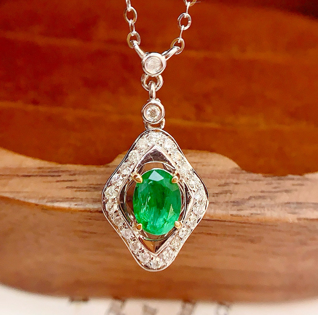 14K GOLD 0.7 CT VIVID GREEN NATURAL EMERALD & DIAMOND NECKLACE