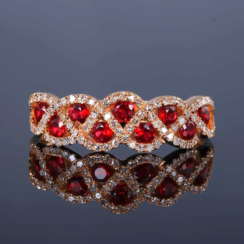 Ref:231021046 // Gold Content:14K Gold // Ring Size:7.25US // // Main Gemstone:Ruby // Shape:Round // Carat Weight:0.55ct // Color:Red // Treatment:Natural // Cut Grade:G // // Adjacent Gemstone 2 : Diamond // Number of stones:63 // Shape:Round // Carat Weight:0.19ct // Clarity Grade:VS-SI // Color:H // Treatment:Natural // Cut Grade:G //