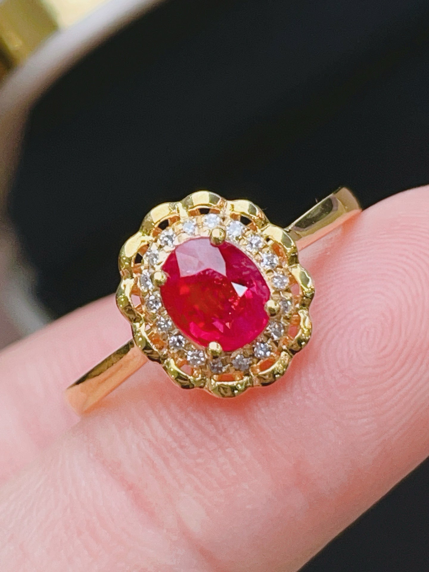 Ref:231023219 // Gold Content:14K Gold // Ring Size:7.25US // // Main Gemstone:Ruby // Shape:Oval // Carat Weight:0.8ct // Color:Red // Treatment:Natural // // Adjacent Gemstone 2 : Diamond // Number of stones:18 // Shape:Round // Clarity Grade:VS-SI // Color:H // Treatment:Natural // Cut Grade:G //