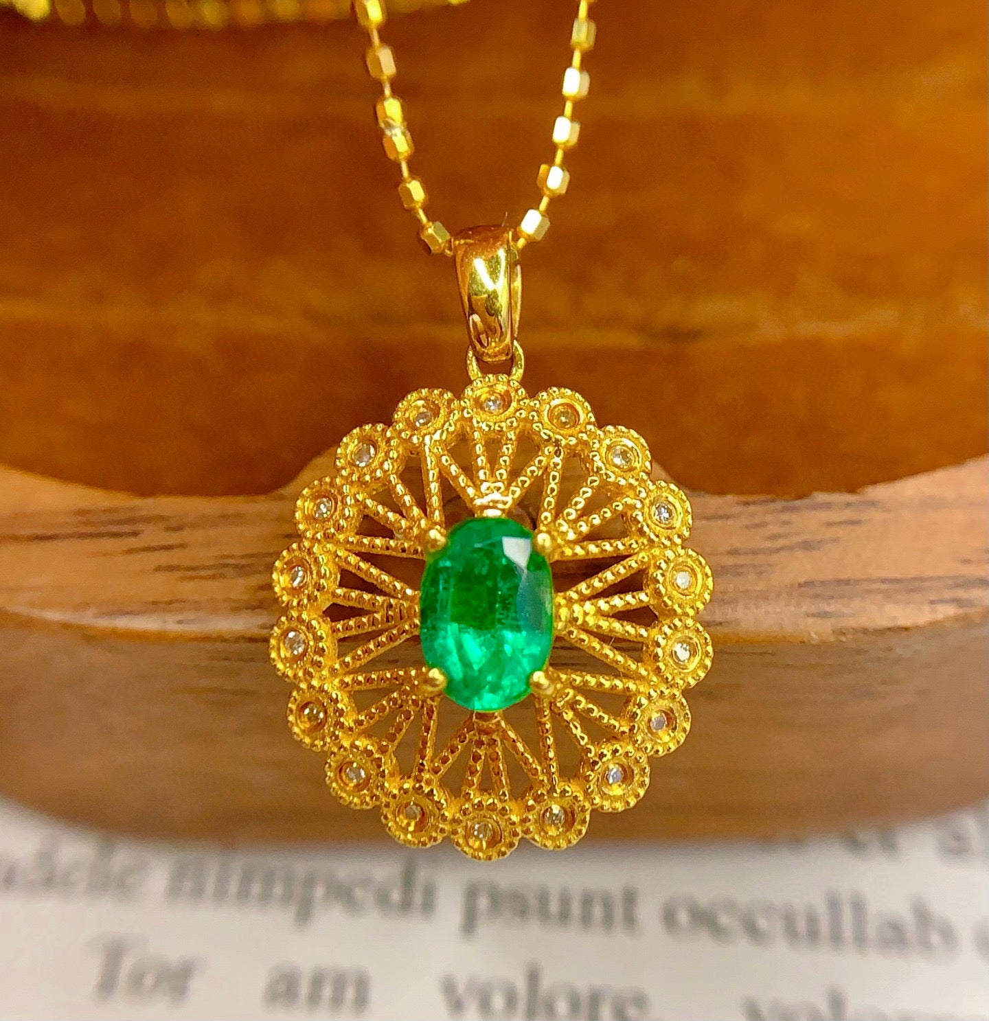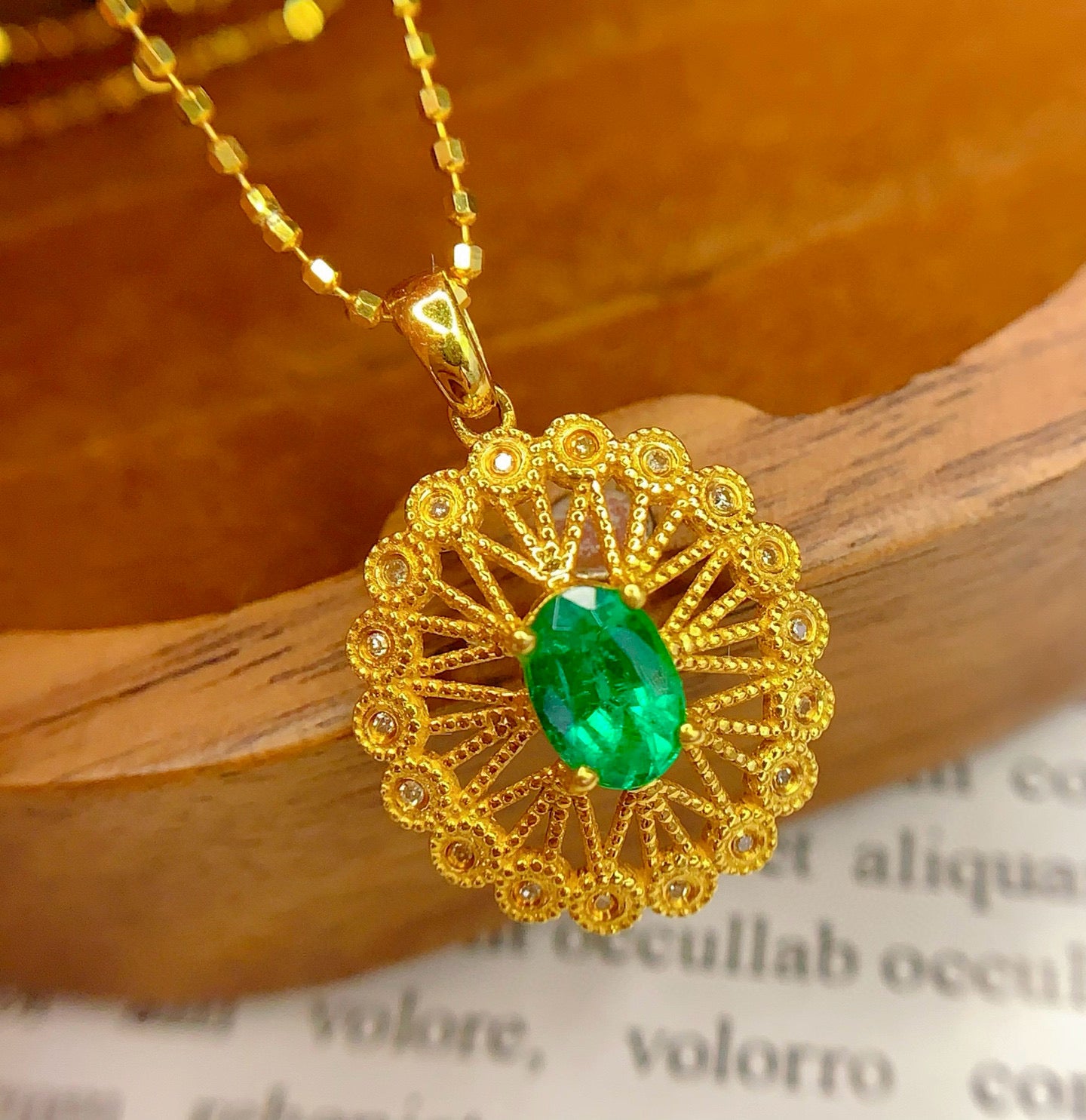 Ref:231025175 // Gold Content:14K Gold // Main Gemstone:Emerald // Shape:Oval // Carat Weight:0.8ct // Color:Vivid Green // Treatment:Natural // // Adjacent Gemstone 2 : Diamond // Number of stones:18 // Shape:Round // Clarity Grade:VS-SI // Color:H // Treatment:Natural // Cut Grade:G //