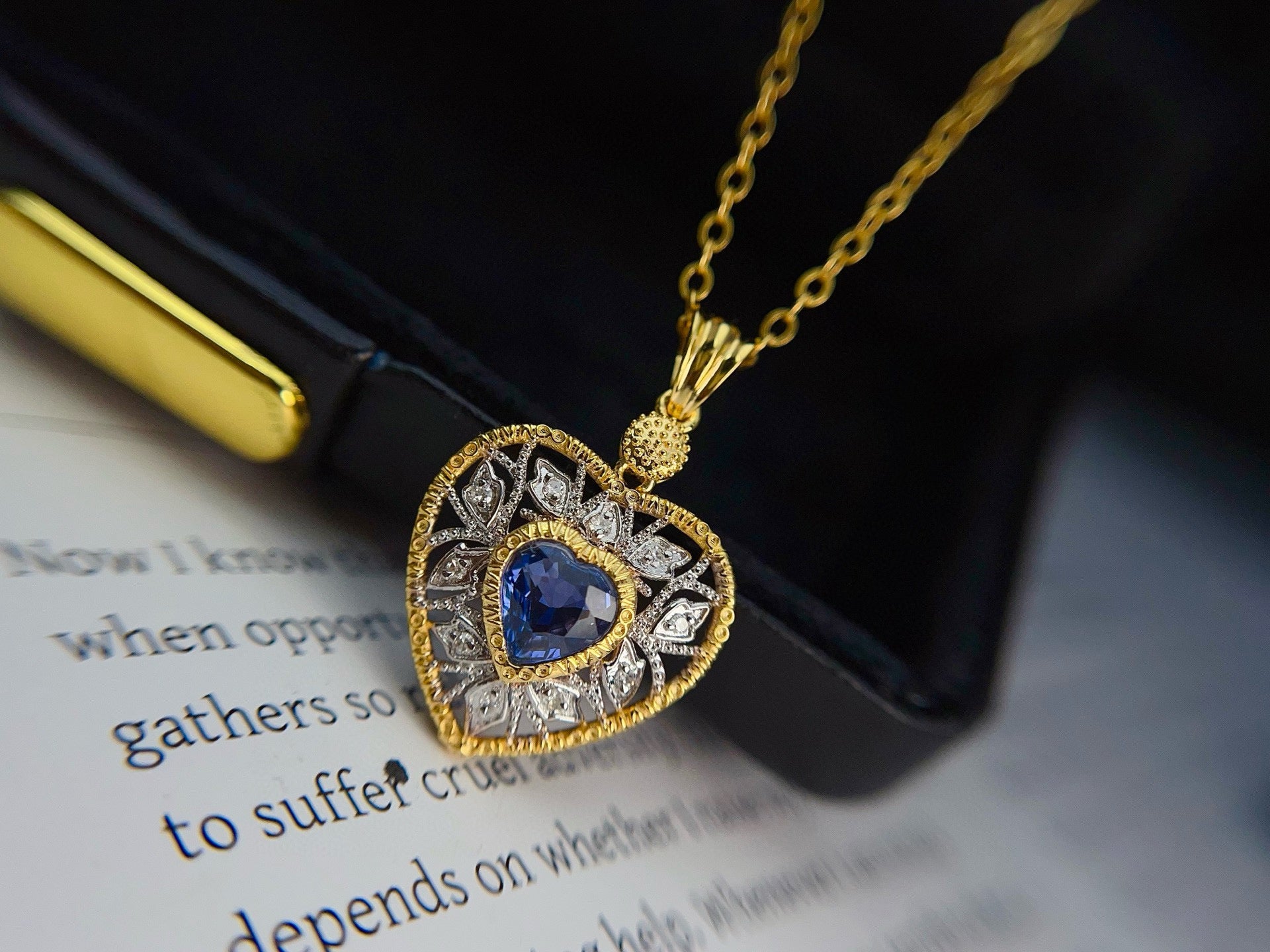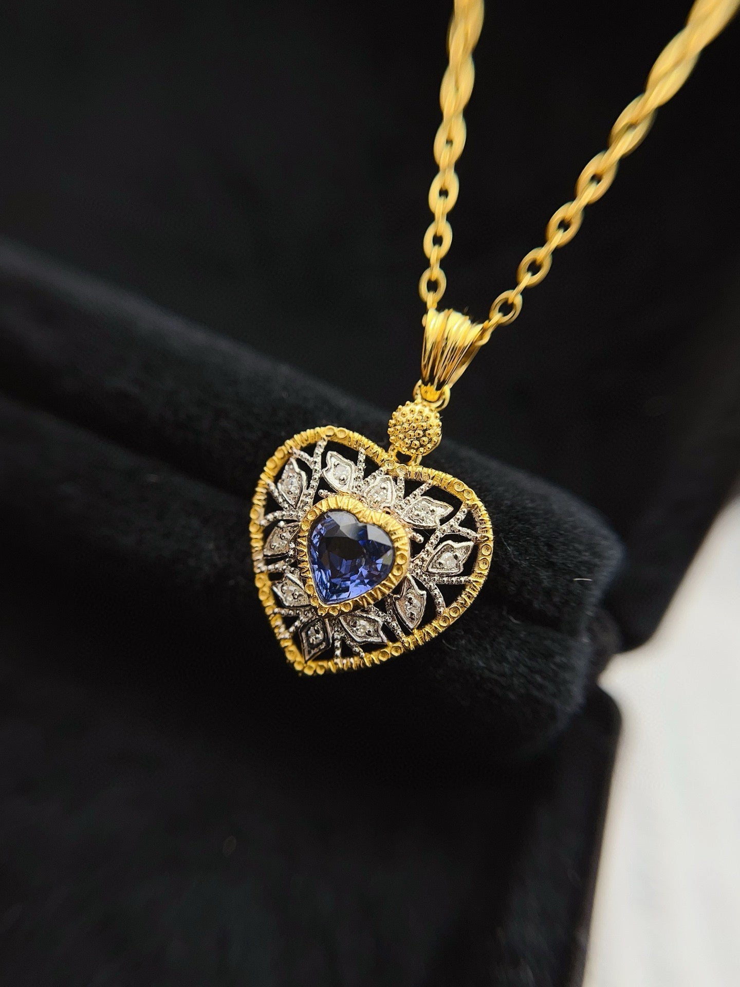 Ref:231027172 // Gold Content:14K Gold // Main Gemstone:Sapphire // Shape:Heart // Carat Weight:0.80ct // Color:Blue // Treatment:Natural // // Adjacent Gemstone 2 : Diamond // Number of stones:10 // Shape:Round // Clarity Grade:VS-SI // Color:H // Treatment:Natural // Cut Grade:G //