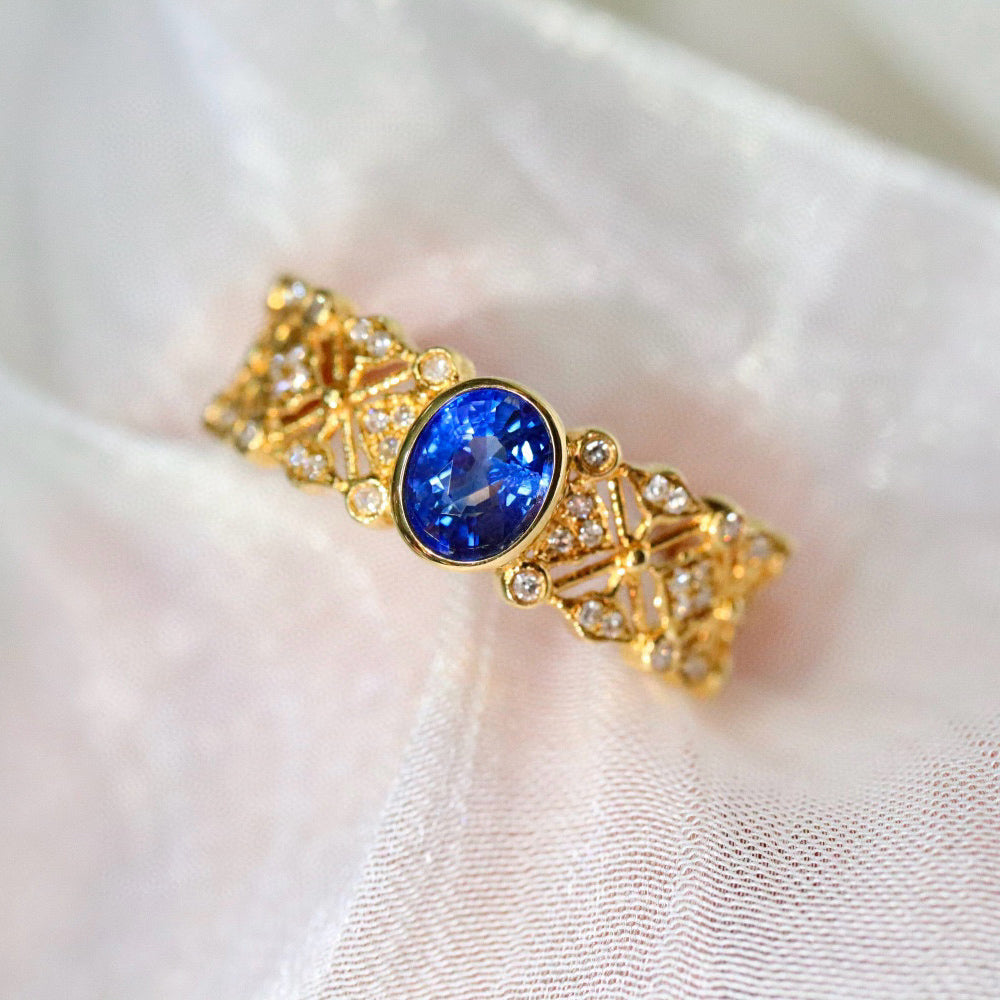 Ref:231019159 // Gold Content:14K Gold // Ring Size:7.25US // // Main Gemstone:Sapphire // Shape:Oval // Carat Weight:0.55ct // Color:Blue // Treatment:Natural // // Adjacent Gemstone 2 : Diamond // Shape:Round // Carat Weight:0.26ct // Clarity Grade:VS-SI // Color:H // Treatment:Natural // Cut Grade:G //