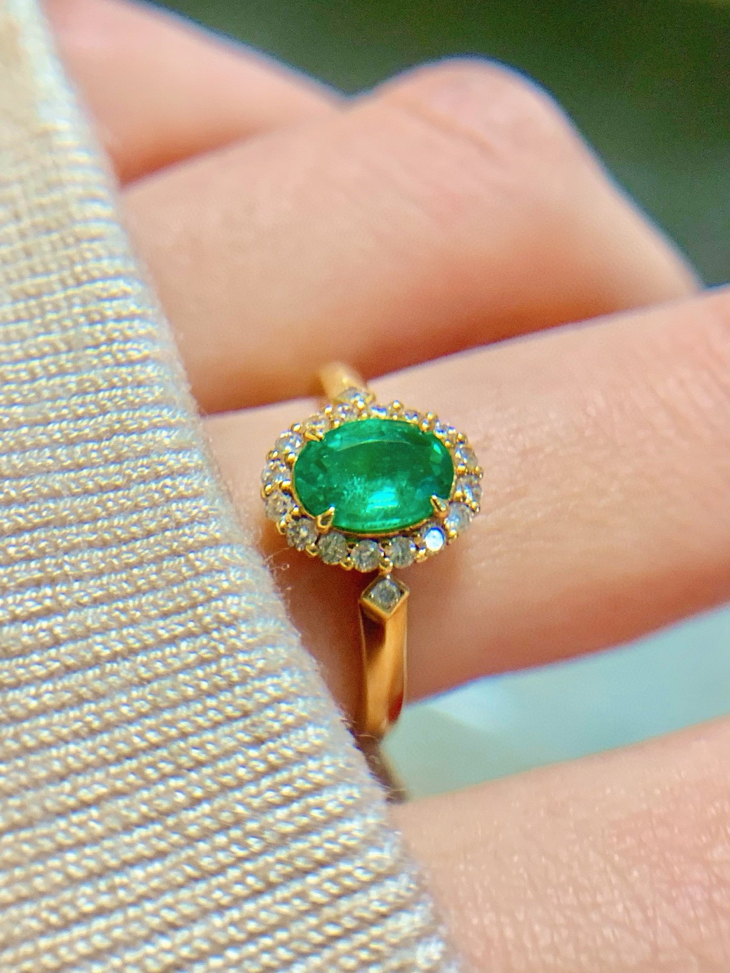 Ref:231025145 // Gold Content:14K Gold // Ring Size:7.25US // // Main Gemstone:Emerald // Shape:Oval // Carat Weight:0.85ct // Color:Vivid Green // Treatment:Natural // // Adjacent Gemstone 2 : Diamond // Shape:Round // Clarity Grade:VS-SI // Color:H // Treatment:Natural // Cut Grade:G //
