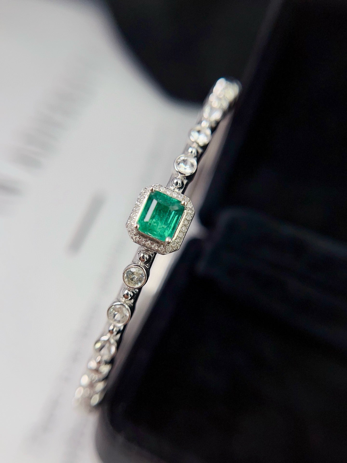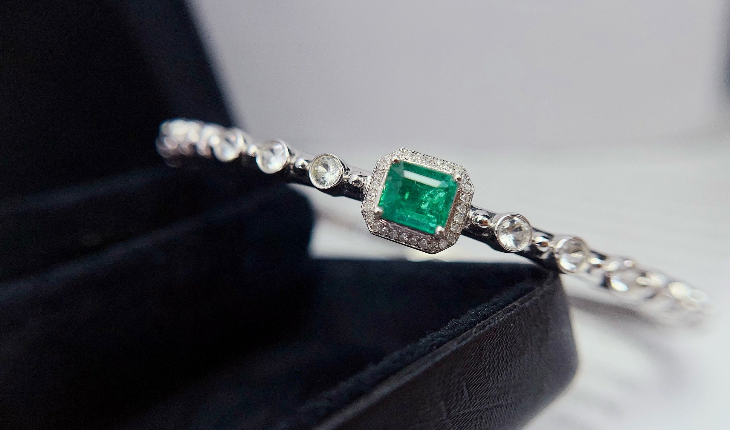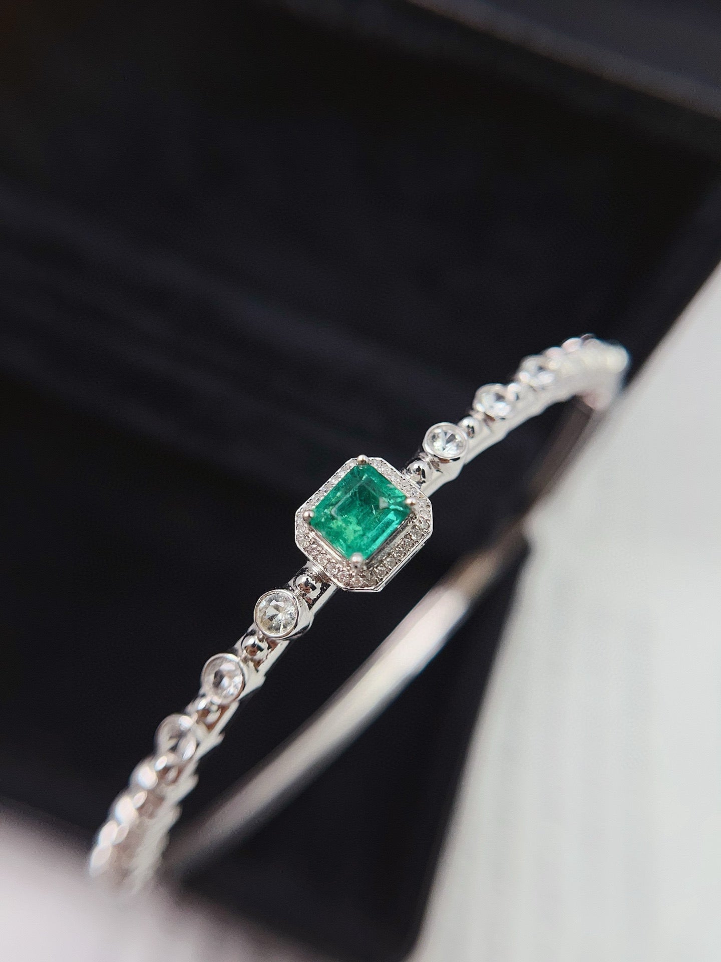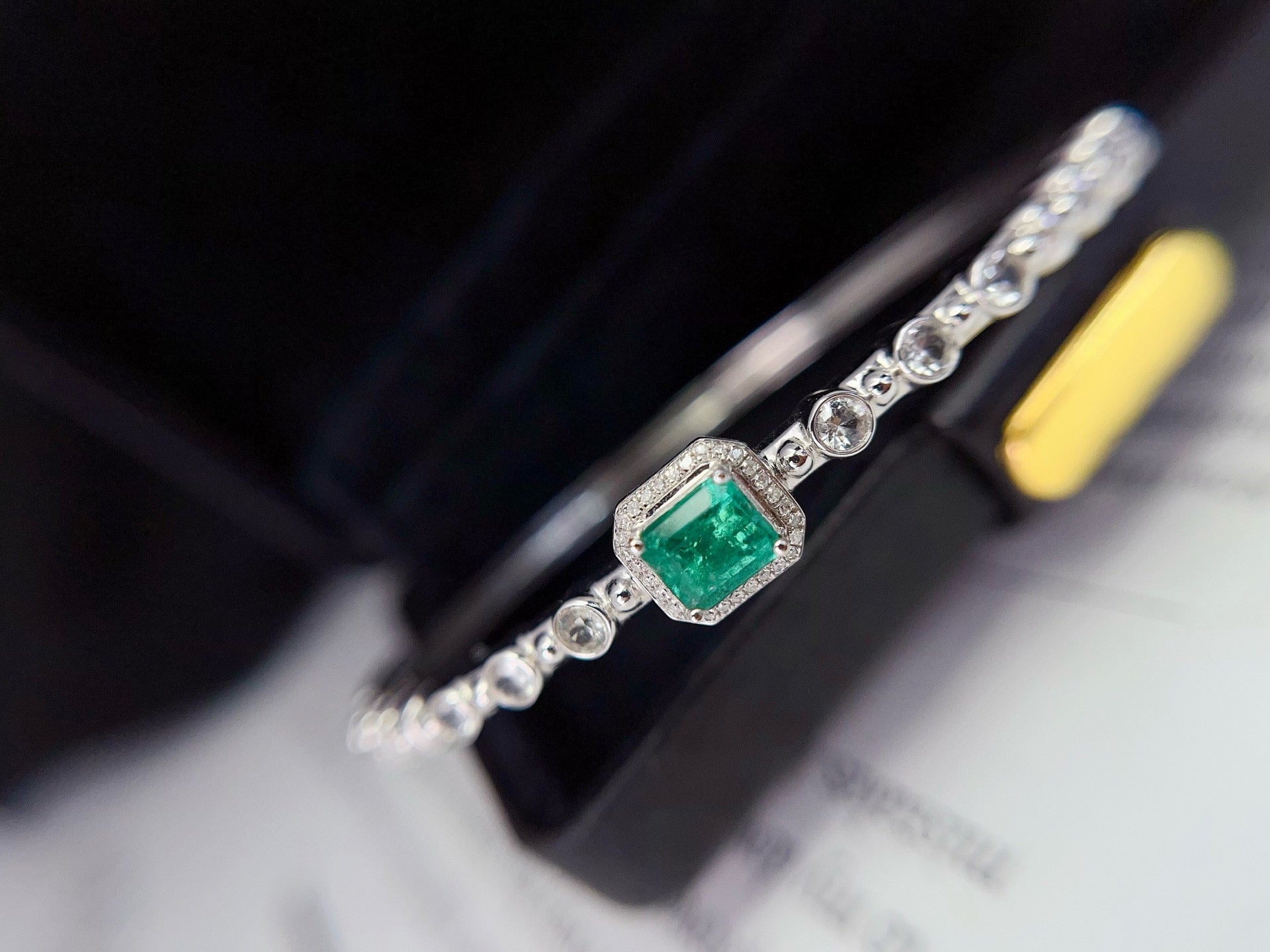 14K GOLD 0.90 CT VIVID GREEN NATURAL EMERALD & DIAMOND & SAPPHIRE BANGLE