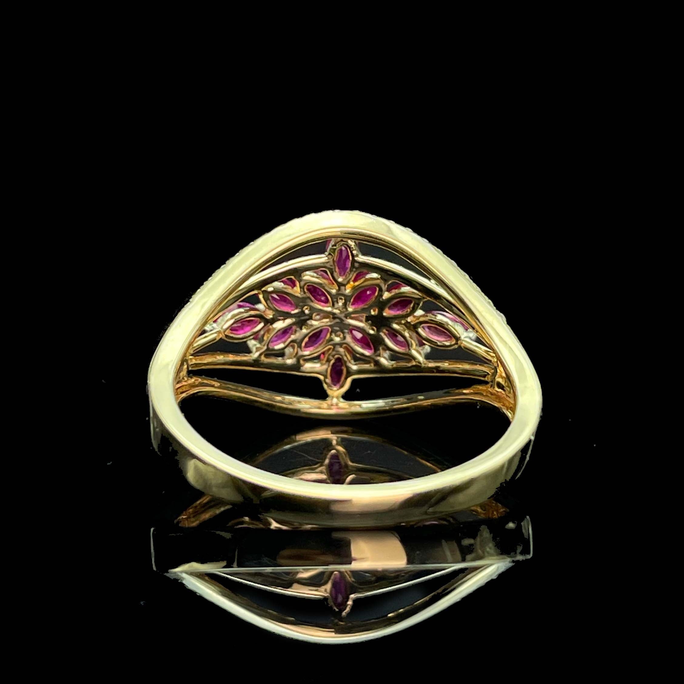 Ref:231023054 // Gold Content:14K Gold // Ring Size:7.25US // // Main Gemstone:Ruby // Shape:Marquise // Carat Weight:0.76ct // Color:Red // Treatment:Natural // // Adjacent Gemstone 2 : Diamond // Number of stones:48 // Shape:Round // Carat Weight:0.14ct // Clarity Grade:VS-SI // Color:H // Treatment:Natural // Cut Grade:G //