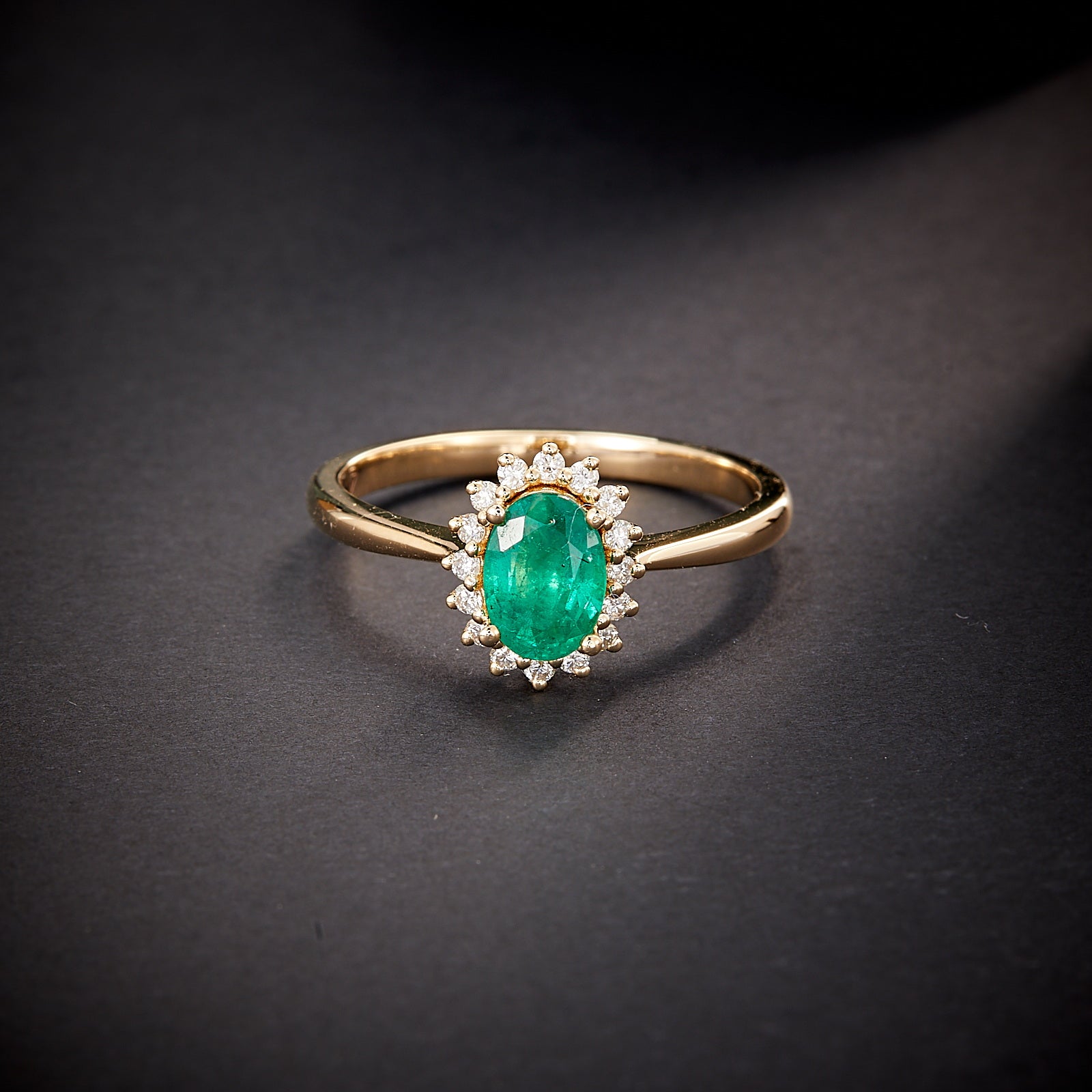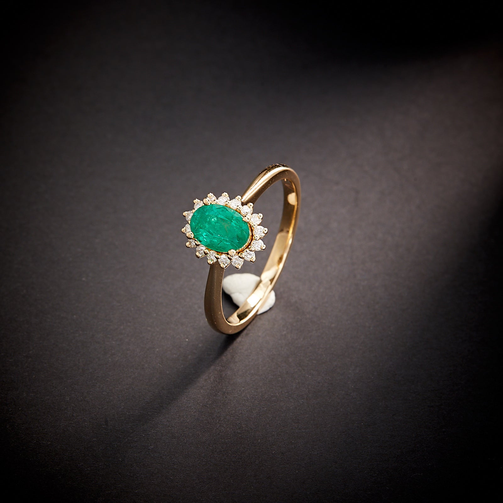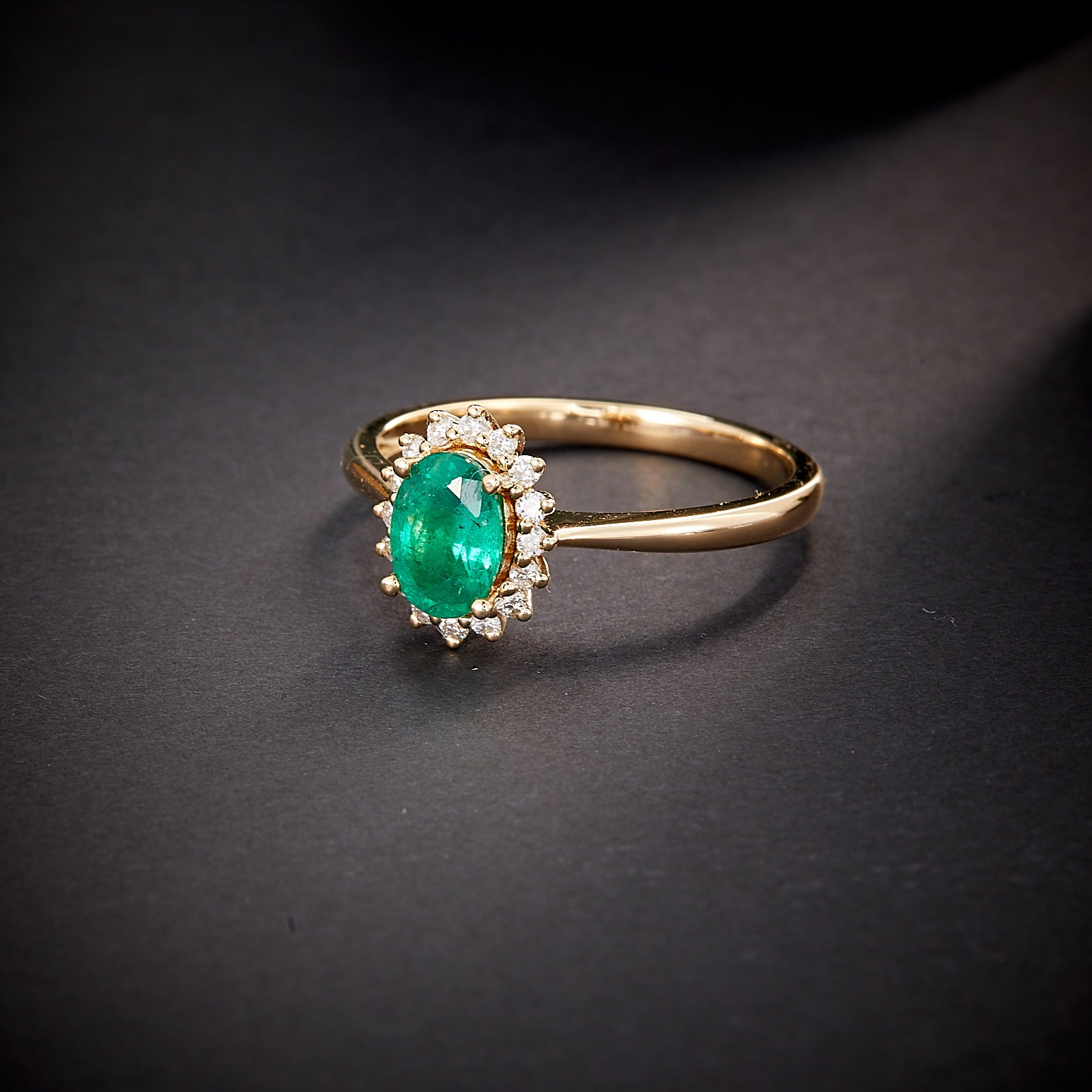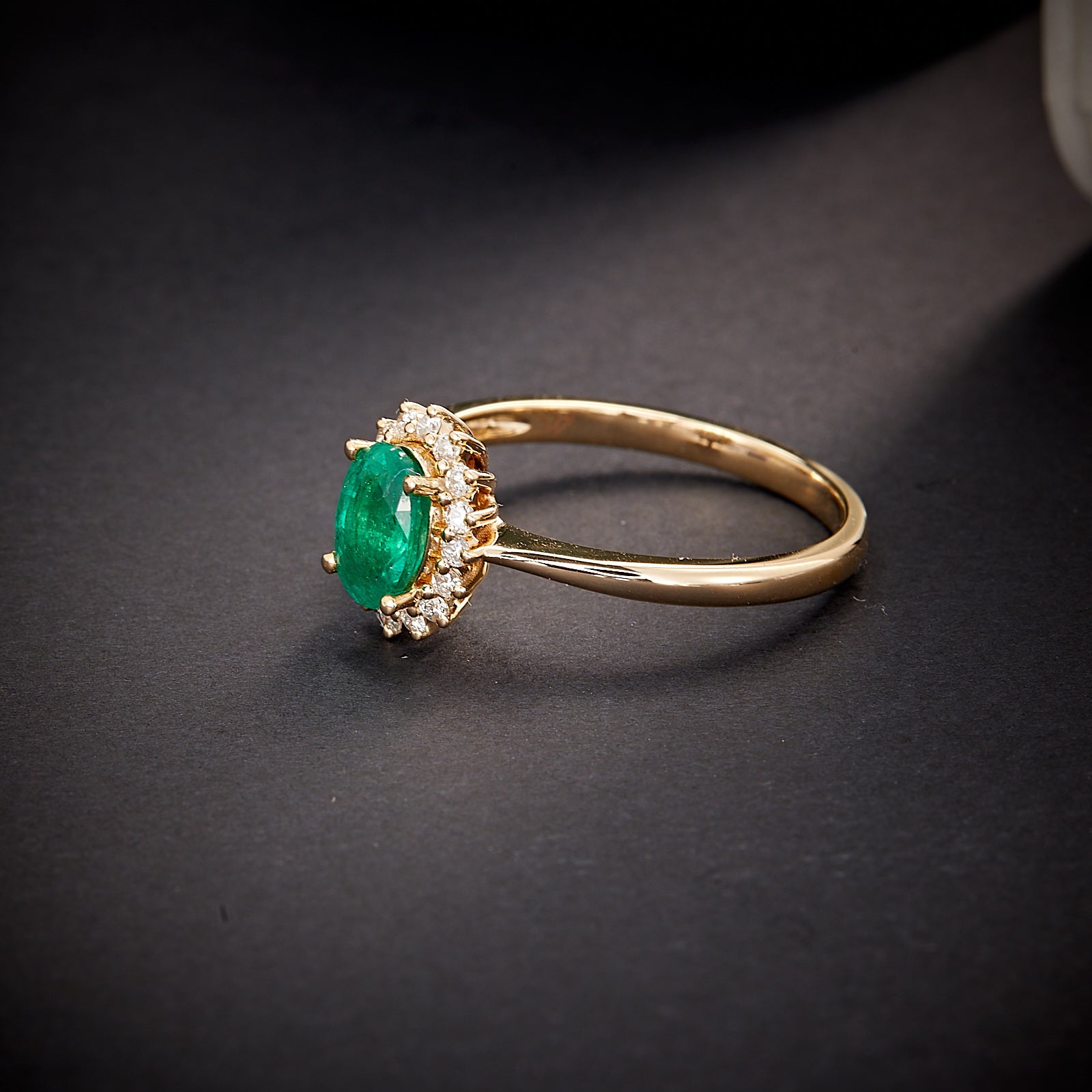 Ref:231027020 // Gold Content:14K Gold // Ring Size:7.25US // // Main Gemstone:Emerald // Shape:Oval // Carat Weight:0.8ct // Color:Green // Treatment:Natural // // Adjacent Gemstone 2 : Diamond // Number of stones:16 // Shape:Round // Carat Weight:0.16ct // Clarity Grade:VS-SI // Color:H // Treatment:Natural // Cut Grade:G //