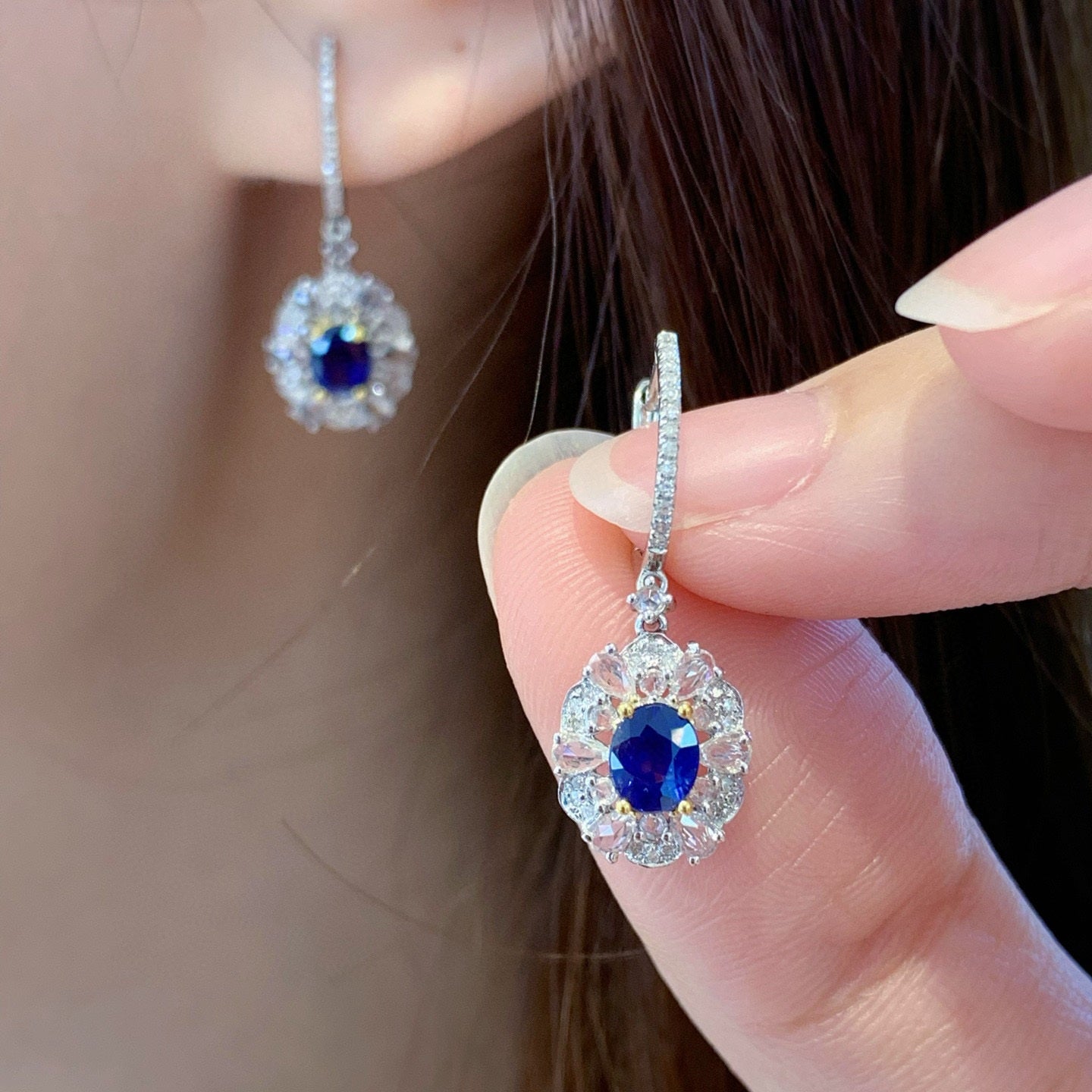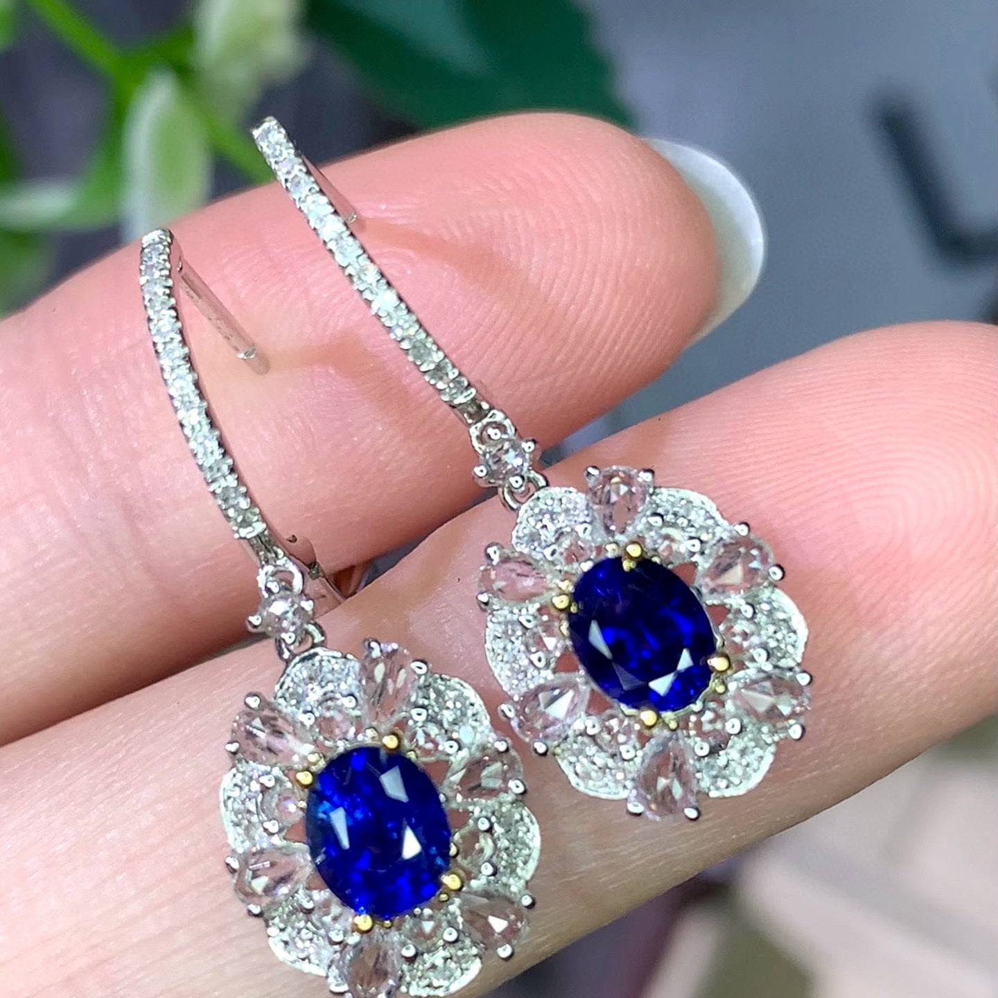 14K GOLD 1.05 CT NATURAL SAPPHIRE & DIAMOND & SAPPHIRE EARRINGS