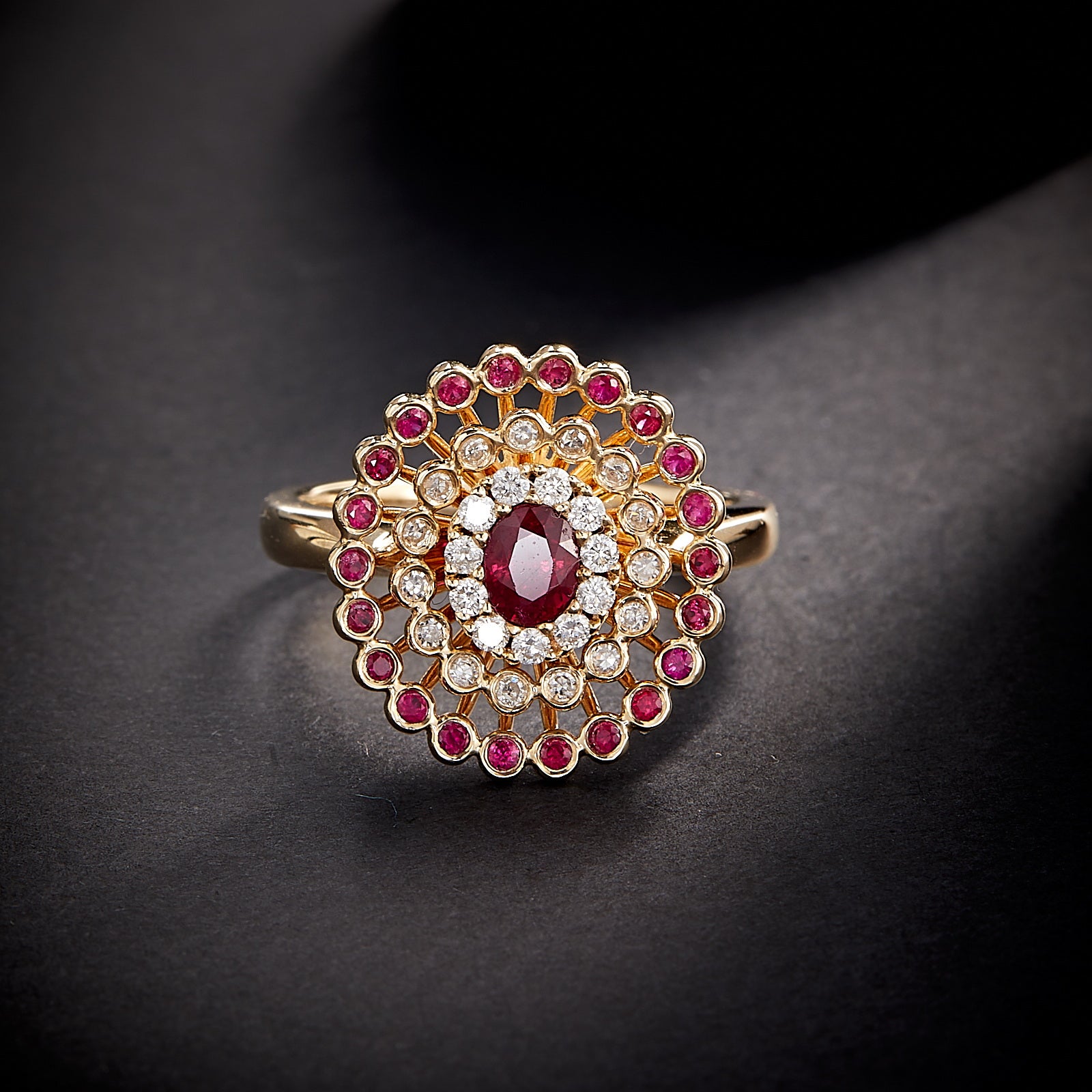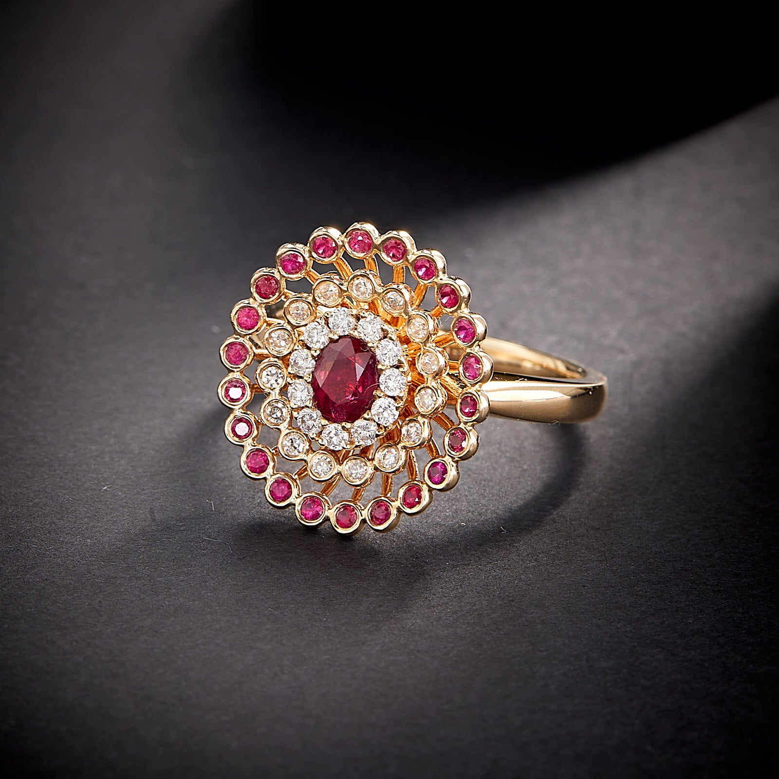 Ref:231027019 // Gold Content:14K Gold // Ring Size:7.25US // // Main Gemstone:Ruby // Shape:Multiply // Carat Weight:0.8ct // Color:Red // Treatment:Natural // // Adjacent Gemstone 2 : Diamond // Number of stones:25 // Shape:Round // Carat Weight:0.25ct // Clarity Grade:VS-SI // Color:H // Treatment:Natural // Cut Grade:G //