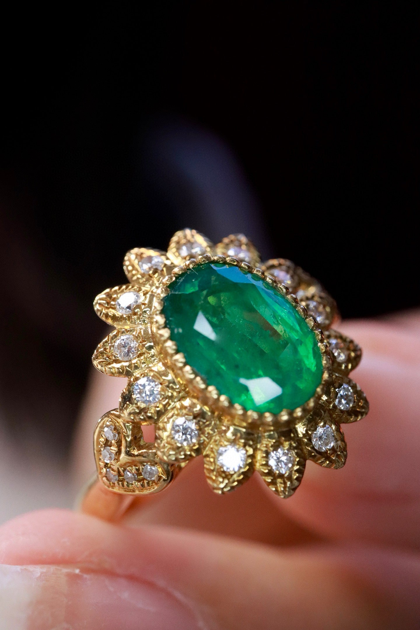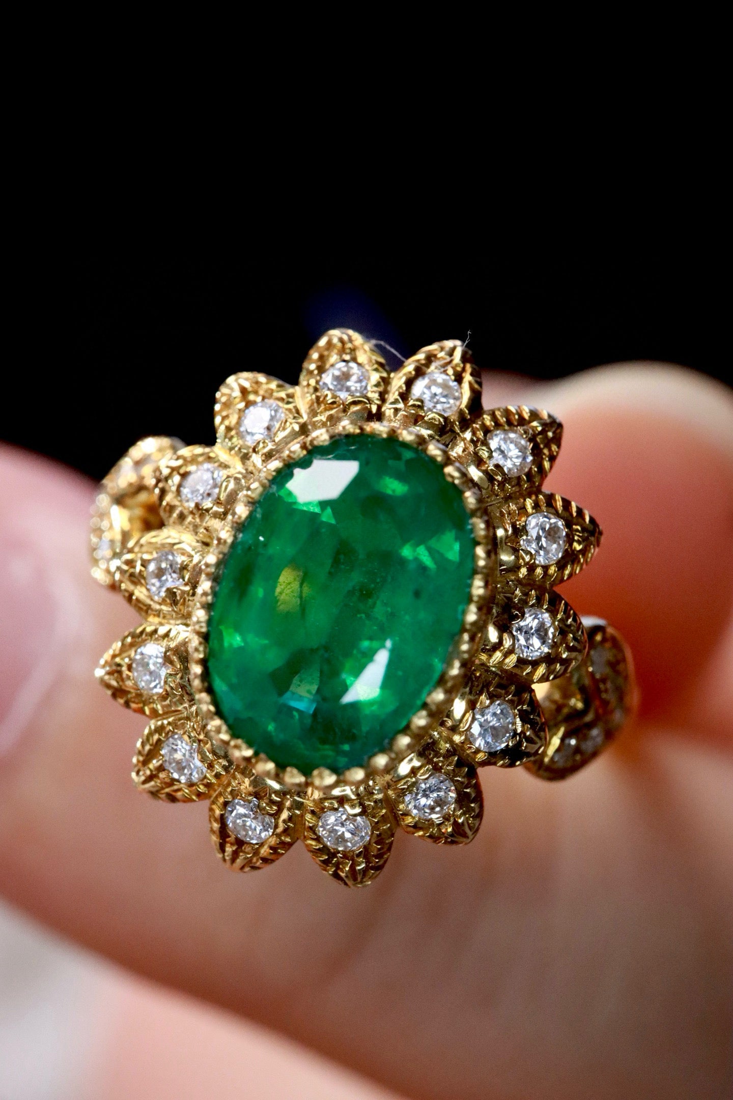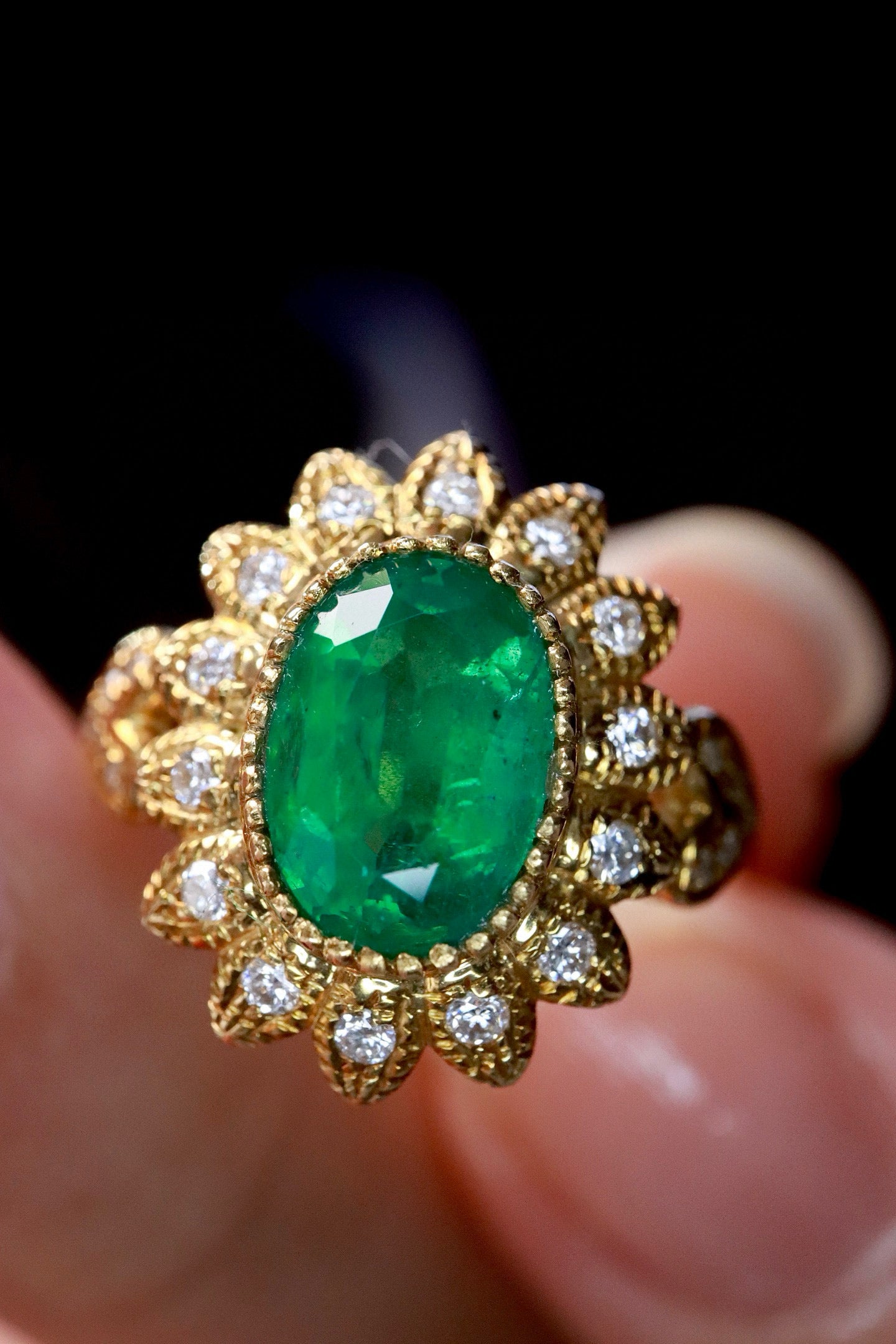 Ref:231027164 // Gold Content:14K Gold // Ring Size:7.25US // // Main Gemstone:Emerald // Shape:Oval // Carat Weight:1.07ct // Color:Vivid Green // Treatment:Natural // // Adjacent Gemstone 2 : Diamond // Number of stones:24 // Shape:Round // Clarity Grade:VS-SI // Color:H // Treatment:Natural // Cut Grade:G //