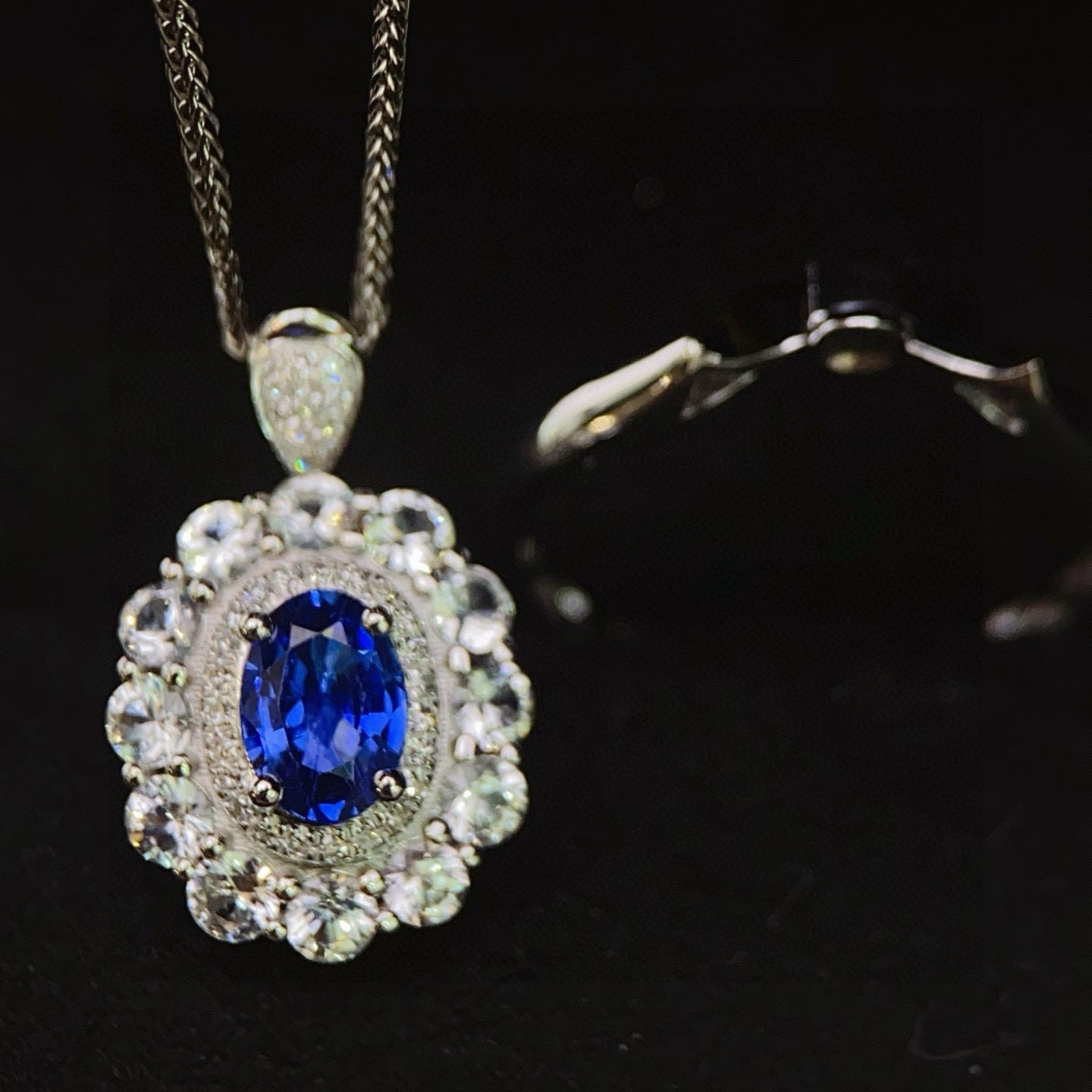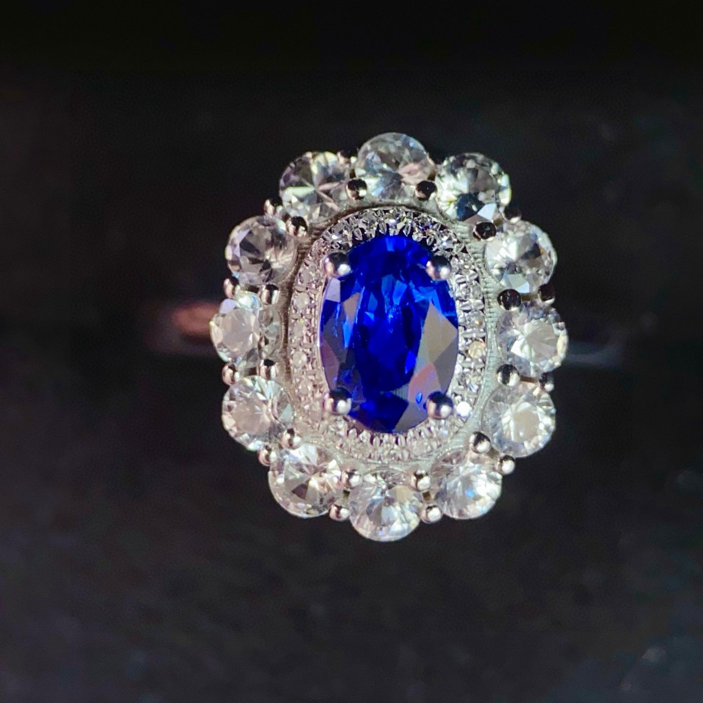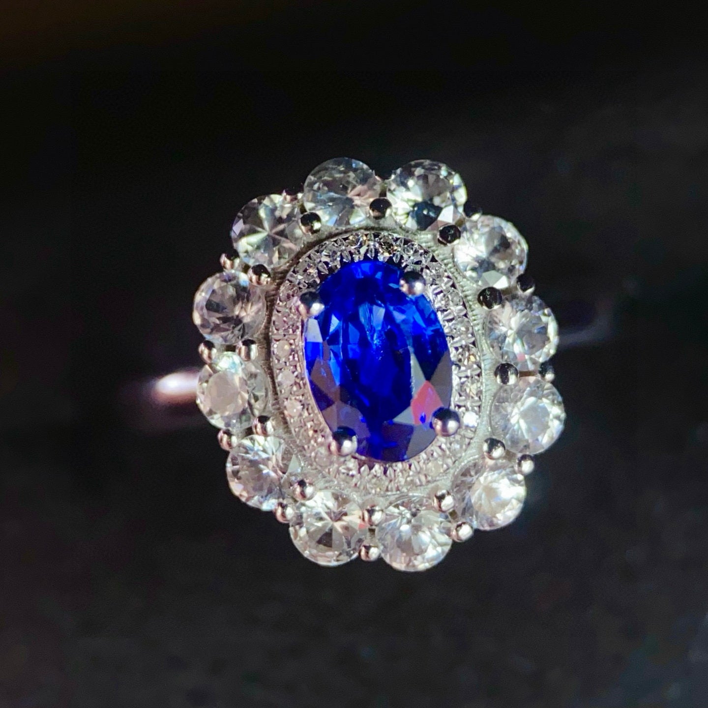 Ref:231021232 // Gold Content:14K Gold // Ring Size:7.25US // // Main Gemstone:Sapphire // Shape:Oval // Carat Weight:1.08ct // Color:Royal blue // Treatment:Natural // // Adjacent Gemstone 2 : Diamond // Number of stones:32 // Shape:Round // Clarity Grade:VS-SI // Color:H // Treatment:Natural // Cut Grade:G // // Adjacent Gemstone 3 : Sapphire // Number of stones:12 // Shape:Round // Color:White // Treatment:Natural // Cut Grade:G //