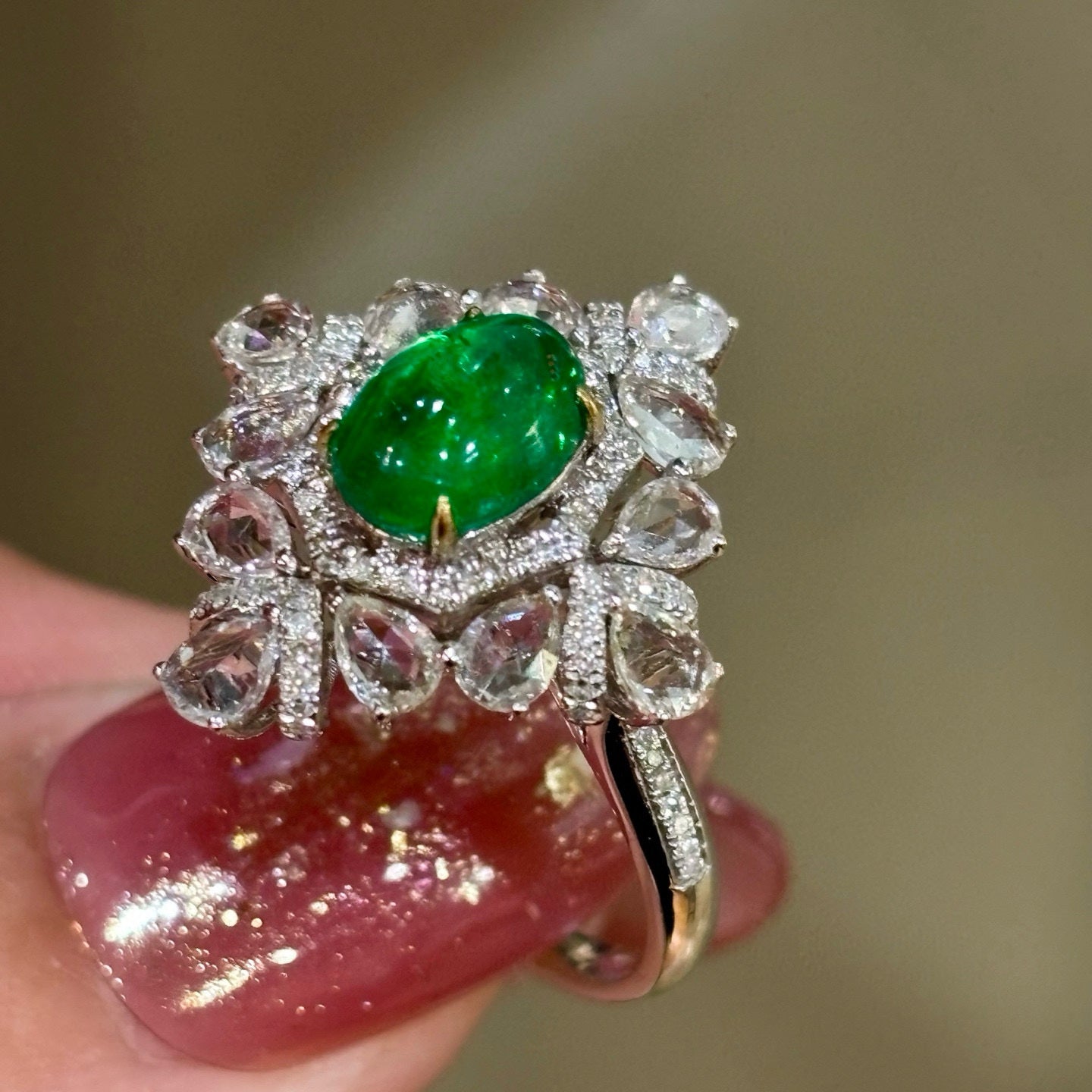14K GOLD 1.16 CT VIVID GREEN NATURAL EMERALD & DIAMOND & SAPPHIRE RING
