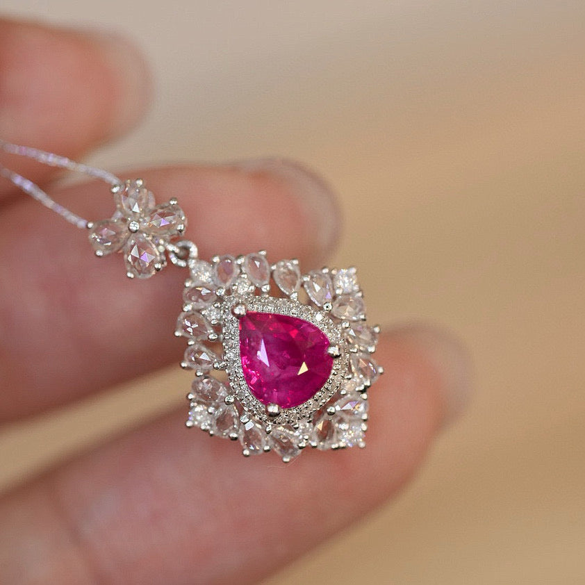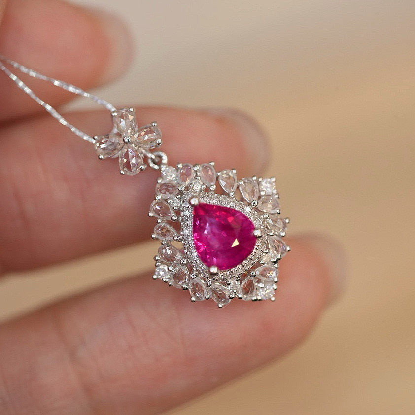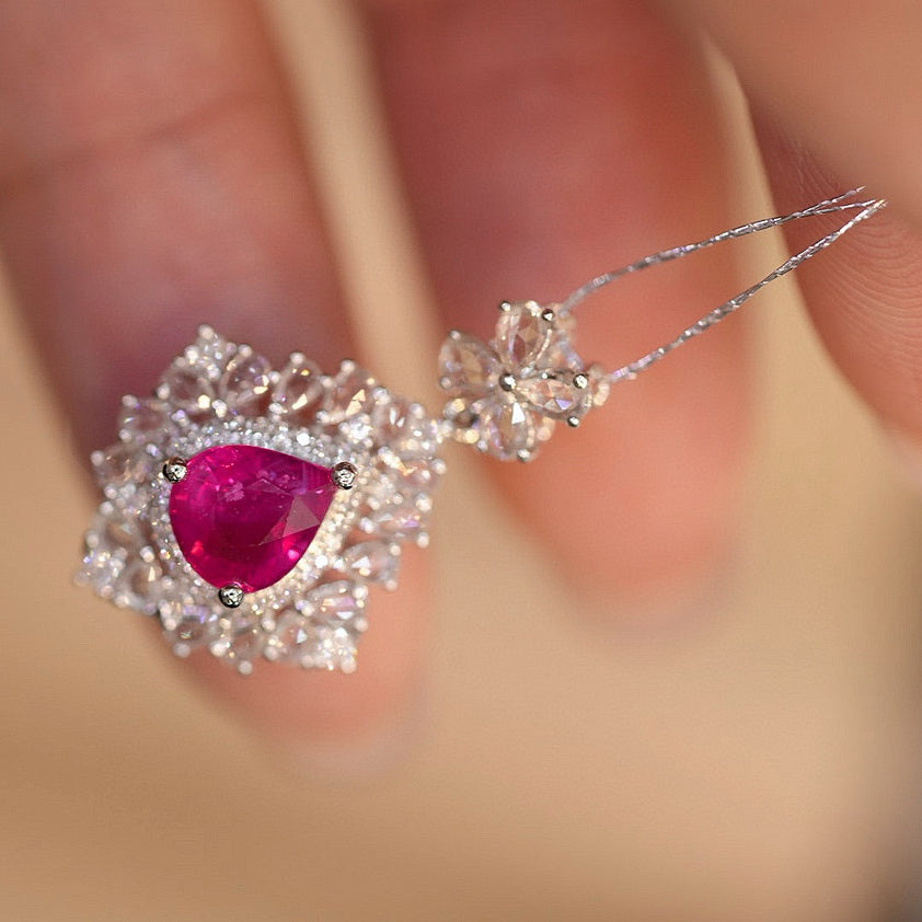 Ref:231023193 // Gold Content:14K Gold // Main Gemstone:Ruby // Shape:Pear // Carat Weight:1.18ct // Color:Red // Treatment:Natural // // Adjacent Gemstone 2 : Diamond // Shape:Round // Clarity Grade:VS-SI // Color:H // Treatment:Natural // Cut Grade:G // // Adjacent Gemstone 3 : Sapphire // Shape:Pear // Color:White // Treatment:Natural //