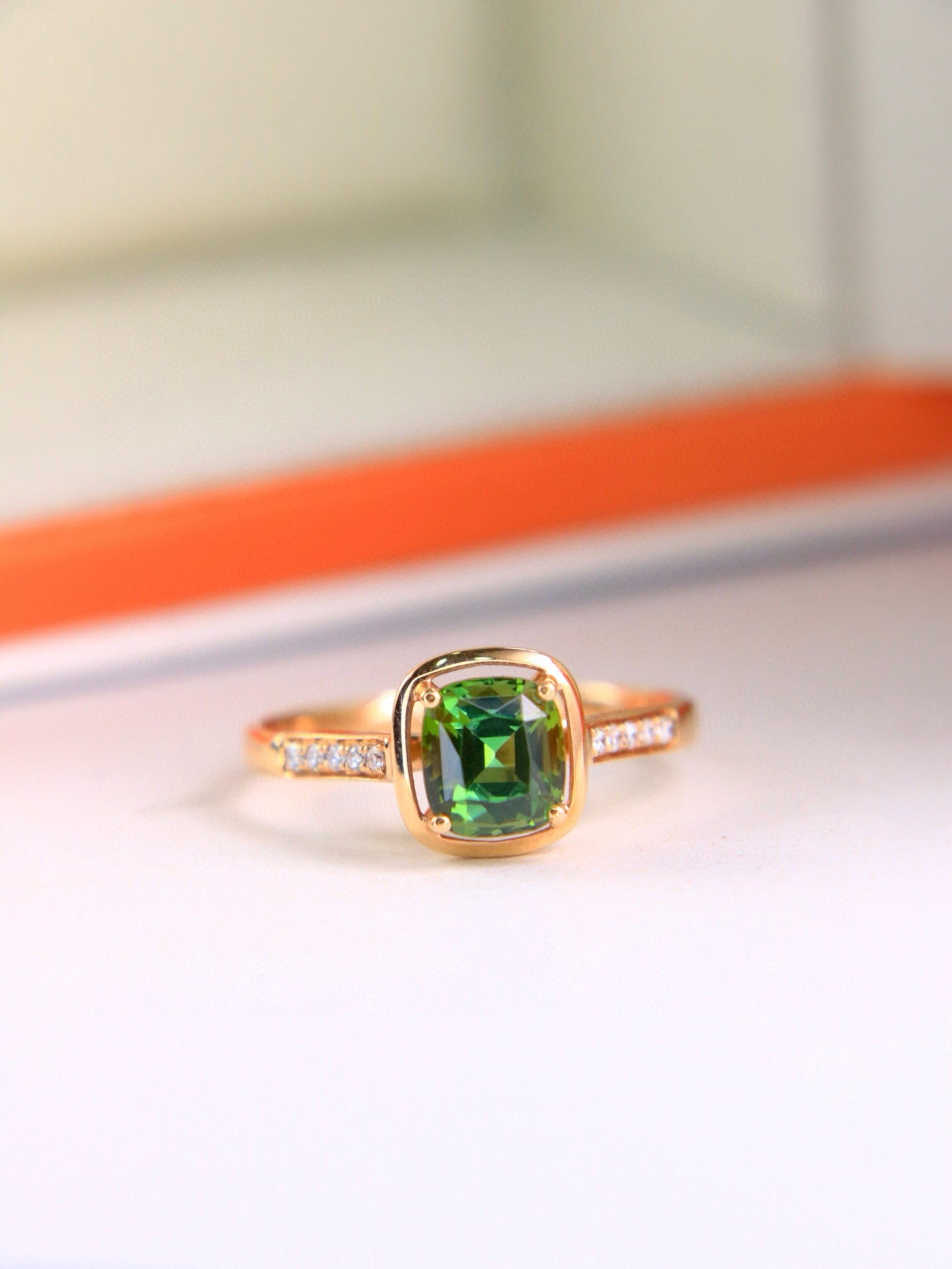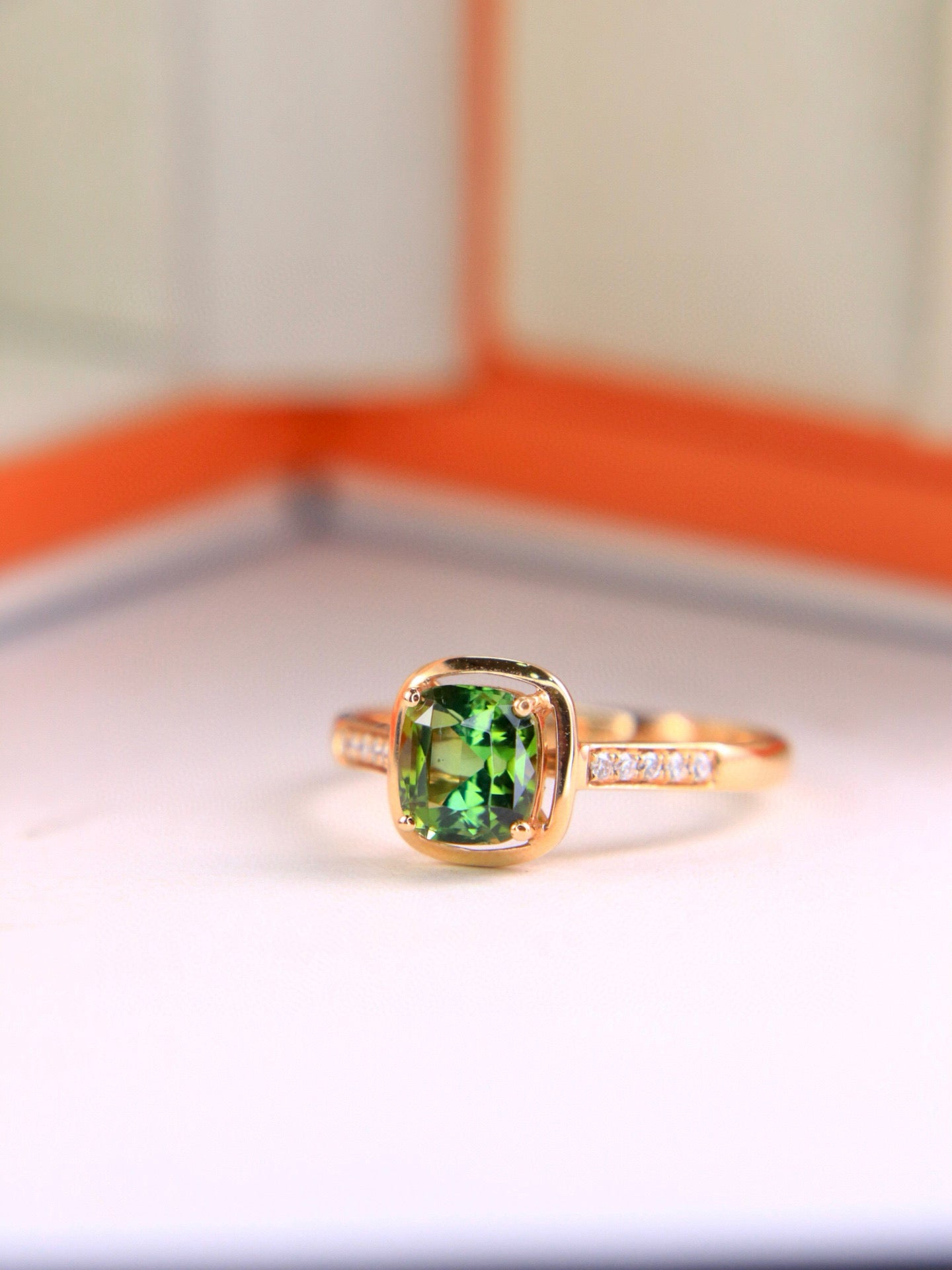 Ref:231025237 // Gold Content:14K Gold // Ring Size:7.25US // // Main Gemstone:Tourmaline // Shape:Cushion // Carat Weight:1.13ct // Color:Green // Treatment:Natural // // Adjacent Gemstone 2 : Diamond // Shape:Round // Carat Weight:0.05ct // Clarity Grade:VS-SI // Color:H // Treatment:Natural // Cut Grade:G //