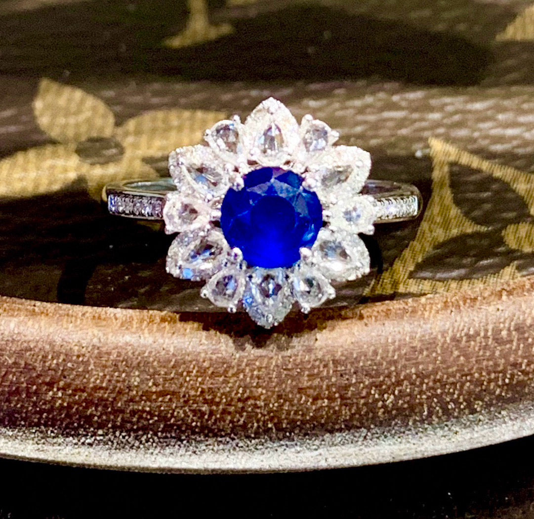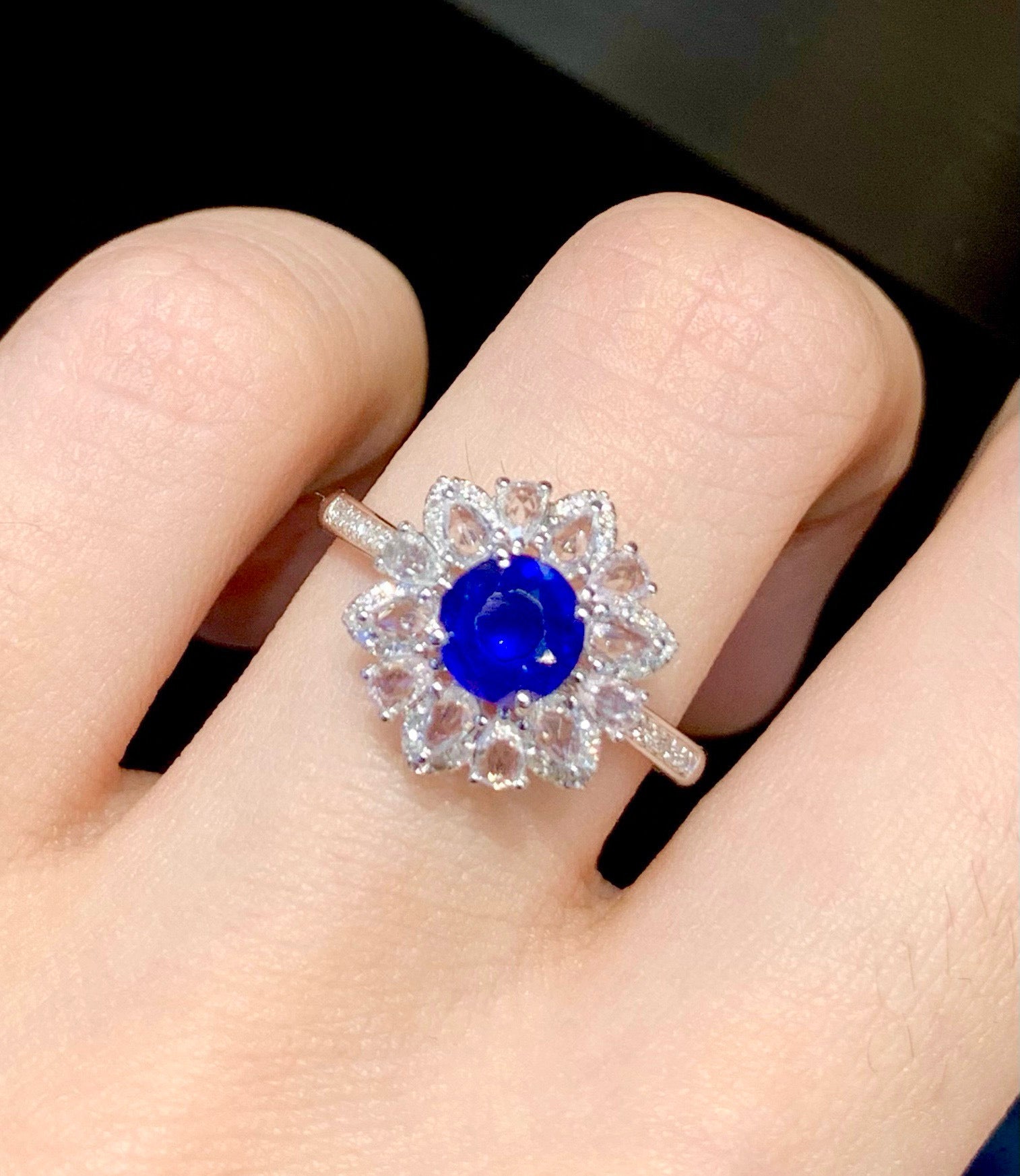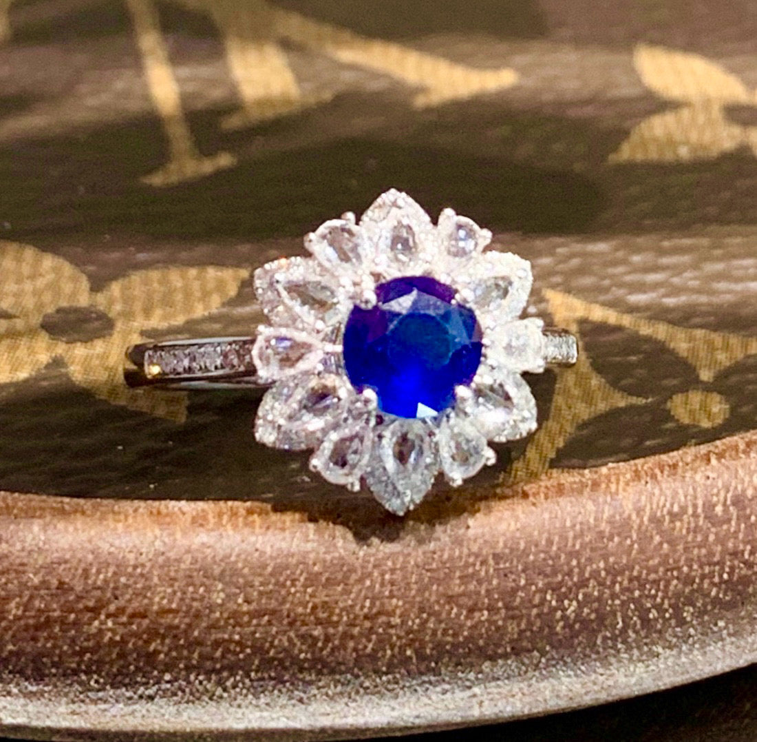 Ref:231027231 // Gold Content:14K Gold // Ring Size:7.25US // // Main Gemstone:Sapphire // Shape:Round // Carat Weight:1.2ct // Color:Royal blue // Treatment:Natural // Cut Grade:G // // Adjacent Gemstone 2 : Diamond // Shape:Round // Clarity Grade:VS-SI // Color:H // Treatment:Natural // Cut Grade:G // // Adjacent Gemstone 3 : Sapphire // Shape:Pear // Color:White // Treatment:Natural //