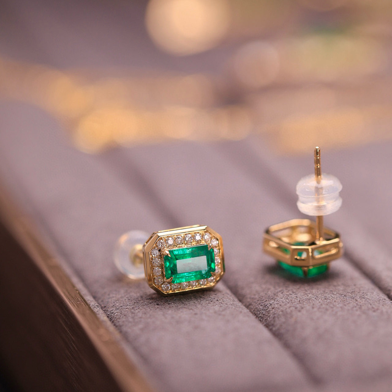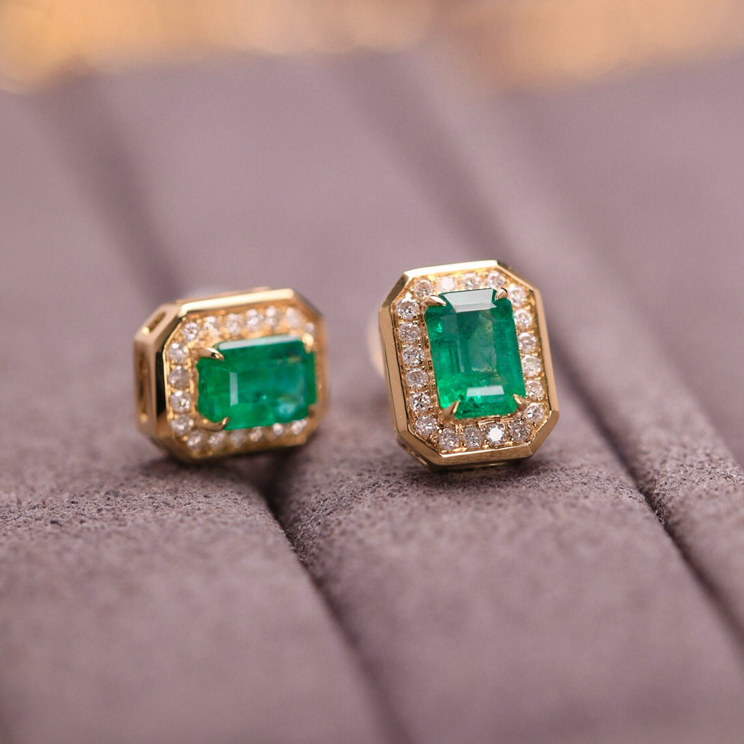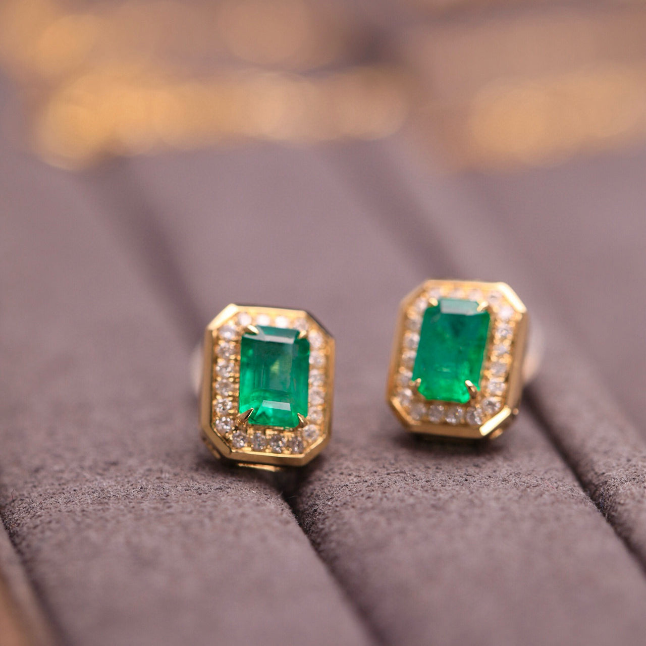 14K GOLD 1.20 CT VIVID GREEN NATURAL EMERALD & DIAMOND EARRINGS