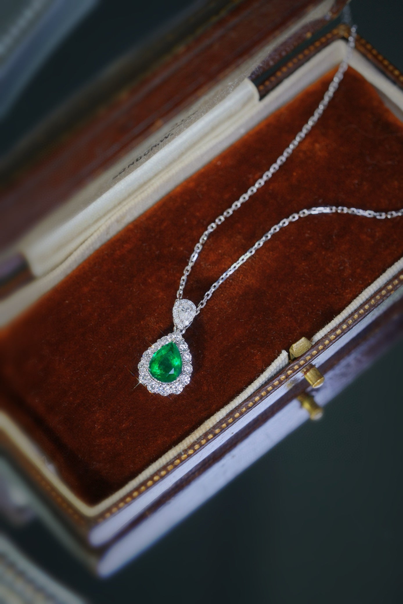 Ref:231025226 // Gold Content:14K Gold // Main Gemstone:Emerald // Shape:Pear // Carat Weight:0.77ct // Color:Vivid Green // Treatment:Natural // // Adjacent Gemstone 2 : Diamond // Shape:Multiply // Carat Weight:0.43ct // Clarity Grade:VS-SI // Color:H // Treatment:Natural //