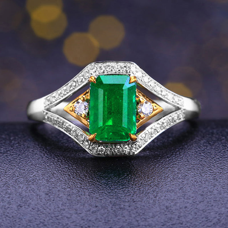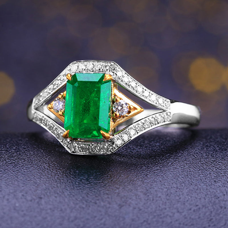 Ref:231021003 // Gold Content:14K Gold // Ring Size:7.25US // // Main Gemstone:Emerald // Shape:Octagonal // Carat Weight:1.24ct // Color:Vivid Green // Treatment:Natural // // Adjacent Gemstone 2 : Diamond // Shape:Round // Clarity Grade:VS-SI // Color:H // Treatment:Natural // Cut Grade:G //