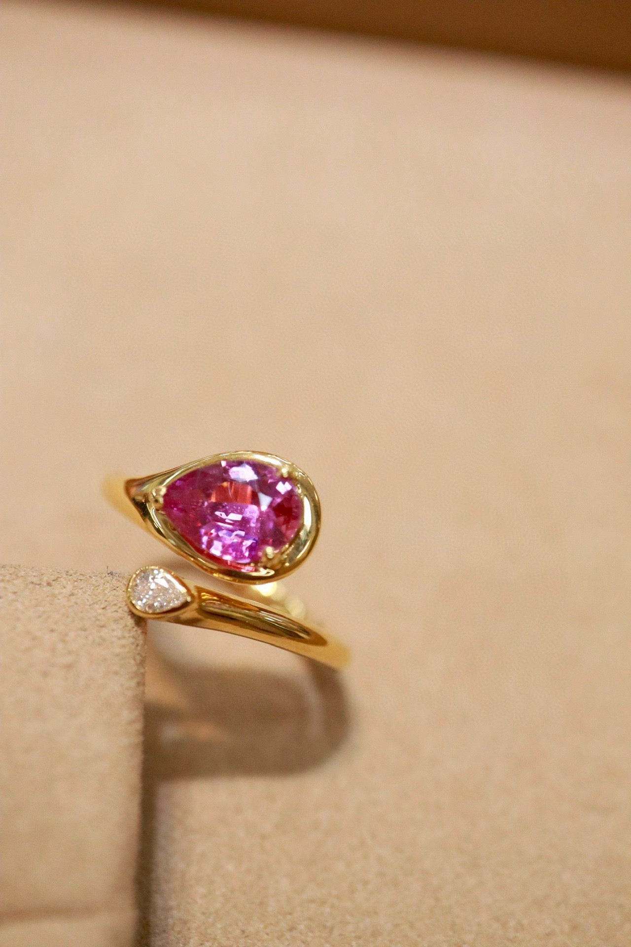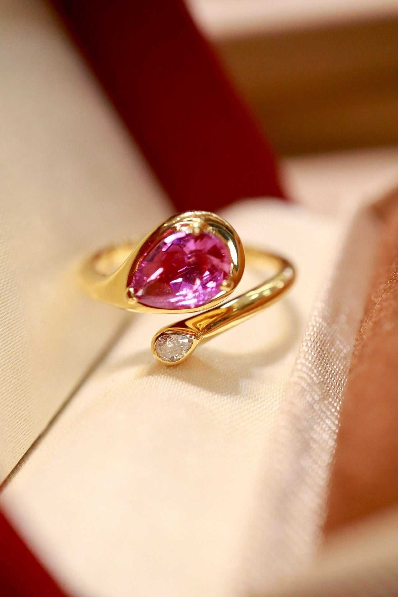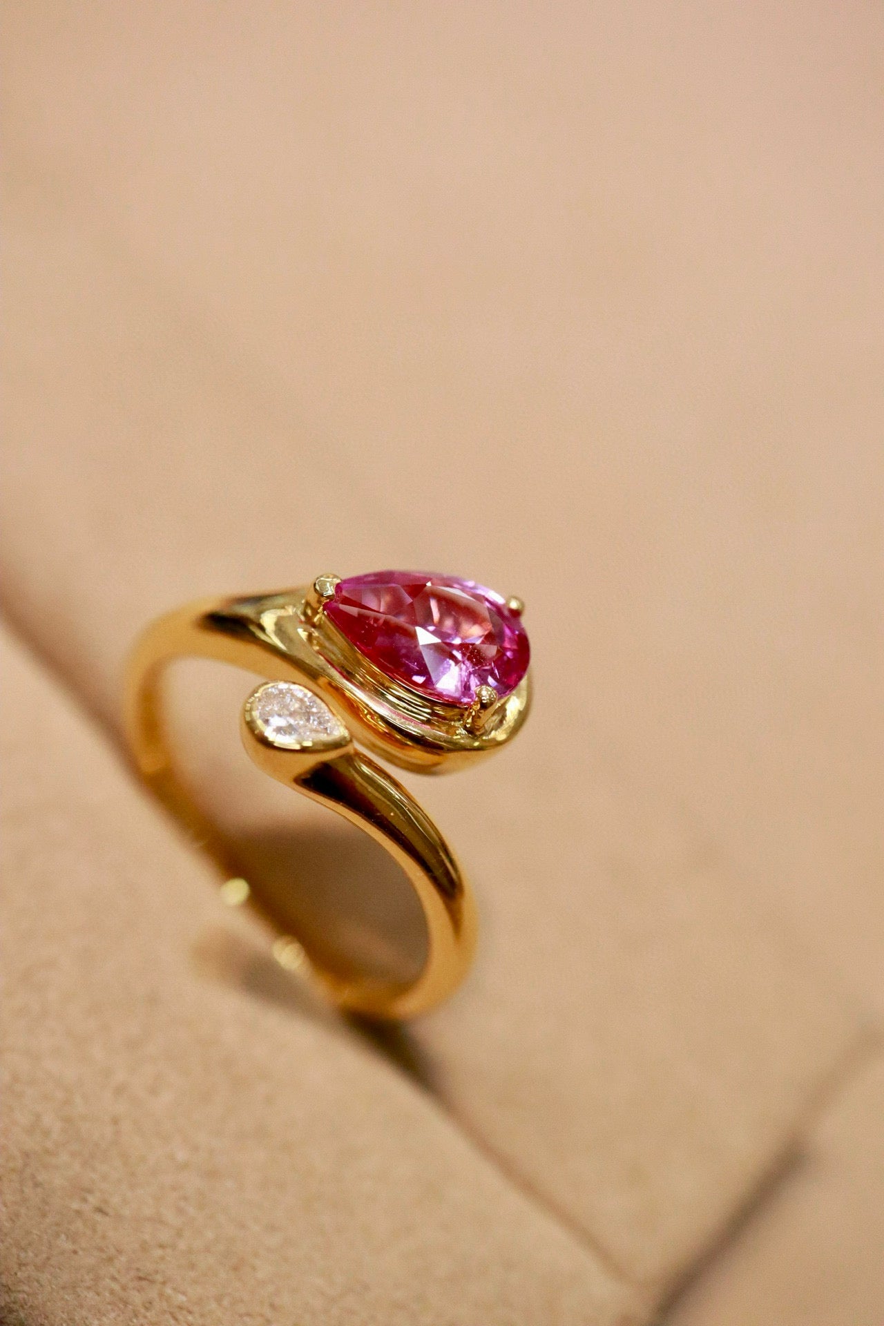 Ref:231025072 // Gold Content:14K Gold // Ring Size:7.25US // // Main Gemstone:Padparadscha Sapphire // Shape:Pear // Carat Weight:1.19ct // Color:Orangish Pink // Treatment:Natural // // Adjacent Gemstone 2 : Diamond // Shape:Pear // Carat Weight:0.07ct // Clarity Grade:VS-SI // Color:H // Treatment:Natural //