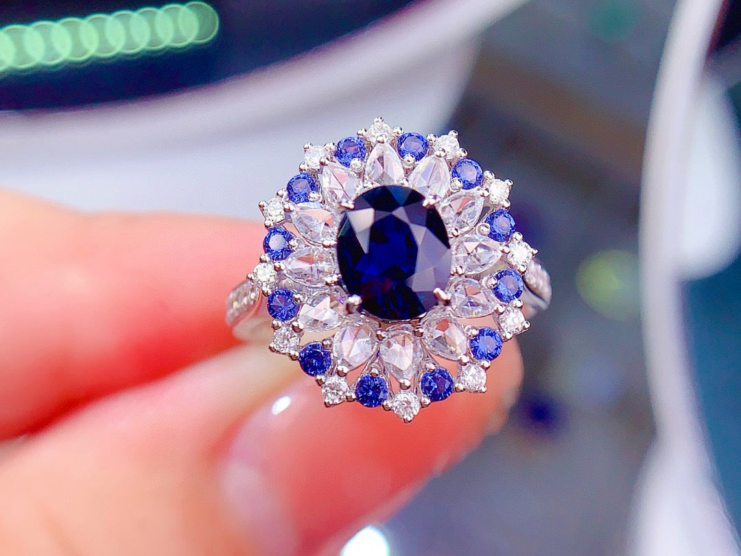 Ref:231019112 // Gold Content:14K Gold // Ring Size:7.25US // // Main Gemstone:Sapphire // Shape:Oval // Carat Weight:1.27ct // Color:Blue // Treatment:Natural // // Adjacent Gemstone 2 : Diamond // Number of stones:24 // Shape:Multiply // Clarity Grade:VS-SI // Color:H // Treatment:Natural // // Adjacent Gemstone 3 : Sapphire // Shape:Round // Color:Blue // Treatment:Natural // Cut Grade:G //