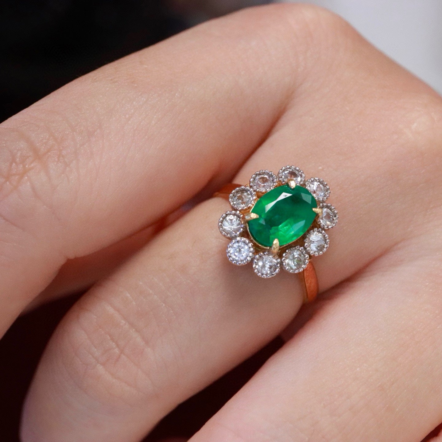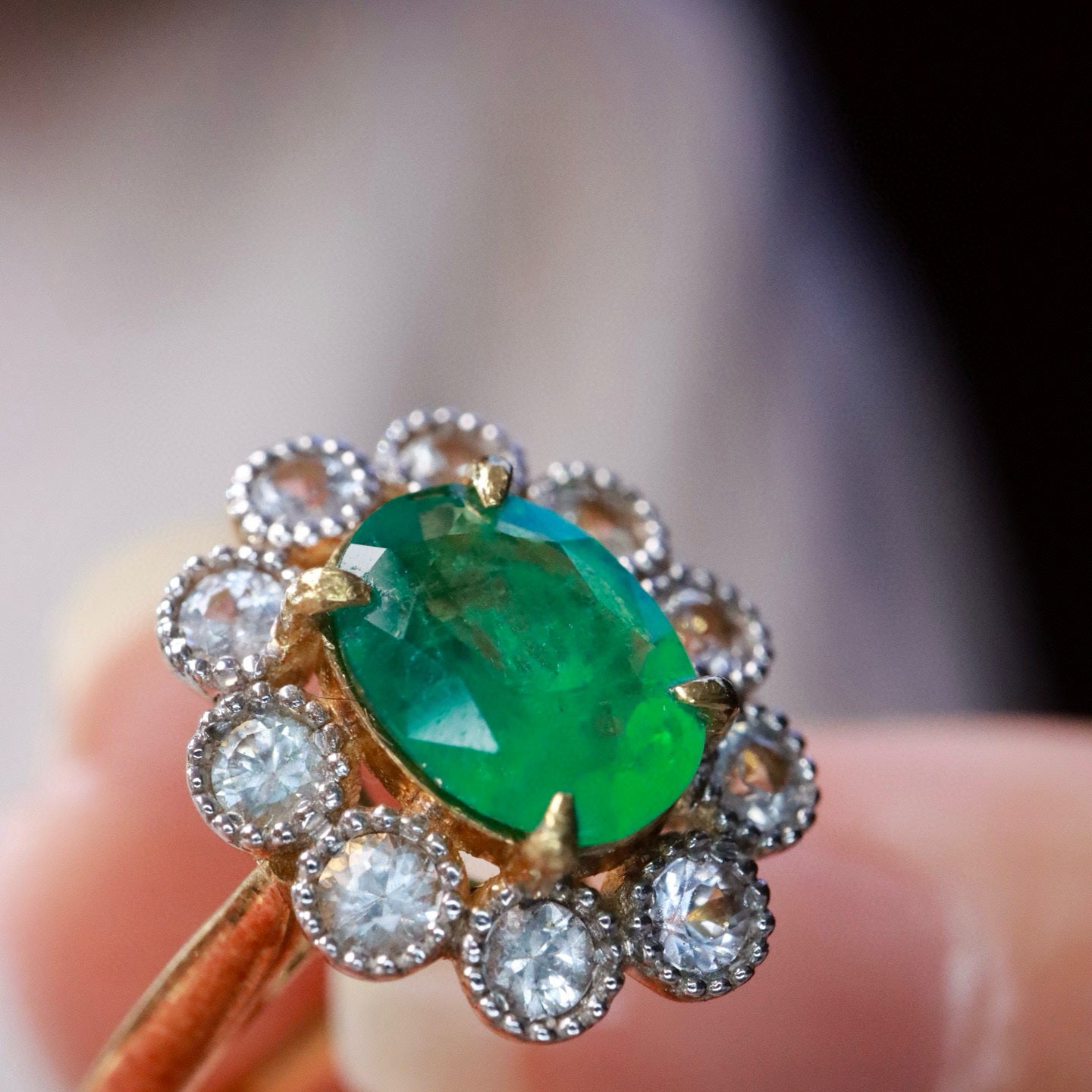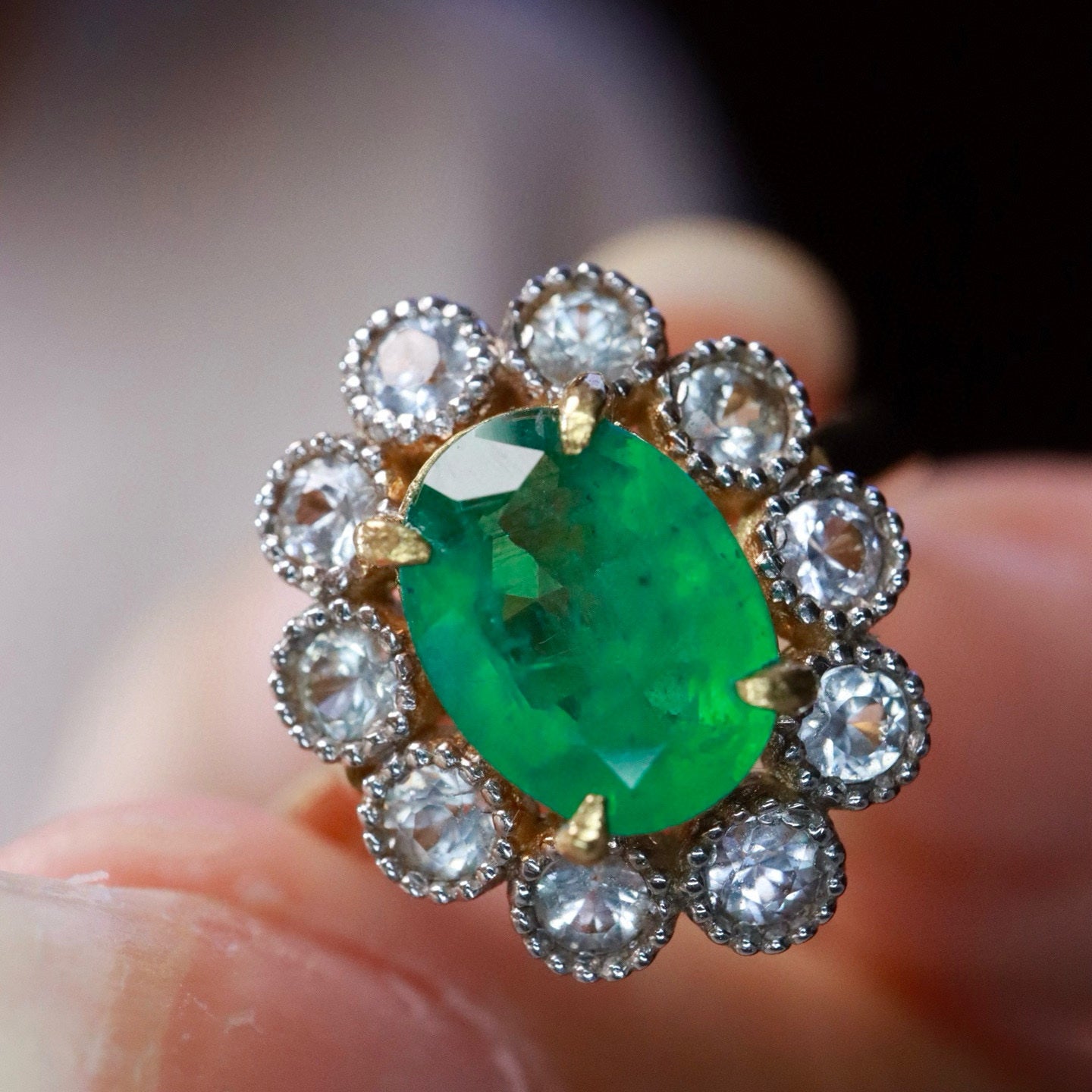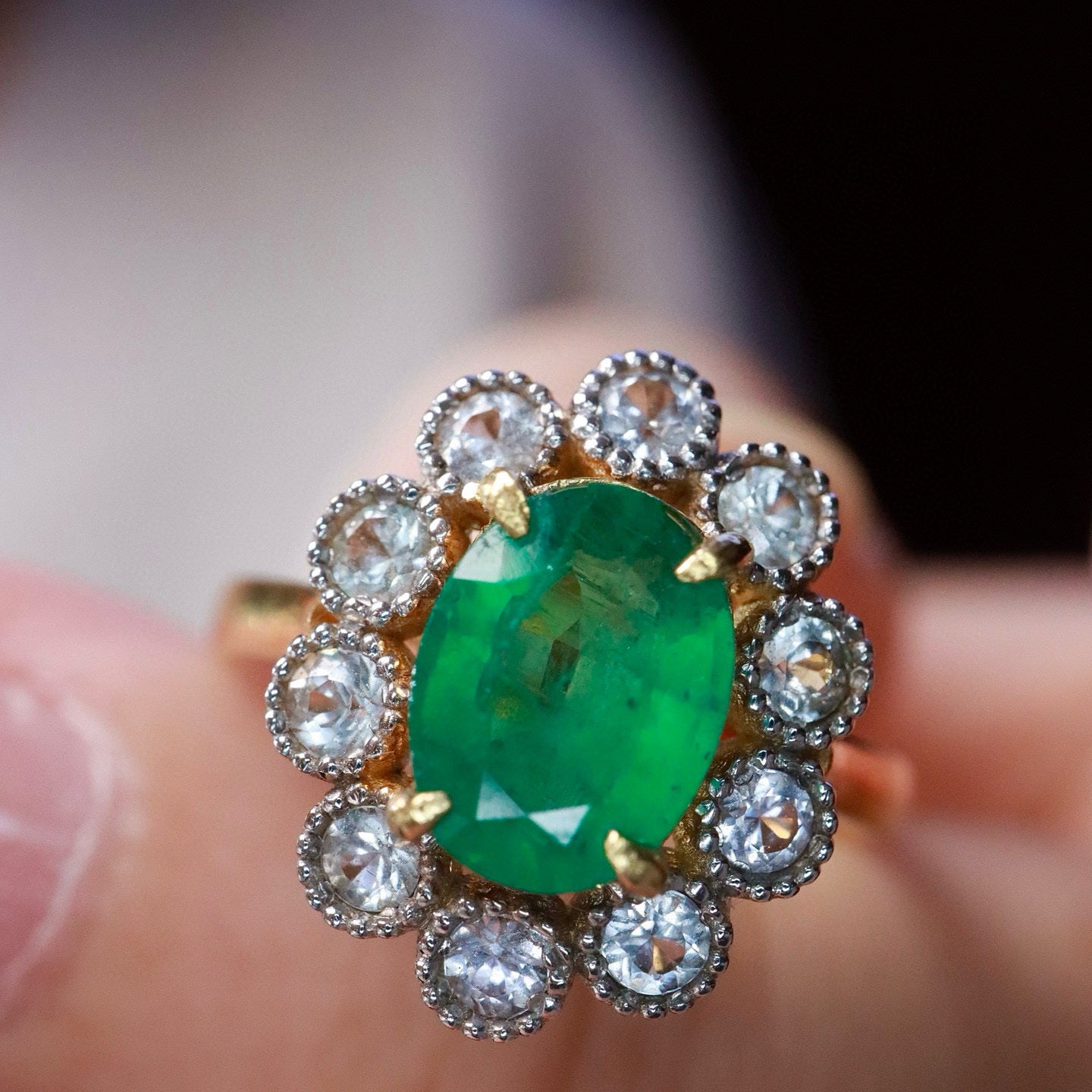 Ref:231027260 // Gold Content:14K Gold // Ring Size:7.25US // // Main Gemstone:Emerald // Shape:Oval // Carat Weight:1.28ct // Color:Green // Treatment:Natural // // Adjacent Gemstone 2 : Sapphire // Number of stones:10 // Shape:Round // Color:White // Treatment:Natural // Cut Grade:G //