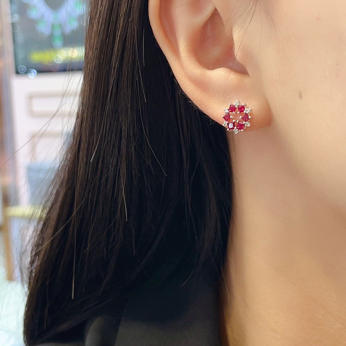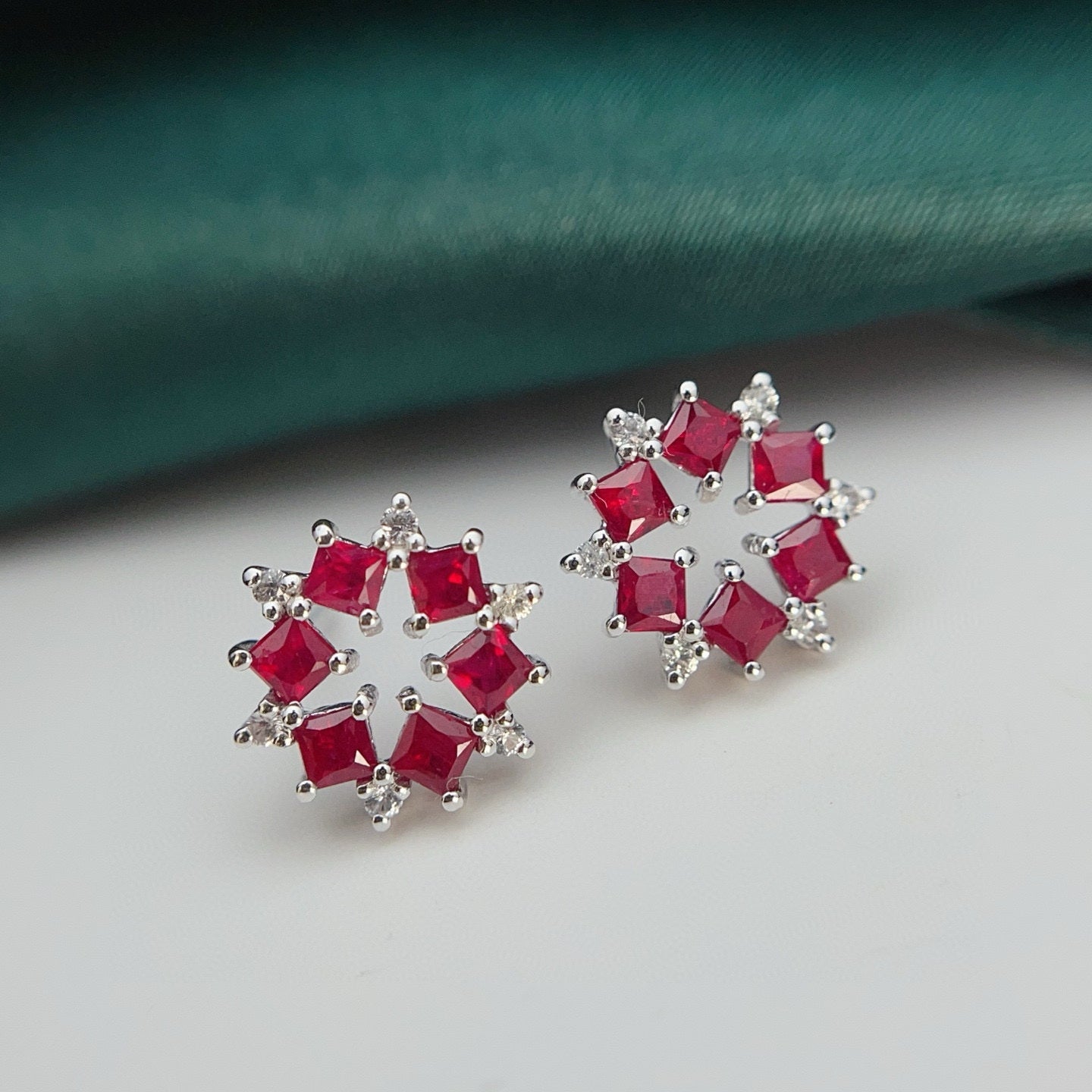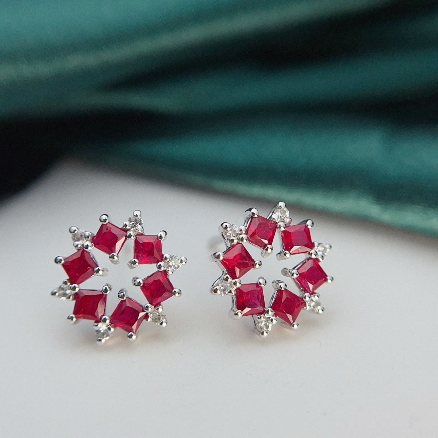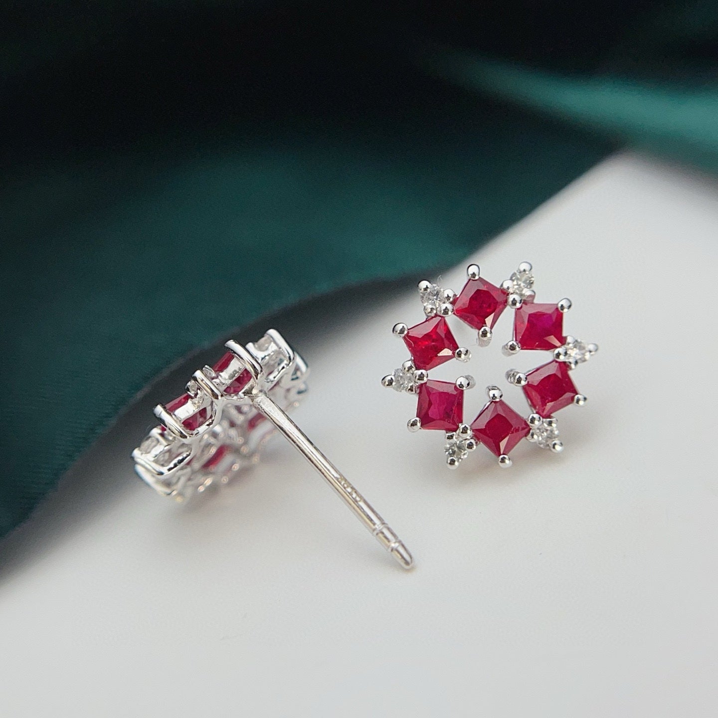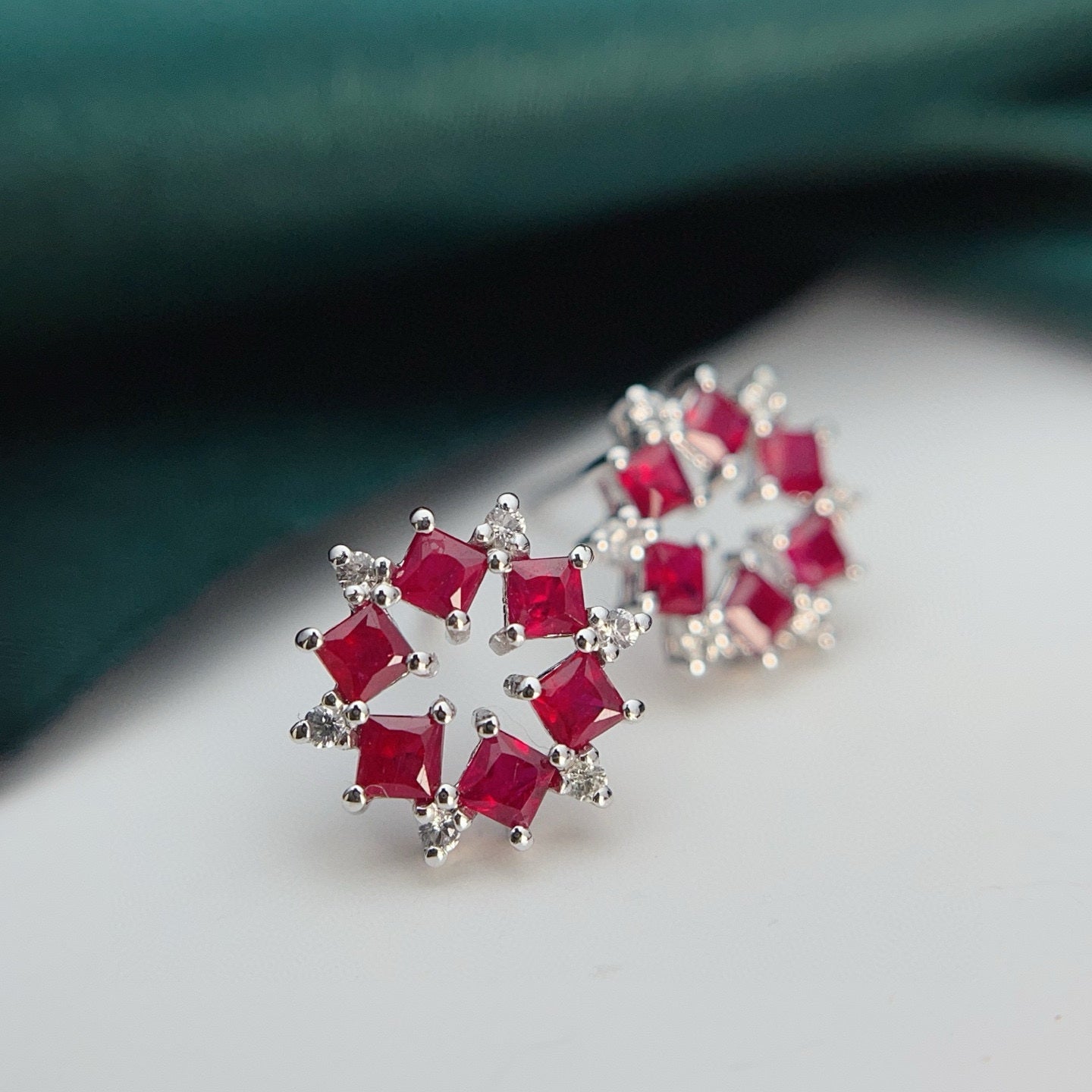 Ref:231019081 // Gold Content:14K Gold // Main Gemstone:Ruby // Shape:Princess // Carat Weight:1.35ct // Color:Red // Treatment:Natural // // Adjacent Gemstone 2 : Sapphire // Number of stones:12 // Shape:Round // Color:White // Treatment:Natural // Cut Grade:G //