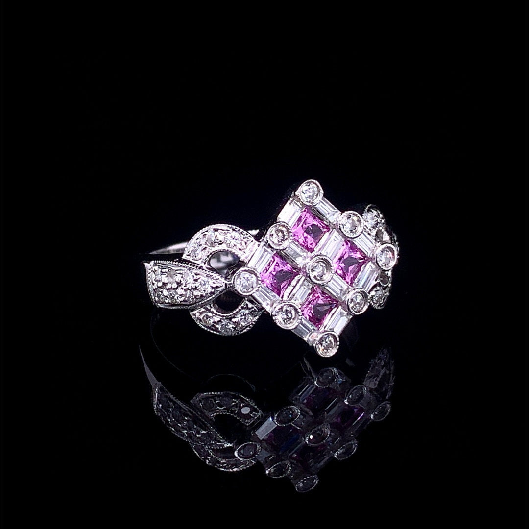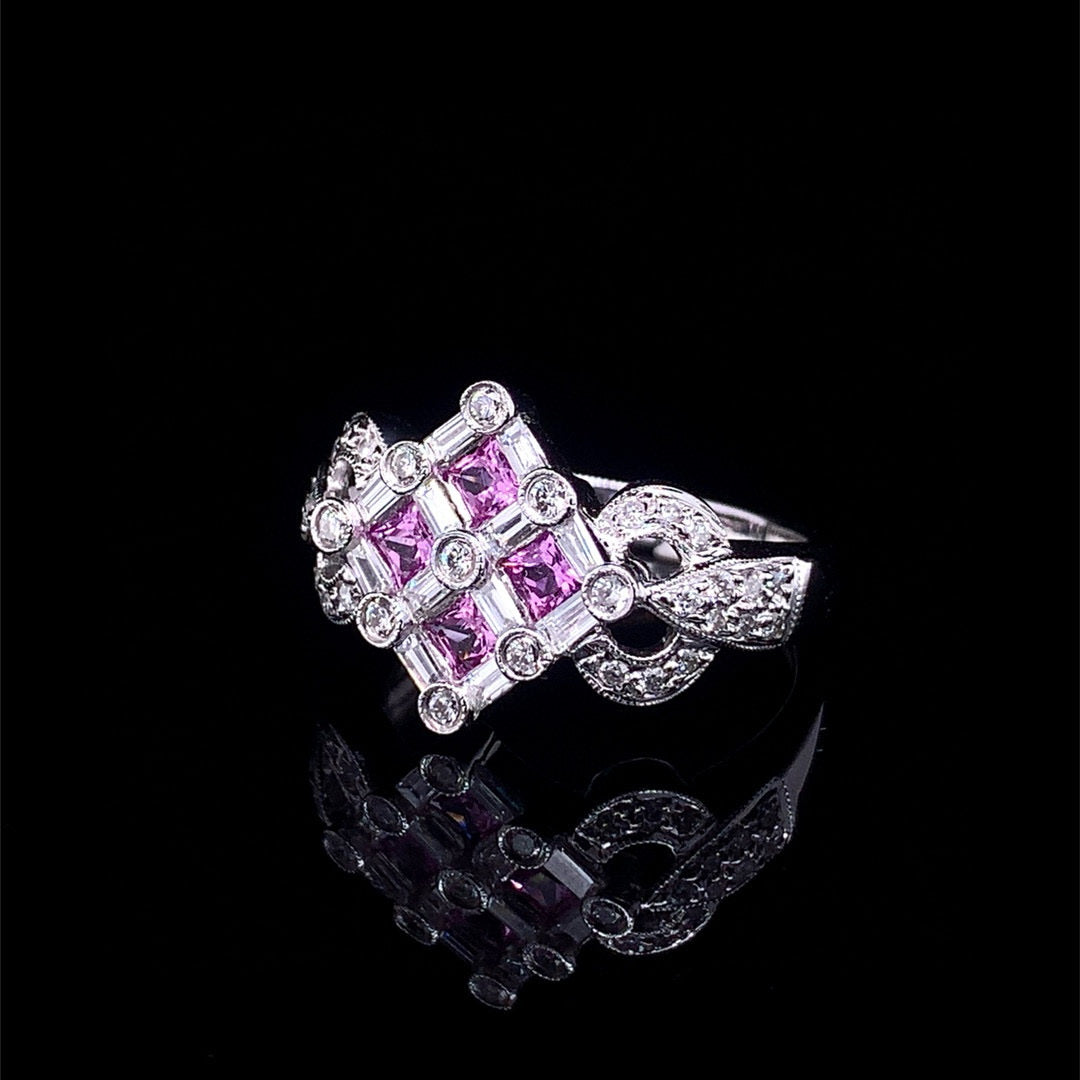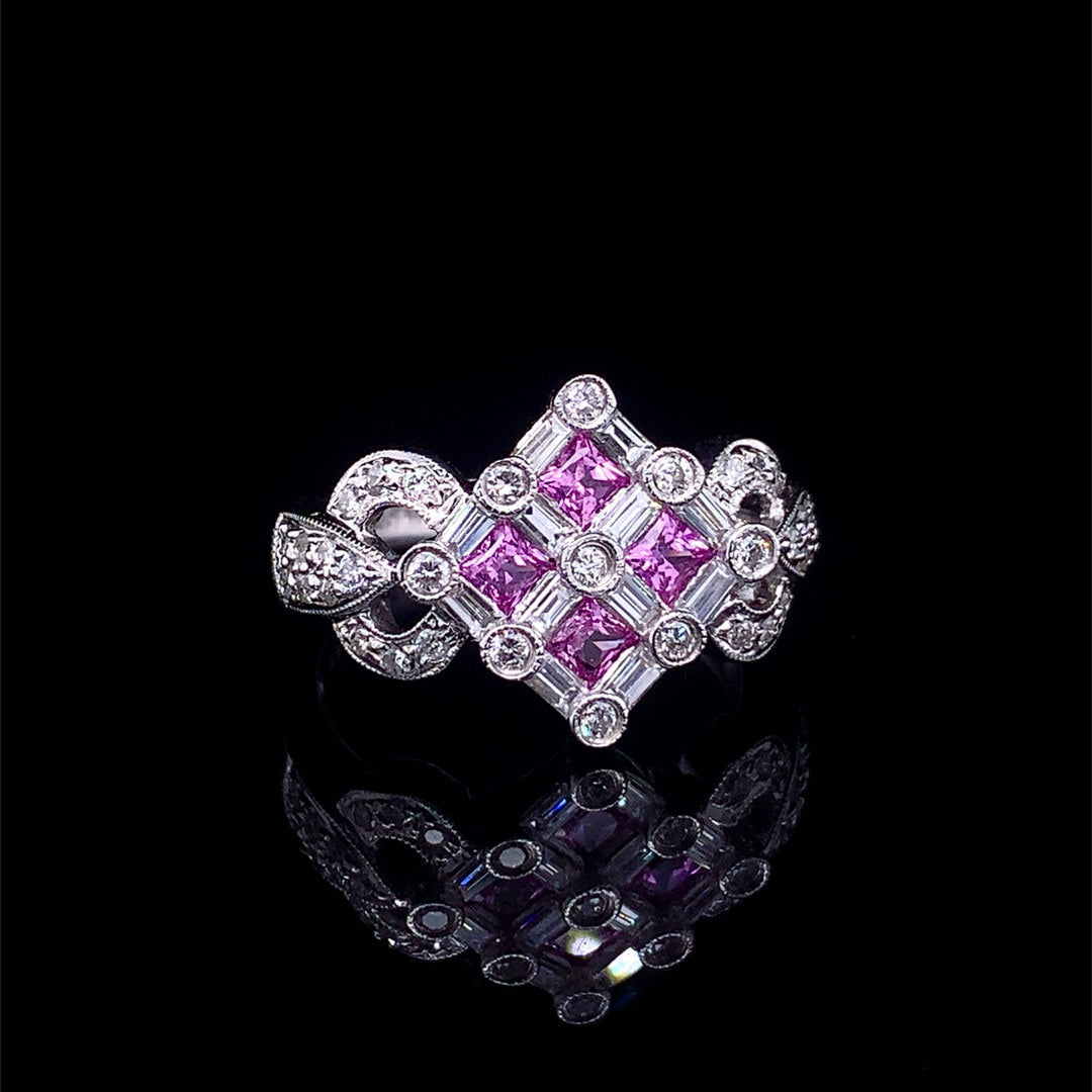 Ref:231021122 // Gold Content:14K Gold // Ring Size:7.25US // // Main Gemstone:Sapphire // Shape:Princess // Carat Weight:0.6ct // Color:Pink // Treatment:Natural // // Adjacent Gemstone 2 : Diamond // Shape:Multiply // Carat Weight:0.75ct // Clarity Grade:VS-SI // Color:H // Treatment:Natural //