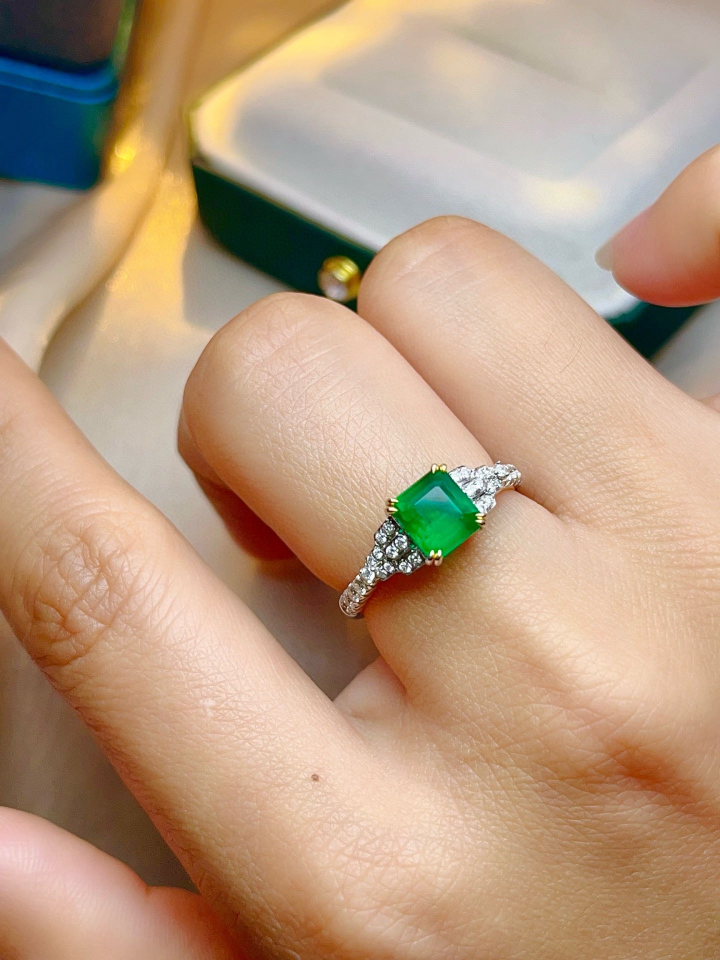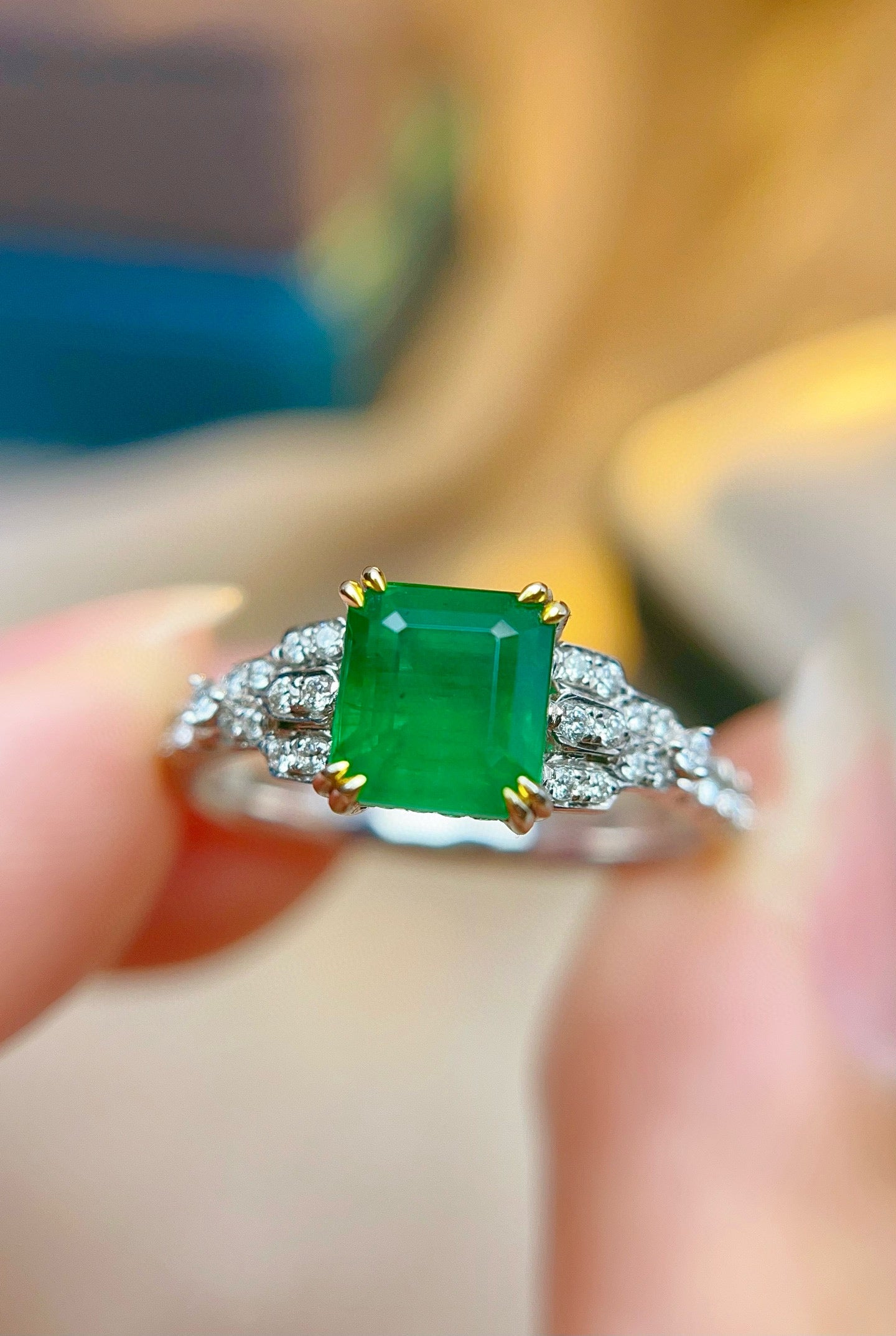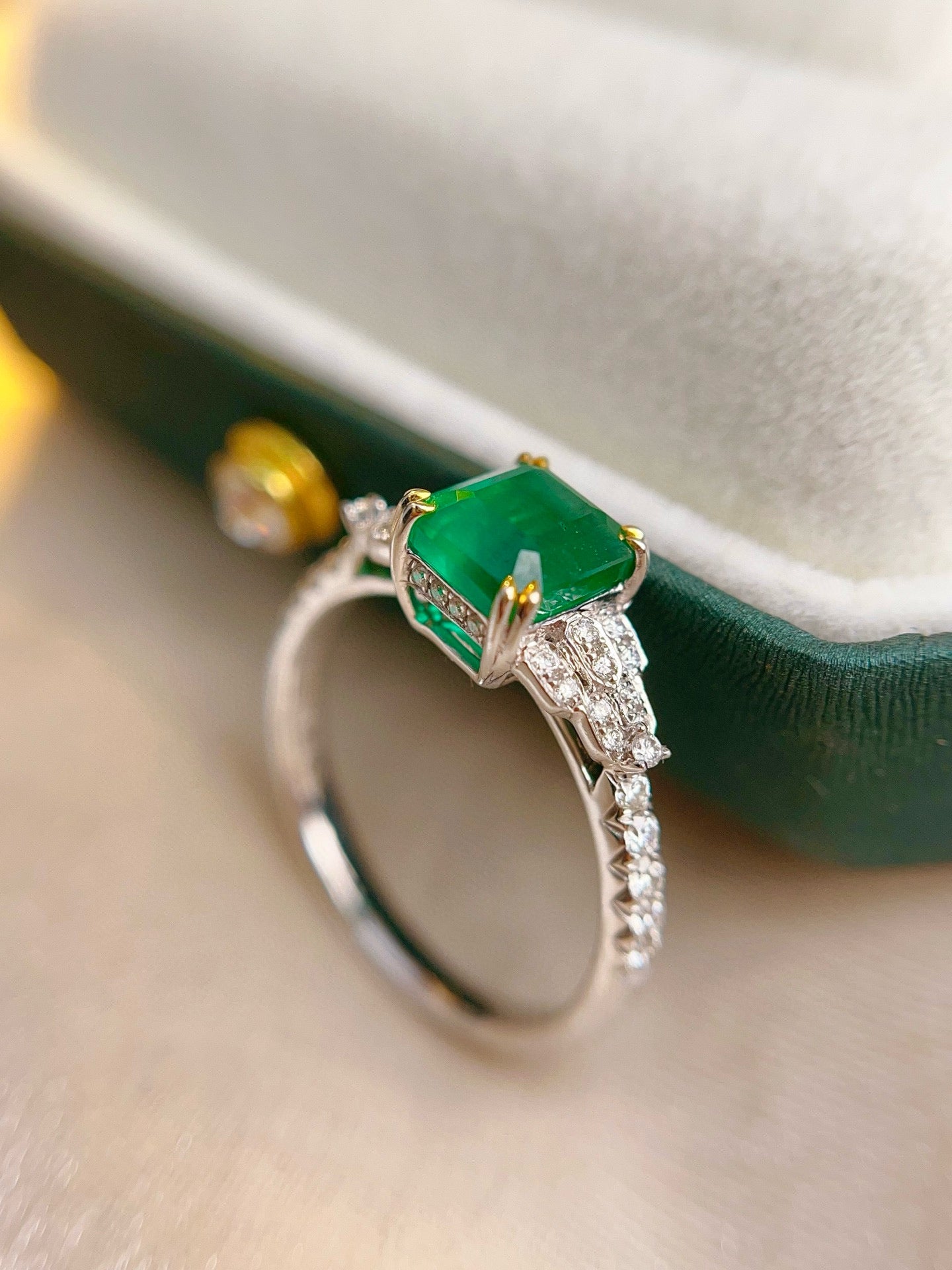 Ref:231027215 // Gold Content:14K Gold // Ring Size:7.25US // // Main Gemstone:Emerald // Shape:Octagonal // Carat Weight:1.40ct // Color:Vivid Green // Treatment:Natural // // Adjacent Gemstone 2 : Diamond // Number of stones:40 // Shape:Round // Clarity Grade:VS-SI // Color:H // Treatment:Natural // Cut Grade:G //