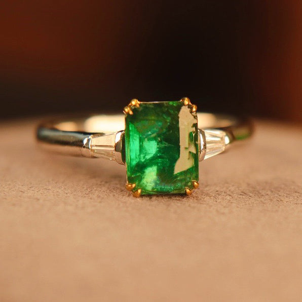Ref:231025202 // Gold Content:14K Gold // Ring Size:7.25US // // Main Gemstone:Emerald // Shape:Octagonal // Carat Weight:1.26ct // Color:Vivid Green // Treatment:Natural // // Adjacent Gemstone 2 : Diamond // Shape:Baguette // Carat Weight:0.14ct // Clarity Grade:VS-SI // Color:H // Treatment:Natural //