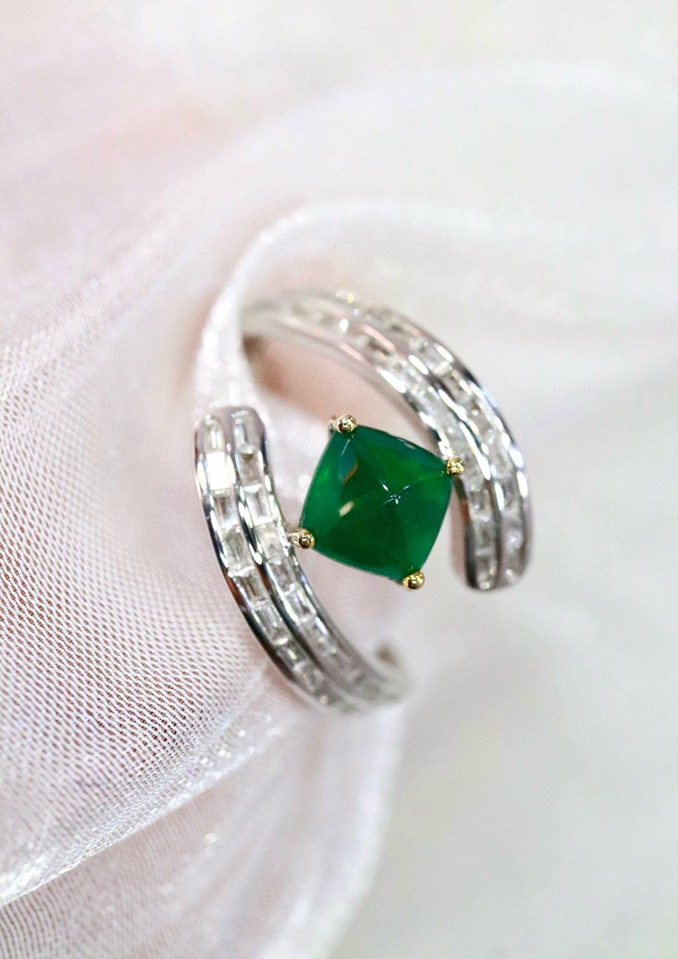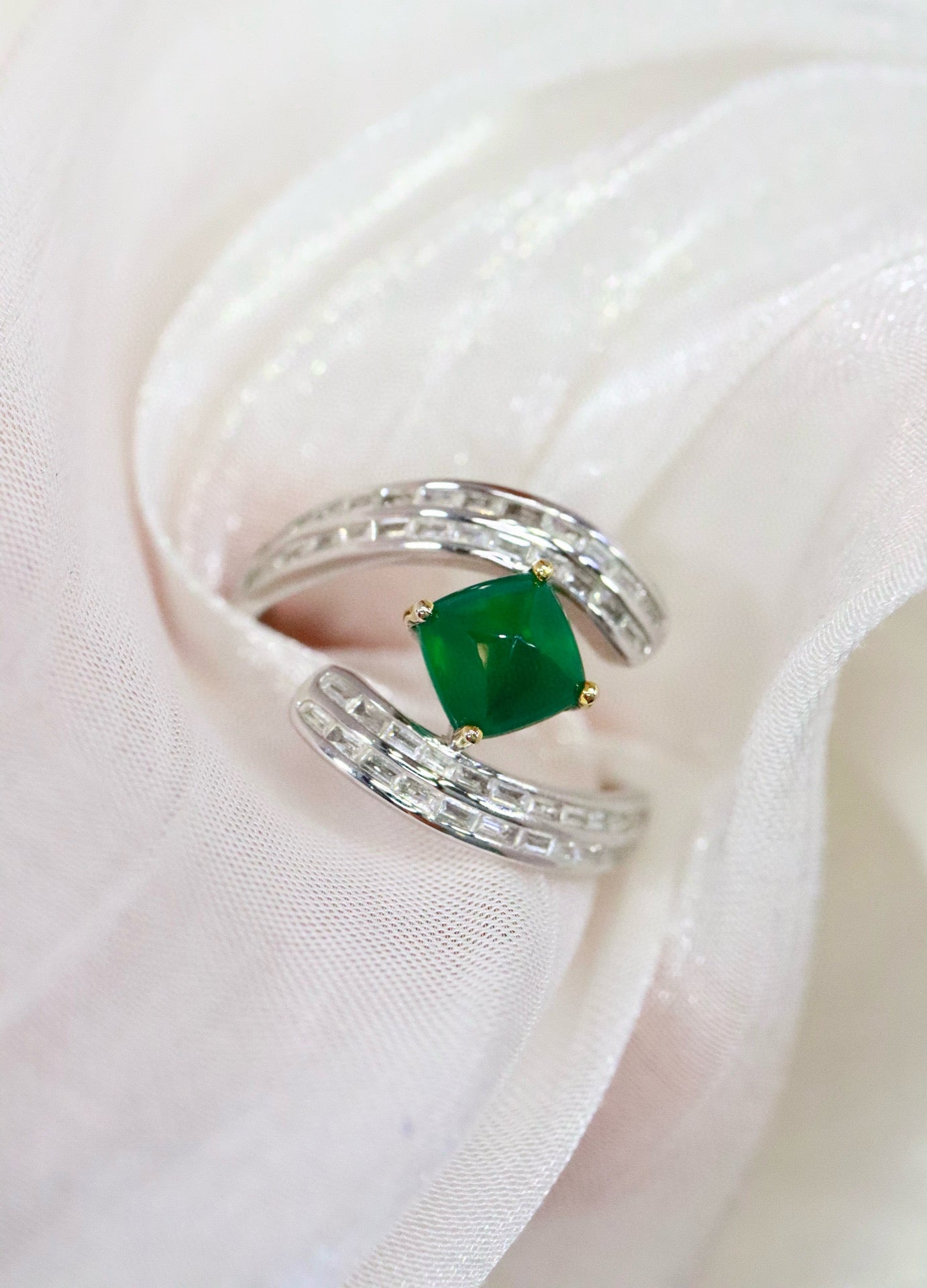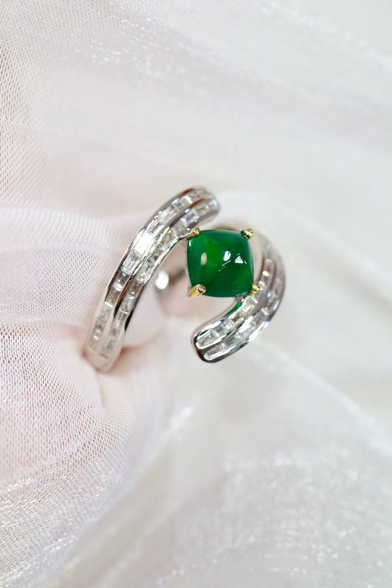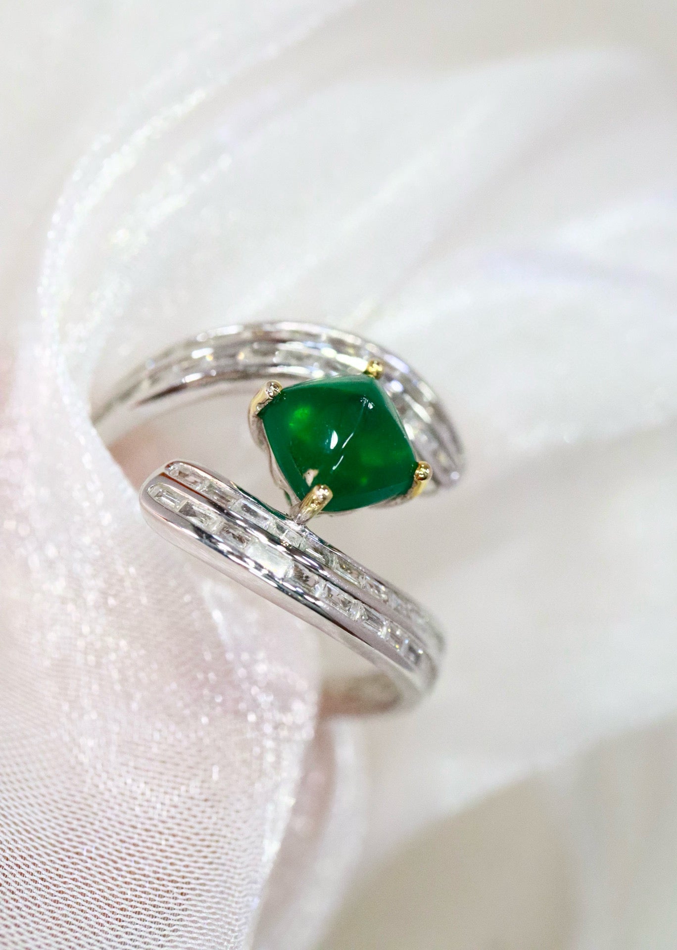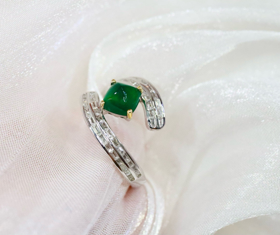 Ref:231019216 // Gold Content:14K Gold // Ring Size:7.25US // // Main Gemstone:Emerald // Shape:Suger-Loaf // Carat Weight:1.01ct // Color:Green // Treatment:Natural // // Adjacent Gemstone 2 : Diamond // Shape:Rectangle // Carat Weight:0.4ct // Clarity Grade:VS-SI // Color:H // Treatment:Natural //