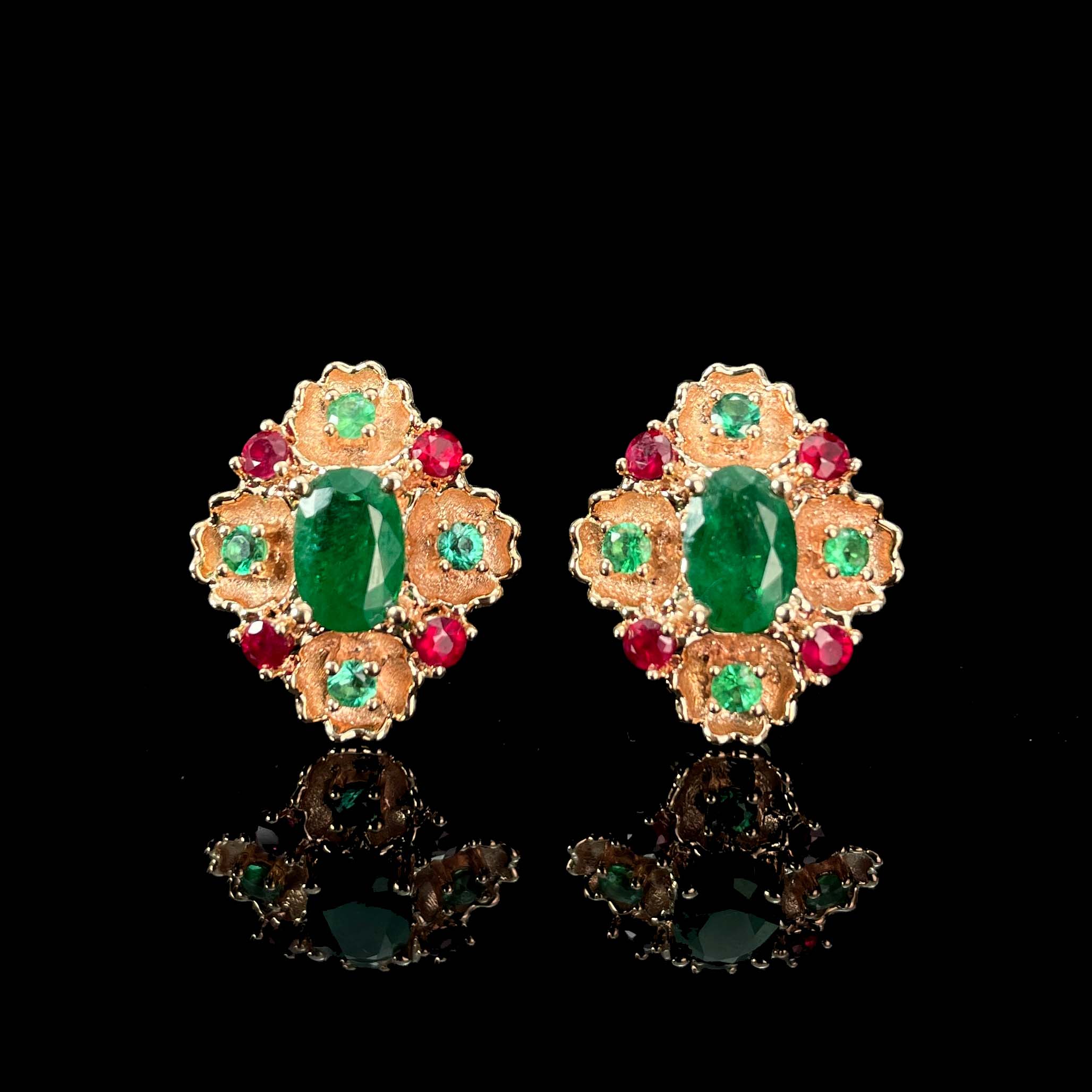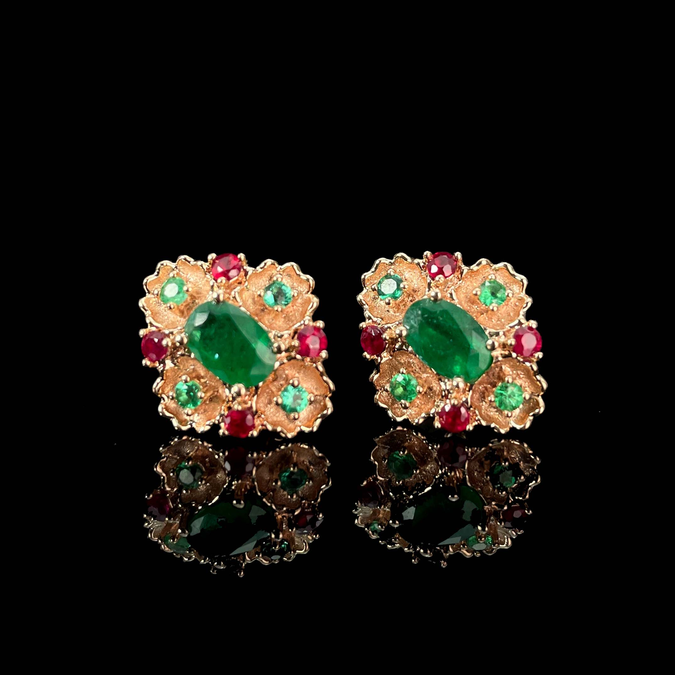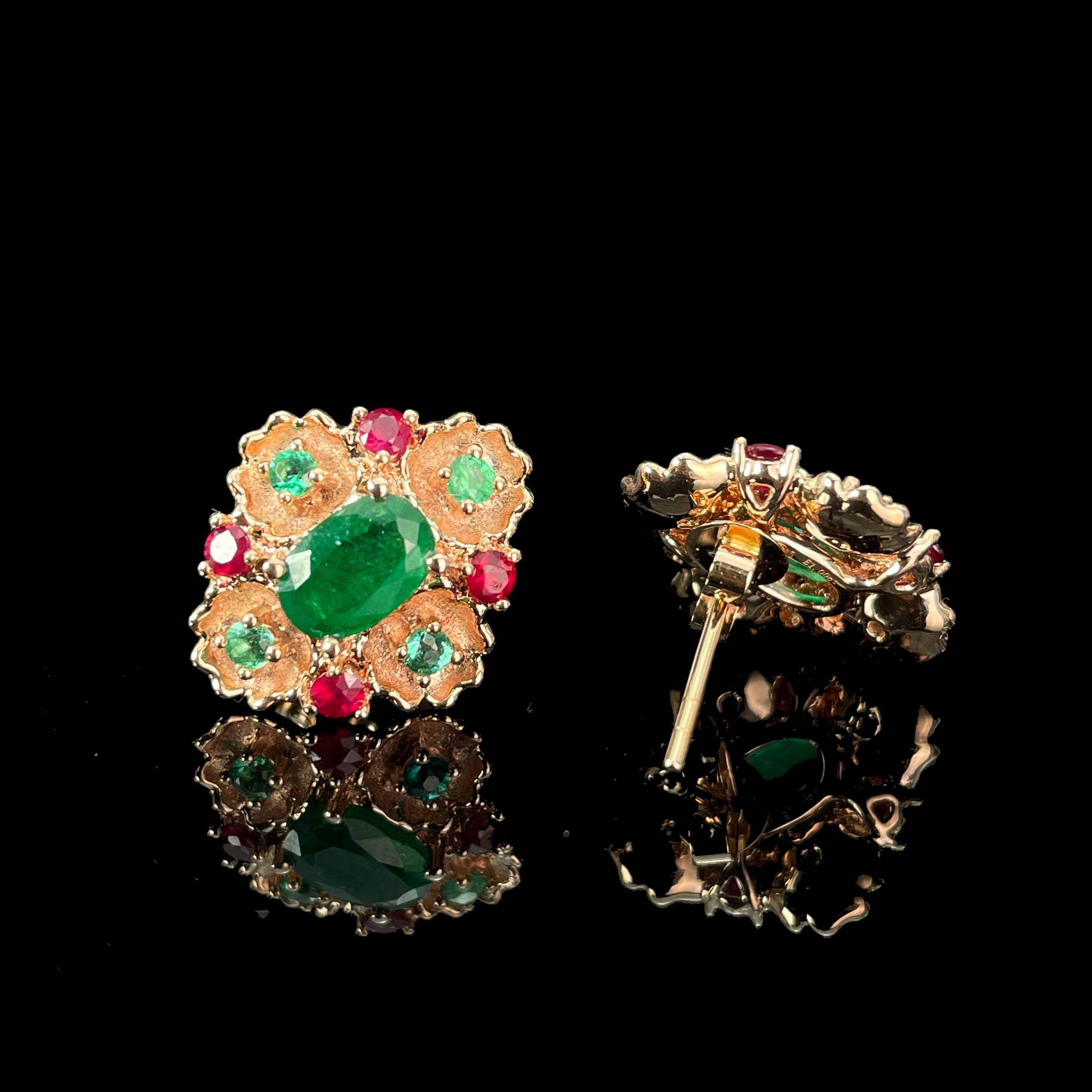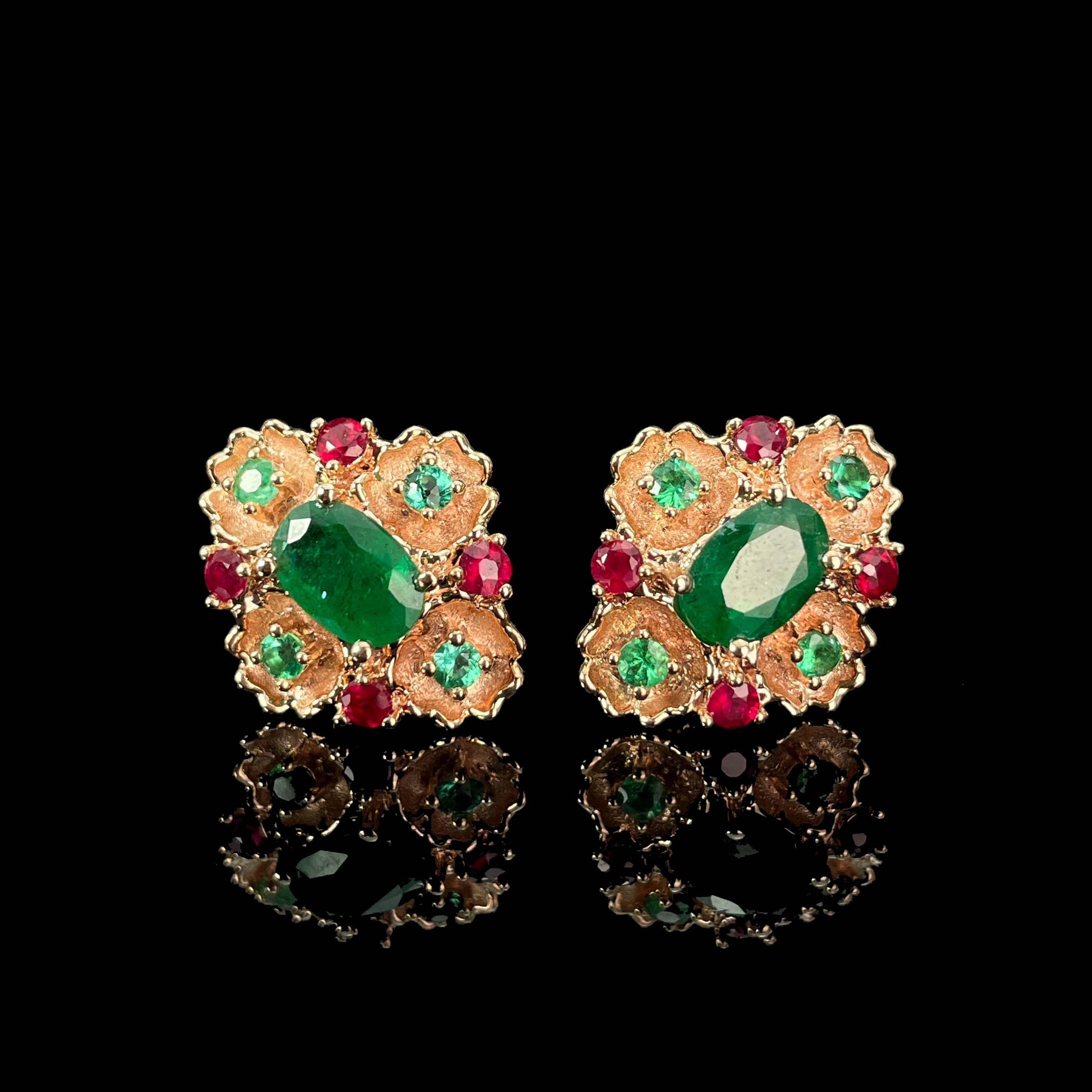 14K GOLD 1.42 CTW NATURAL EMERALD & TSAVORITE & RUBY EARRINGS