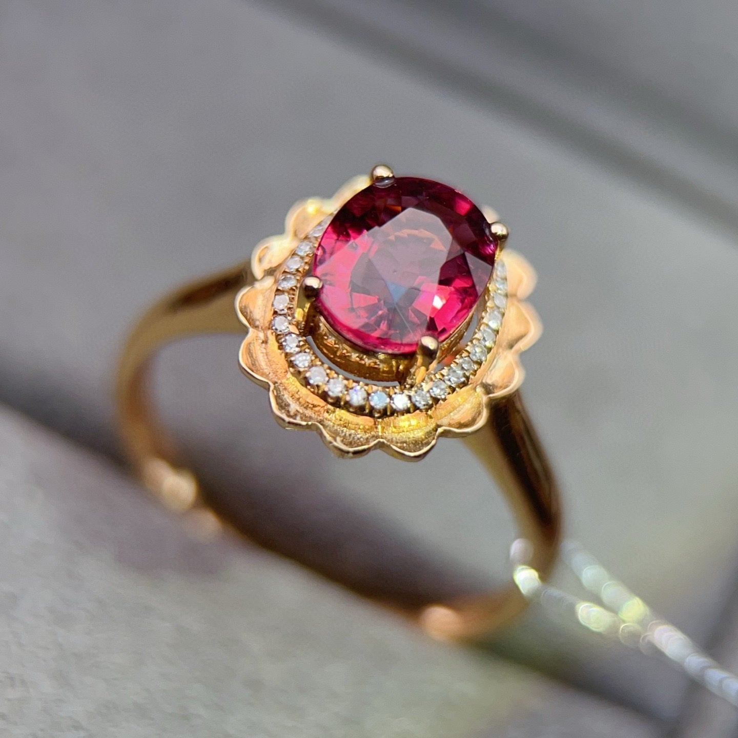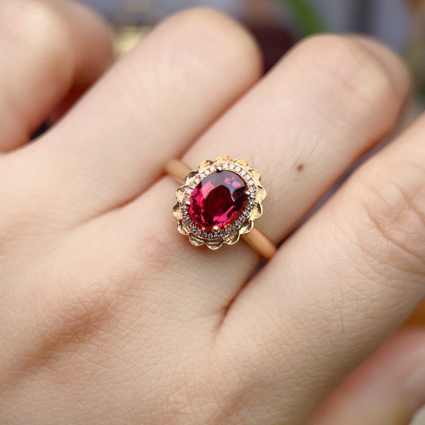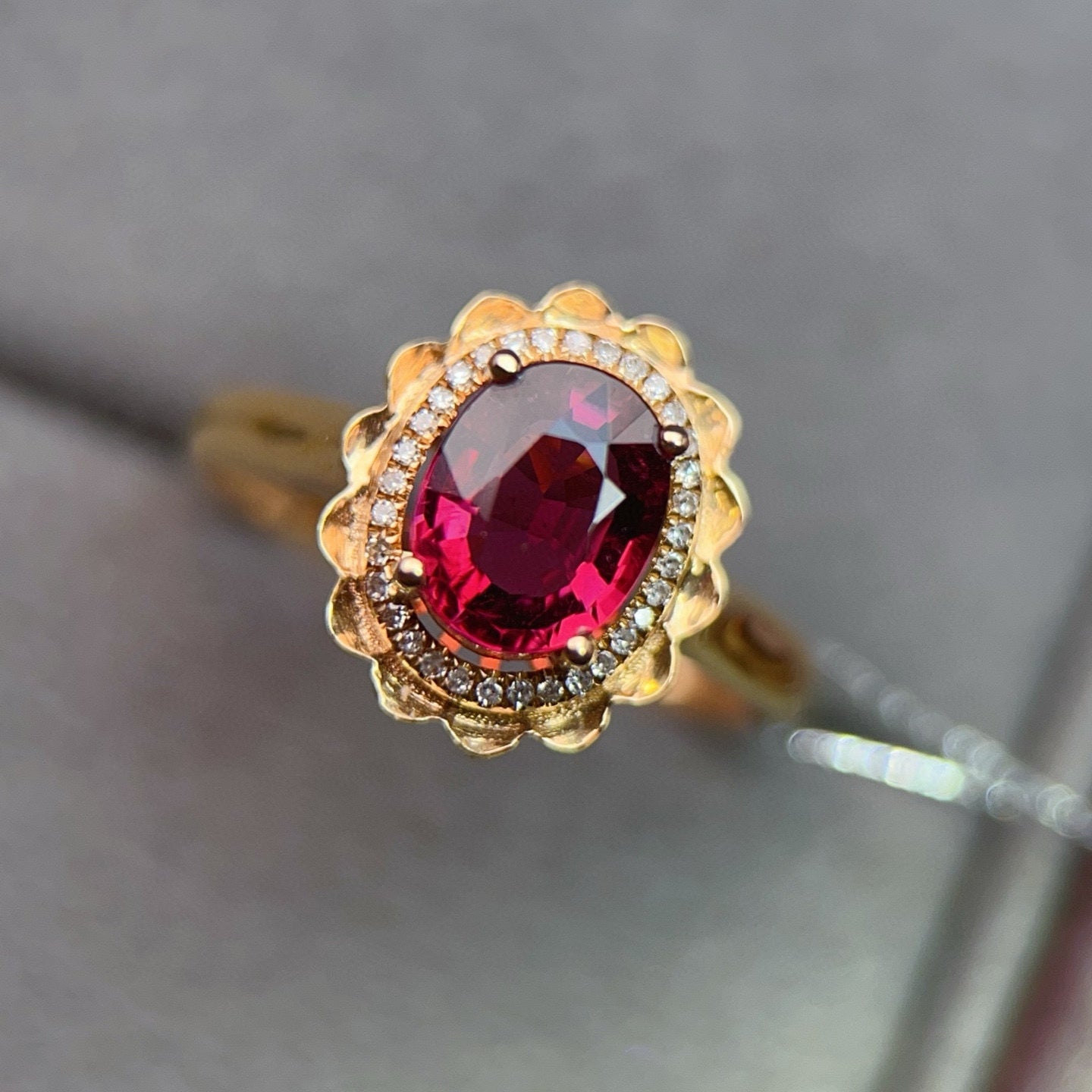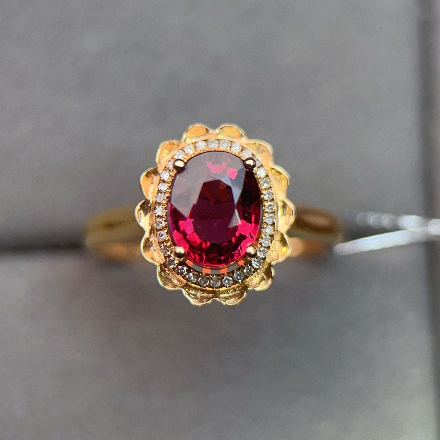 Ref:231023114 // Gold Content:14K Gold // Ring Size:7.25US // // Main Gemstone:Tourmaline // Shape:Oval // Carat Weight:1.45ct // Color:Red // Treatment:Natural // // Adjacent Gemstone 2 : Diamond // Number of stones:32 // Shape:Round // Carat Weight:0.09ct // Clarity Grade:VS-SI // Color:H // Treatment:Natural // Cut Grade:G //