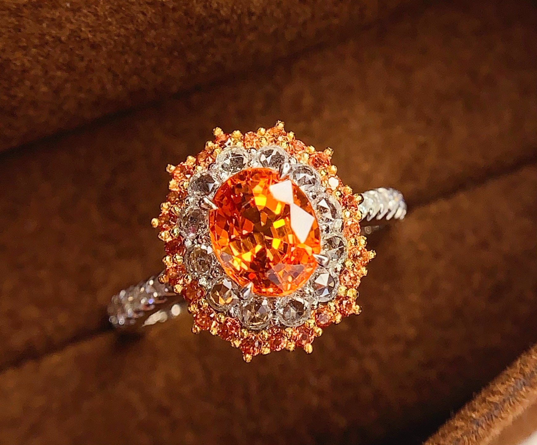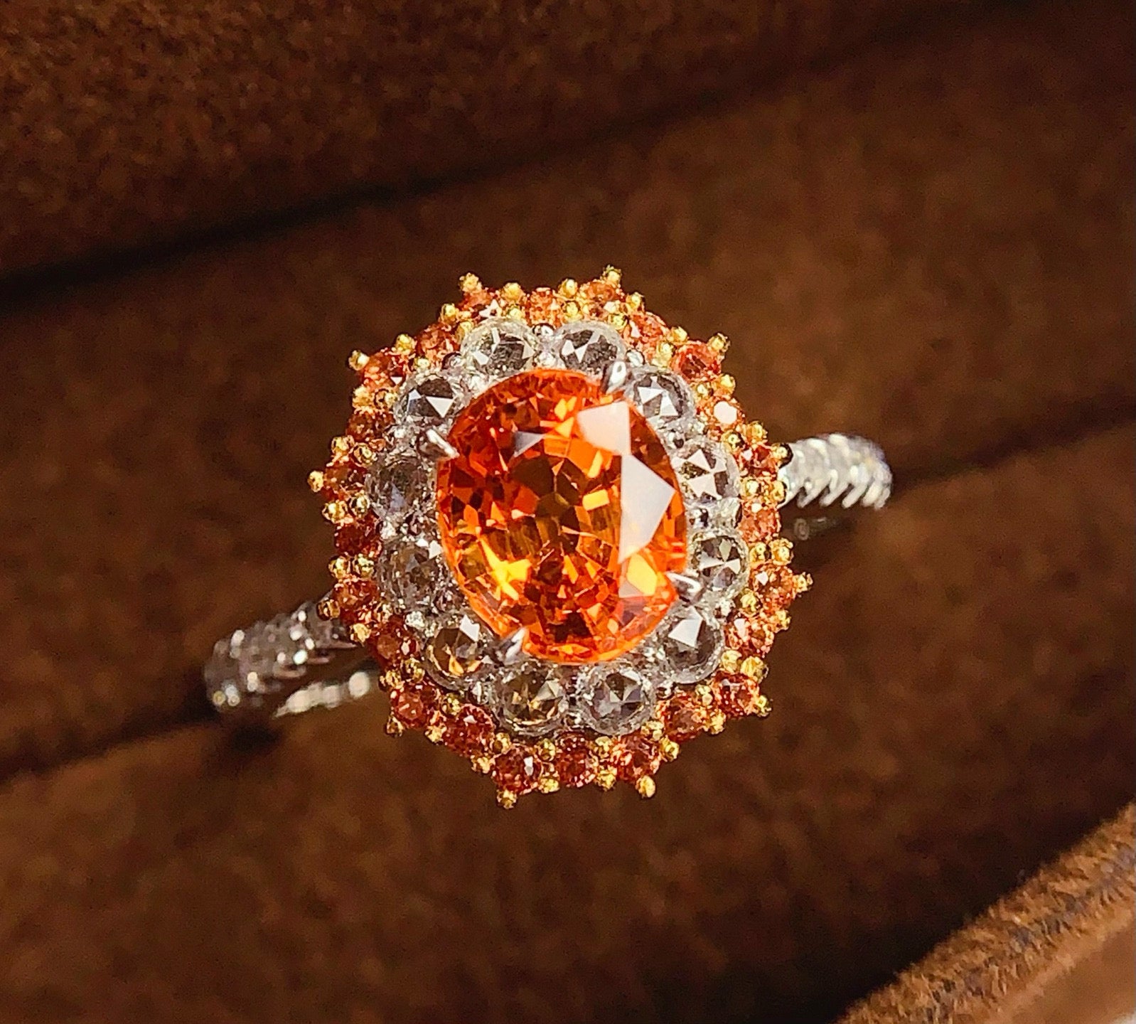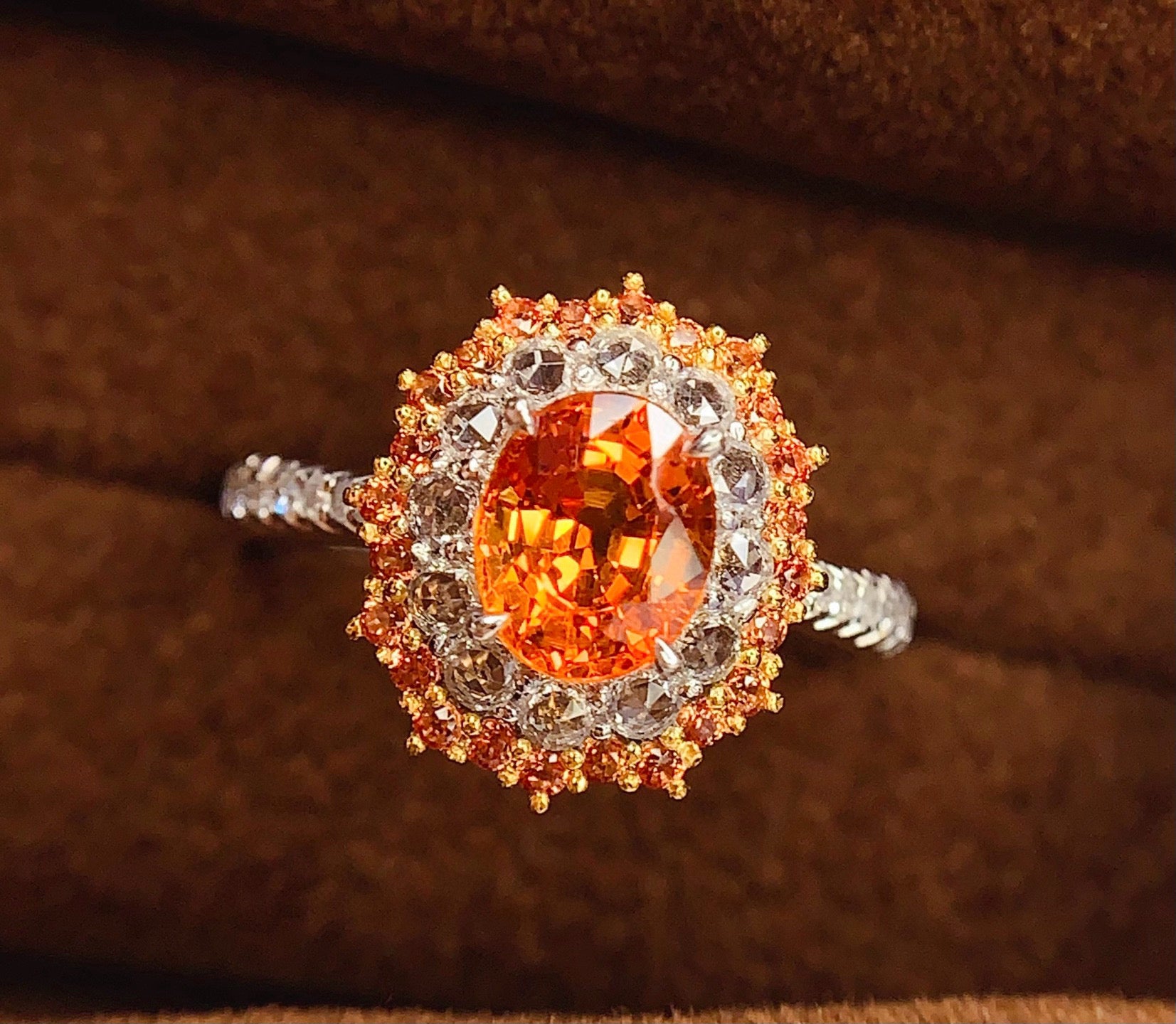 Ref:231025033 // Gold Content:14K Gold // Ring Size:7.25US // // Main Gemstone:Sapphire // Shape:Oval // Carat Weight:1.56ct // Color:Orange // Treatment:Natural // // Adjacent Gemstone 2 : Diamond // Shape:Round // Clarity Grade:VS-SI // Color:H // Treatment:Natural // Cut Grade:G //