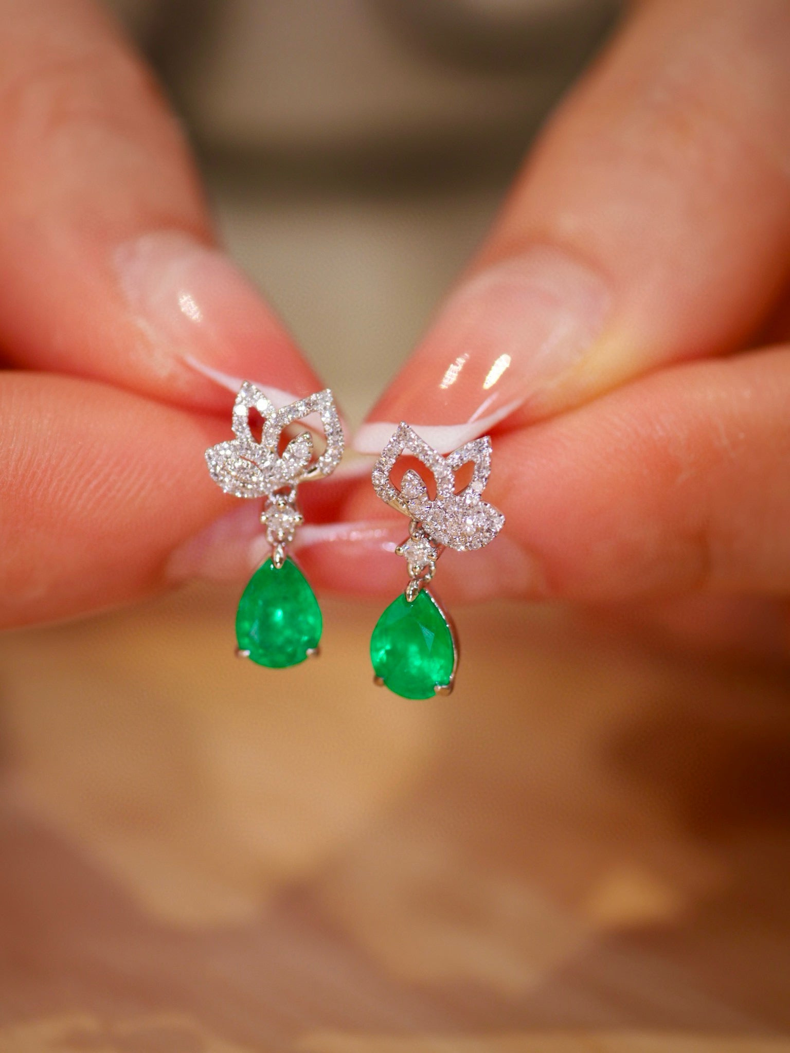 Ref:231025056 // Gold Content:14K Gold // Main Gemstone:Emerald // Shape:Pear // Carat Weight:1.4ct // Color:Vivid Green // Treatment:Natural // // Adjacent Gemstone 2 : Diamond // Shape:Round // Carat Weight:0.19ct // Clarity Grade:VS-SI // Color:H // Treatment:Natural // Cut Grade:G //