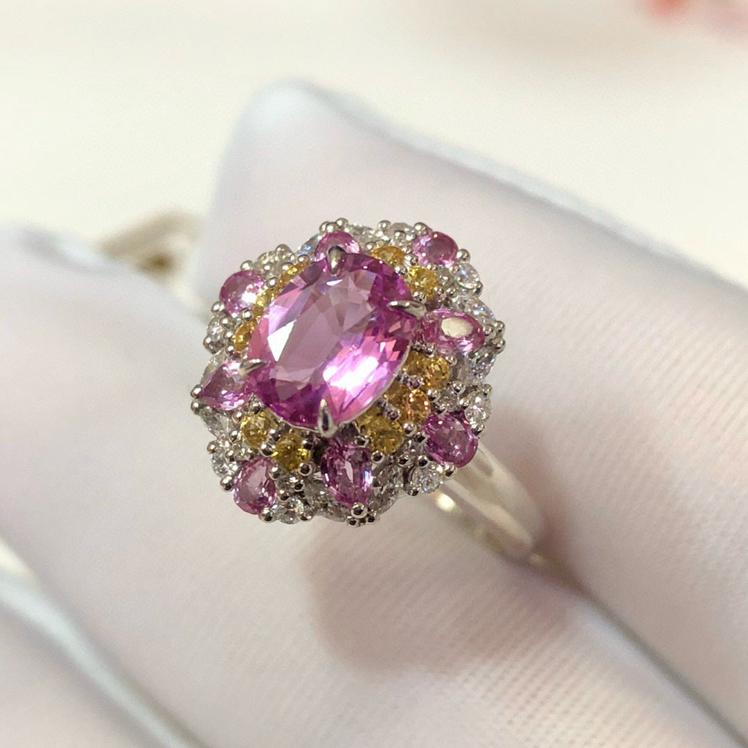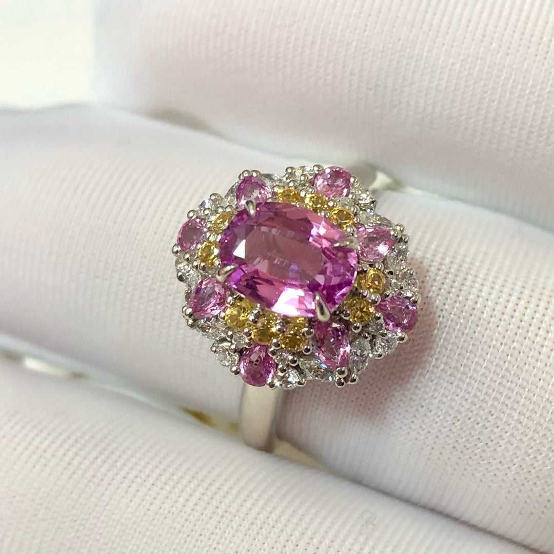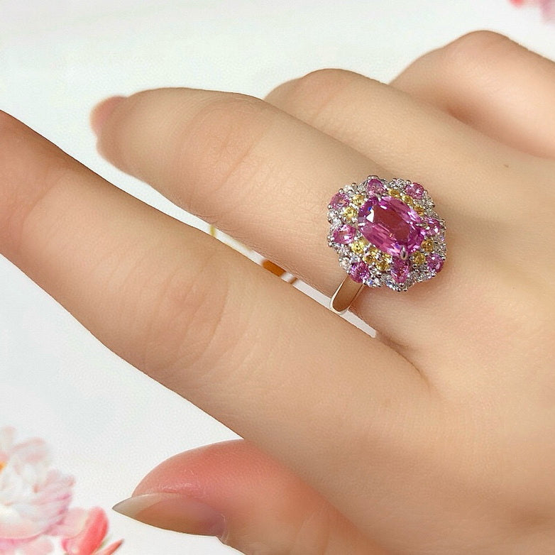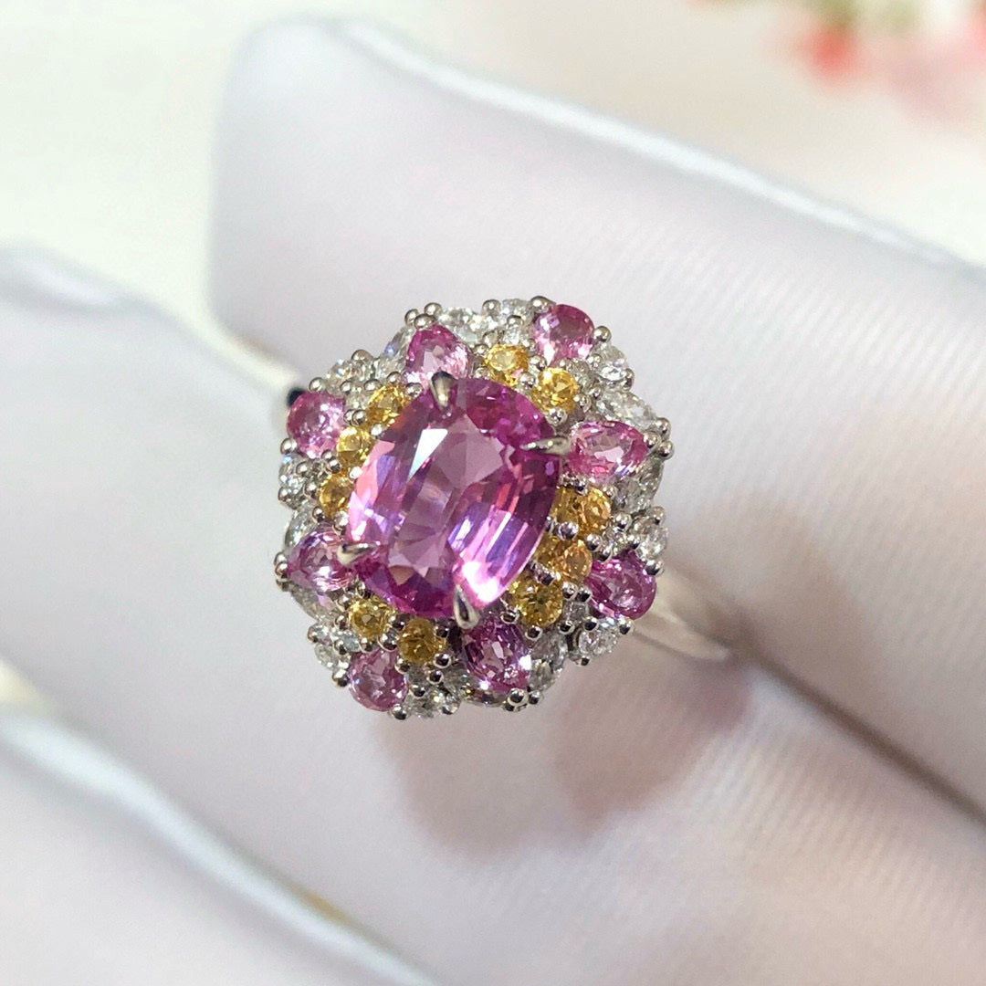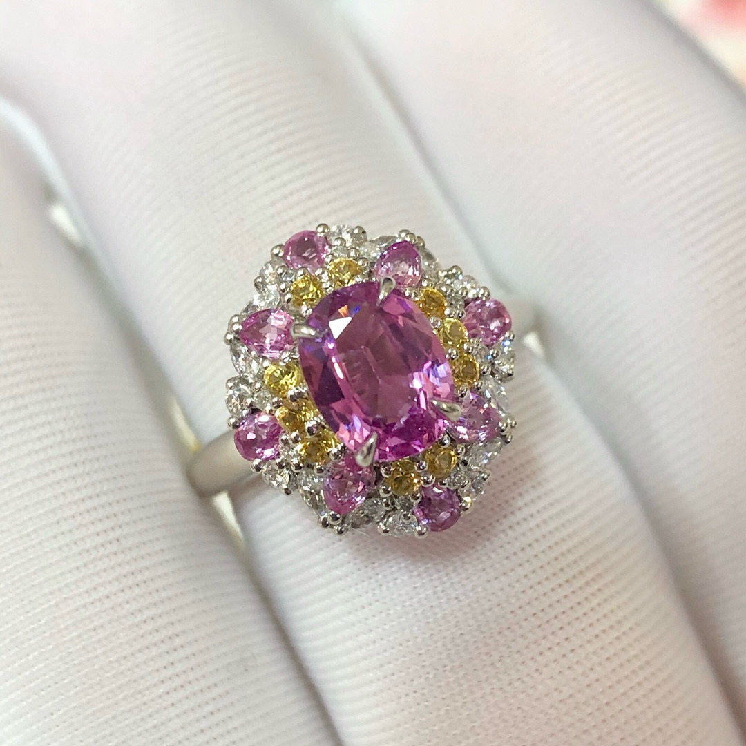 Ref:231021167 // Gold Content:14K Gold // Ring Size:7.25US // // Main Gemstone:Sapphire // Shape:Oval // Carat Weight:1.3ct // Color:Pink // Treatment:Natural // // Adjacent Gemstone 2 : Diamond // Shape:Round // Carat Weight:0.34ct // Clarity Grade:VS-SI // Color:H // Treatment:Natural // Cut Grade:G // // Adjacent Gemstone 3 : Sapphire // Shape:Multiply // Carat Weight:0.8ct // Color:Color // Treatment:Natural //