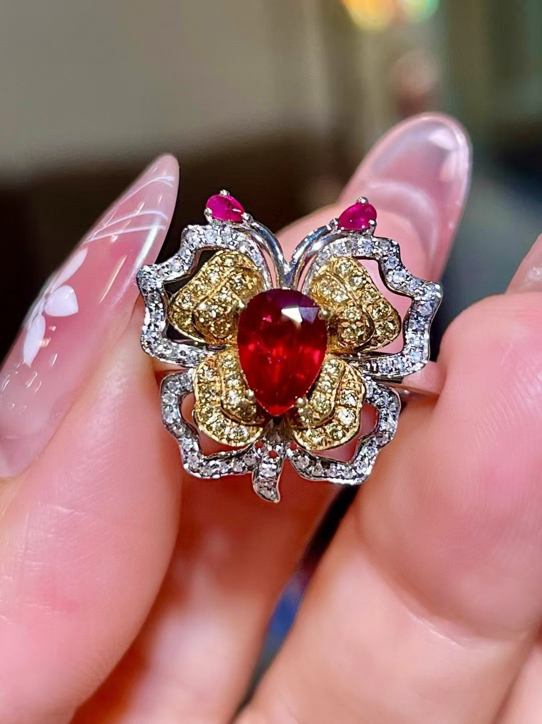 Ref:231019114 // Gold Content:14K Gold // Ring Size:7.25US // // Main Gemstone:Ruby // Shape:Pear // Carat Weight:1.3ct // Color:Red // Treatment:Natural // // Adjacent Gemstone 2 : Yellow Diamond & Diamond // Shape:Round // Carat Weight:0.43ct // Clarity Grade:VS-SI // Color: Yellow & H // Treatment:Natural // Cut Grade:G // // Adjacent Gemstone 3 : Ruby // Number of stones:2 // Shape:Pear // Color:Pink // Treatment:Natural //