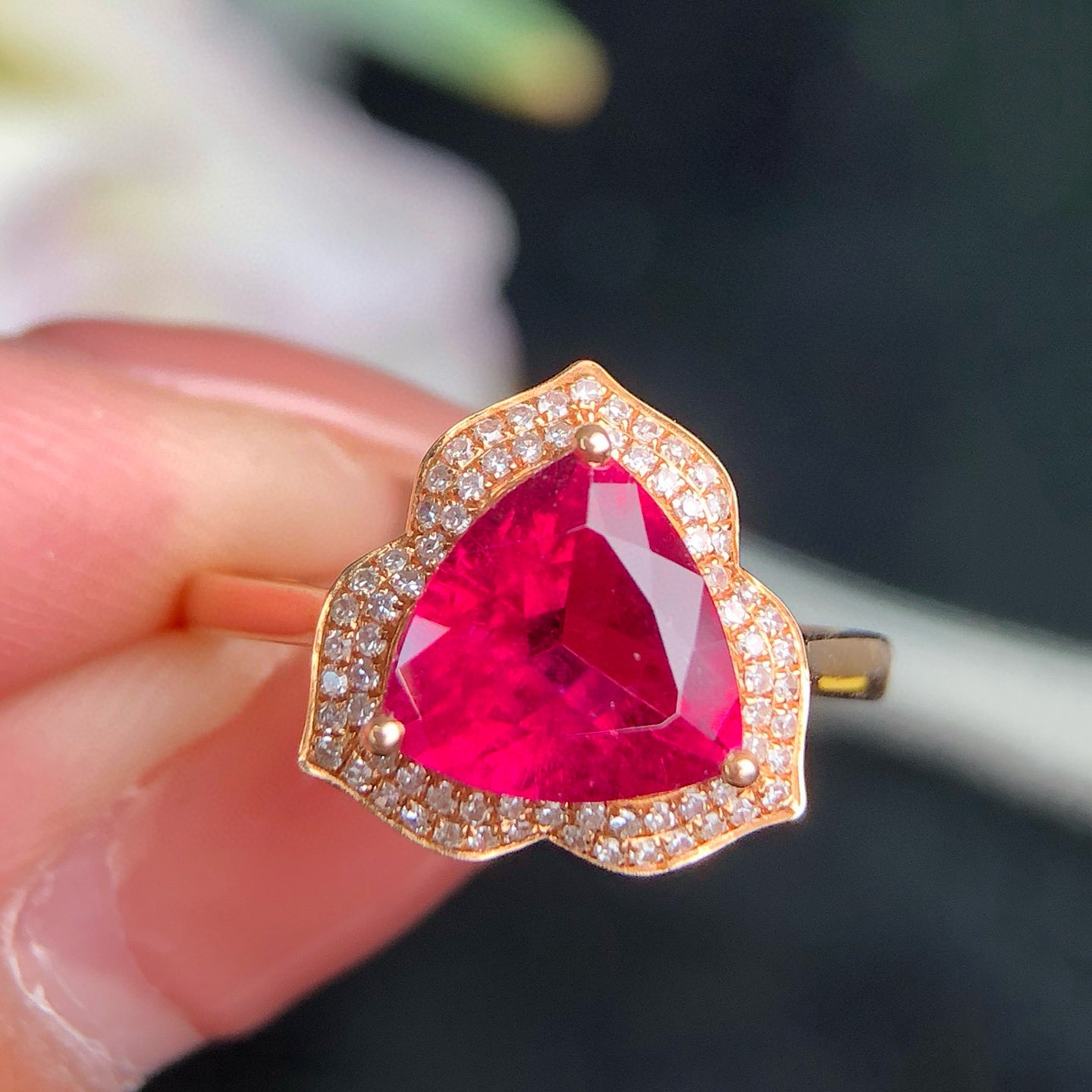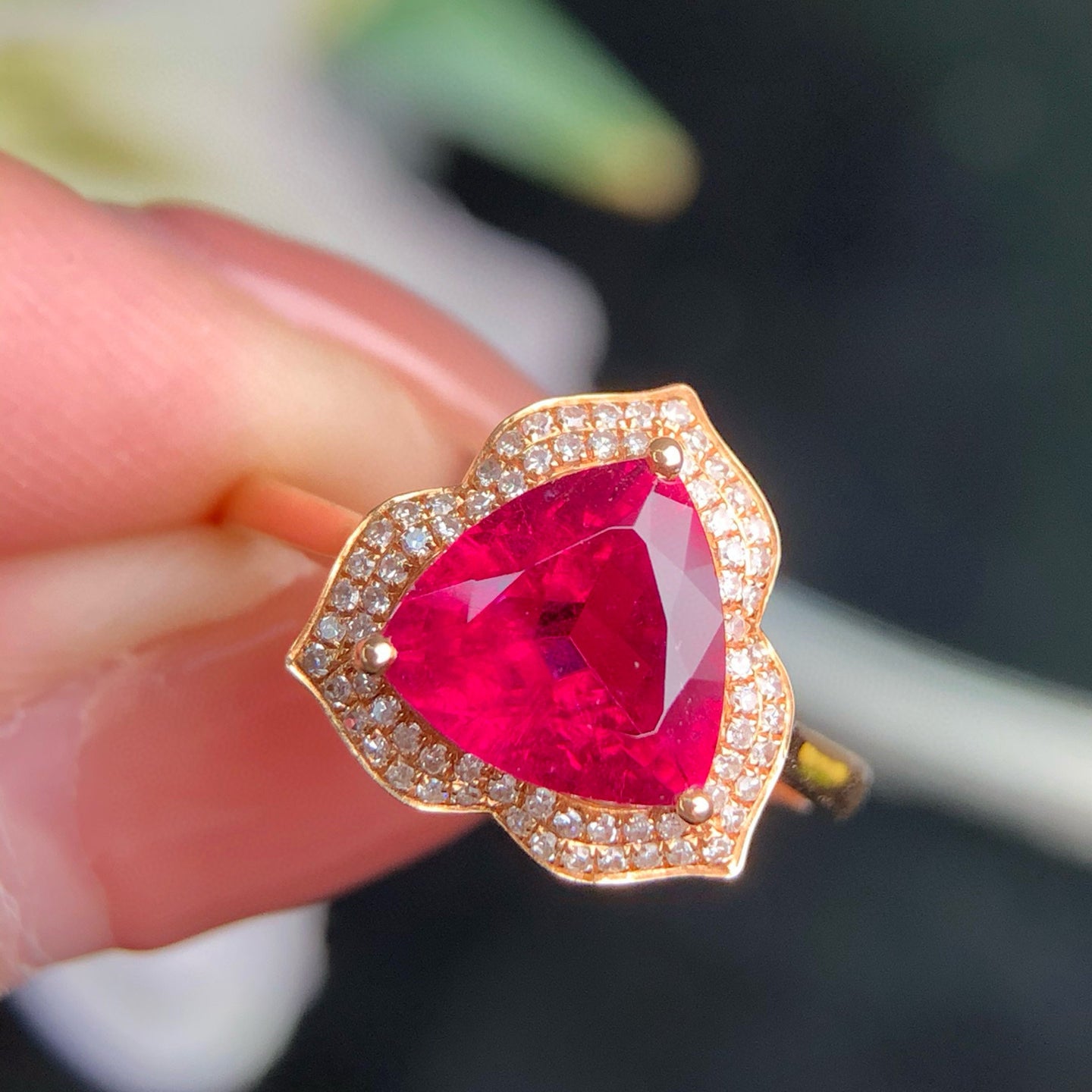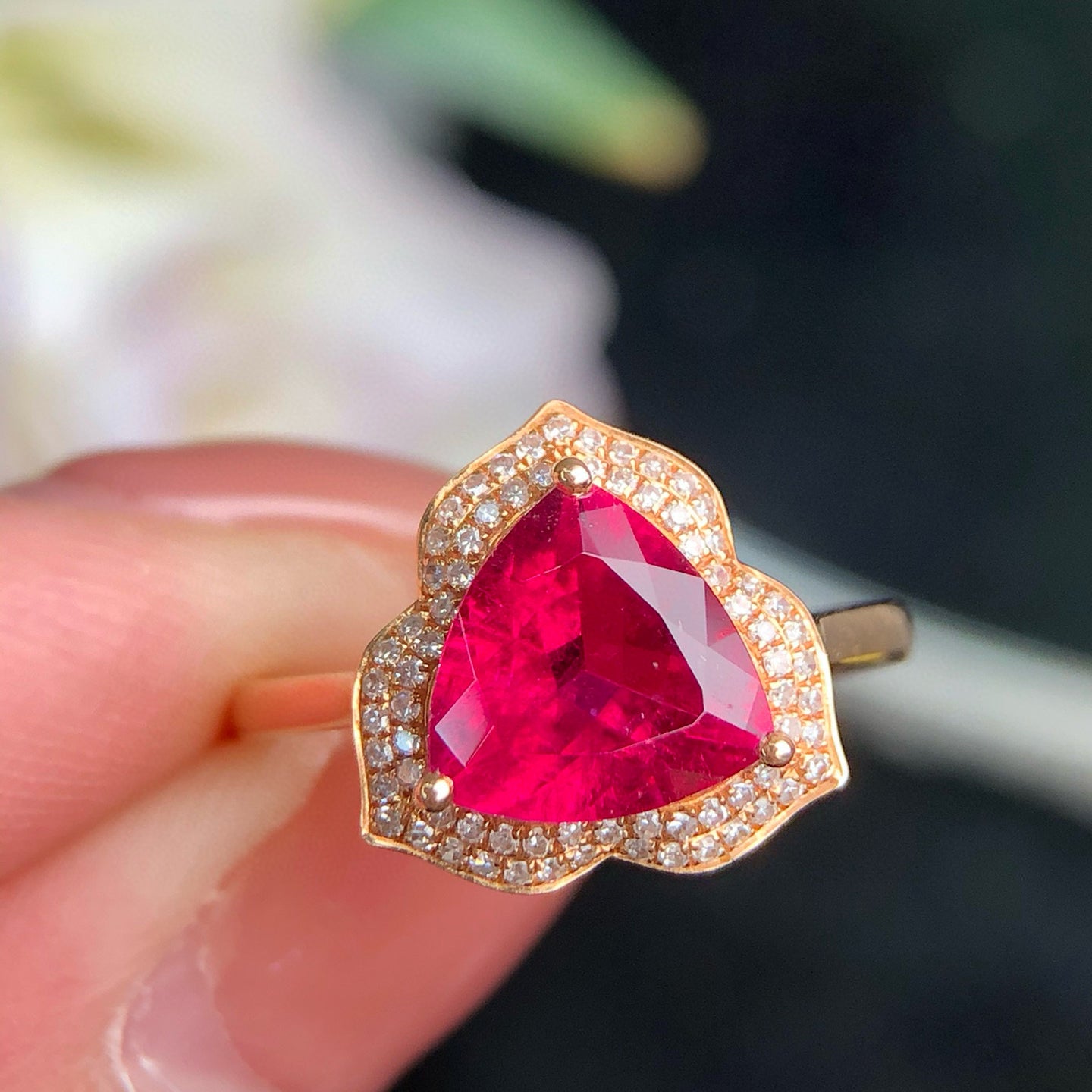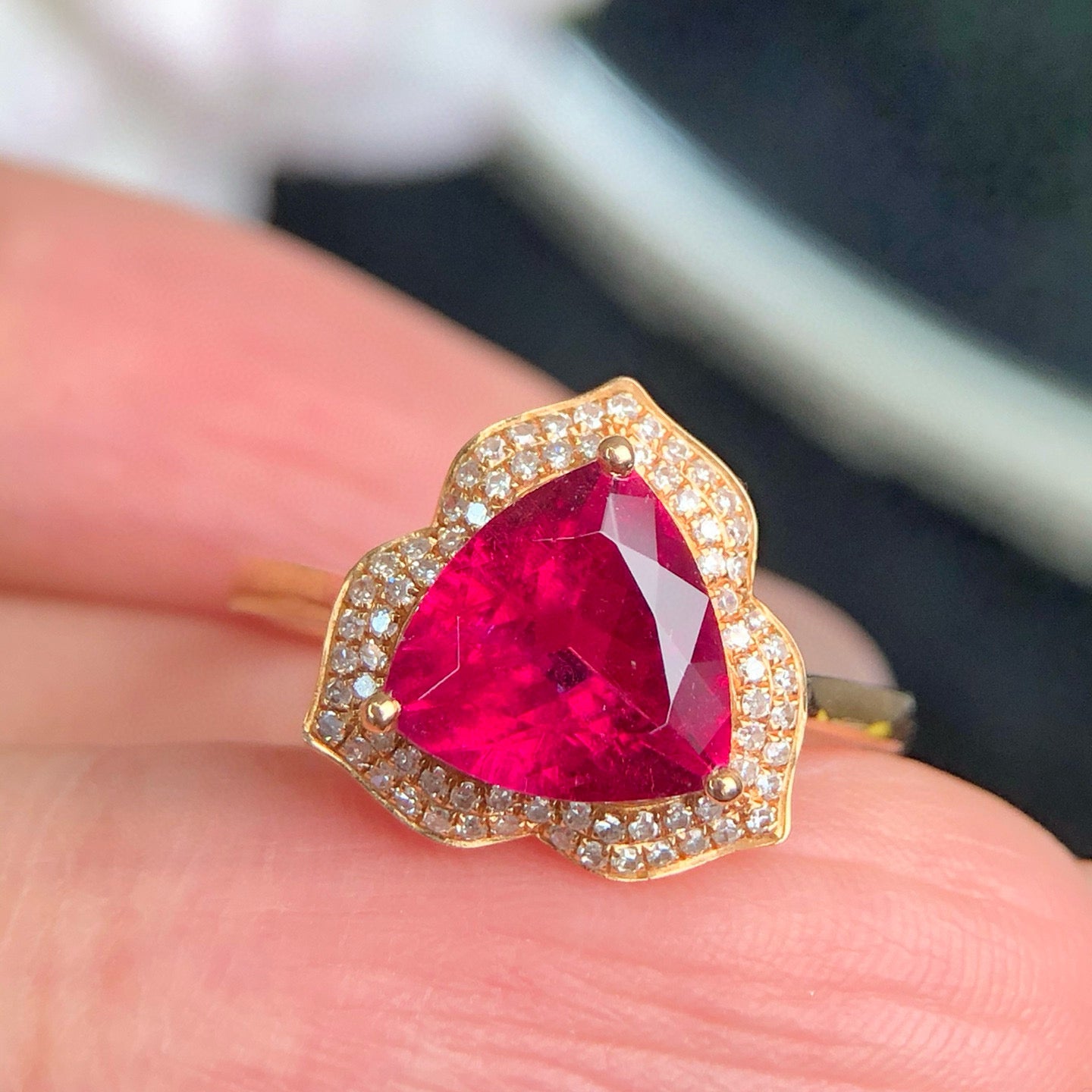 Ref:231023174 // Gold Content:14K Gold // Ring Size:7.25US // // Main Gemstone:Tourmaline // Shape:Triangle // Carat Weight:1.8ct // Color:Rubellite // Treatment:Natural // // Adjacent Gemstone 2 : Diamond // Number of stones:72 // Shape:Round // Clarity Grade:VS-SI // Color:H // Treatment:Natural // Cut Grade:G //
