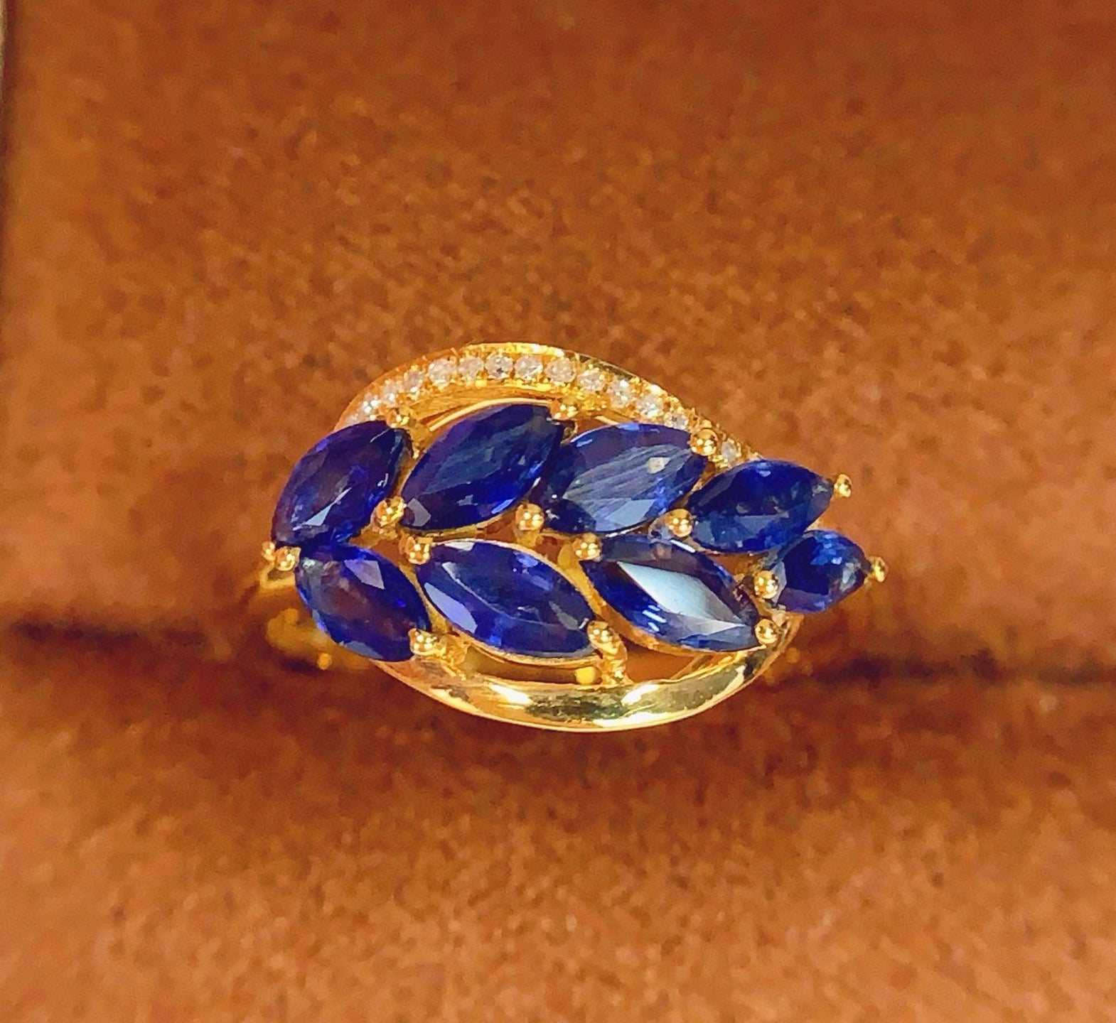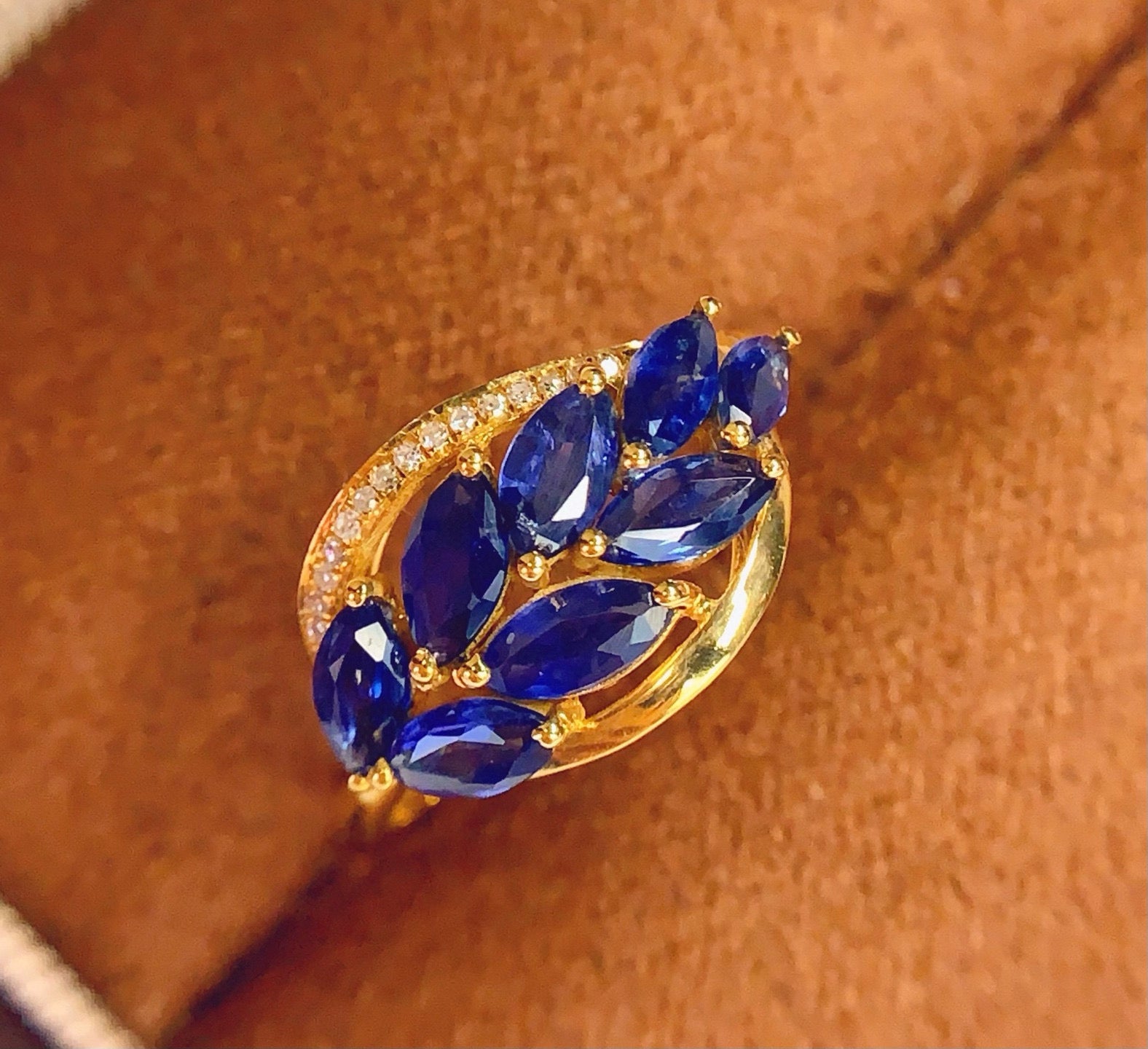 Ref:231025112 // Gold Content:14K Gold // Ring Size:7.25US // // Main Gemstone:Sapphire // Shape:Marquise // Carat Weight:1.83ct // Color:Blue // Treatment:Natural // // Adjacent Gemstone 2 : Diamond // Number of stones:18 // Shape:Round // Clarity Grade:VS-SI // Color:H // Treatment:Natural // Cut Grade:G //