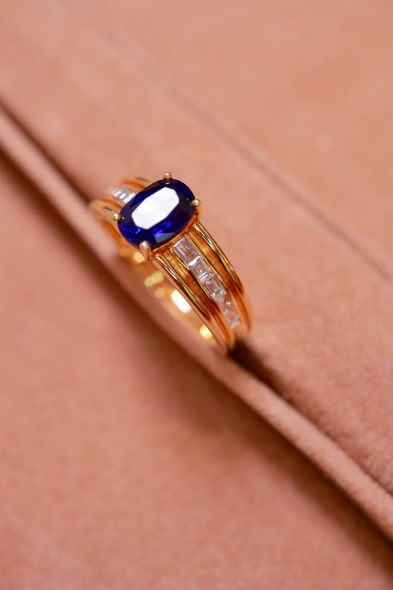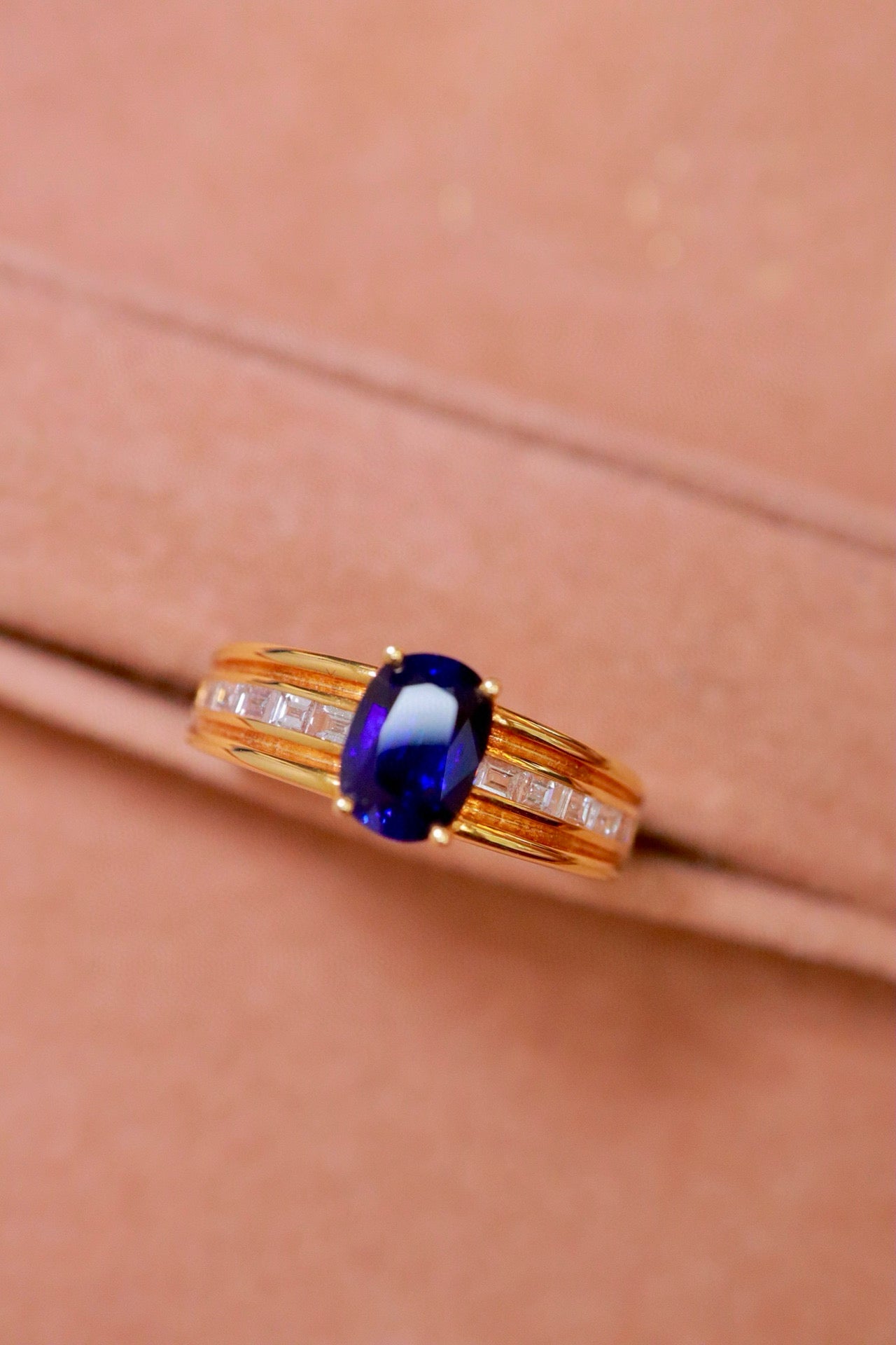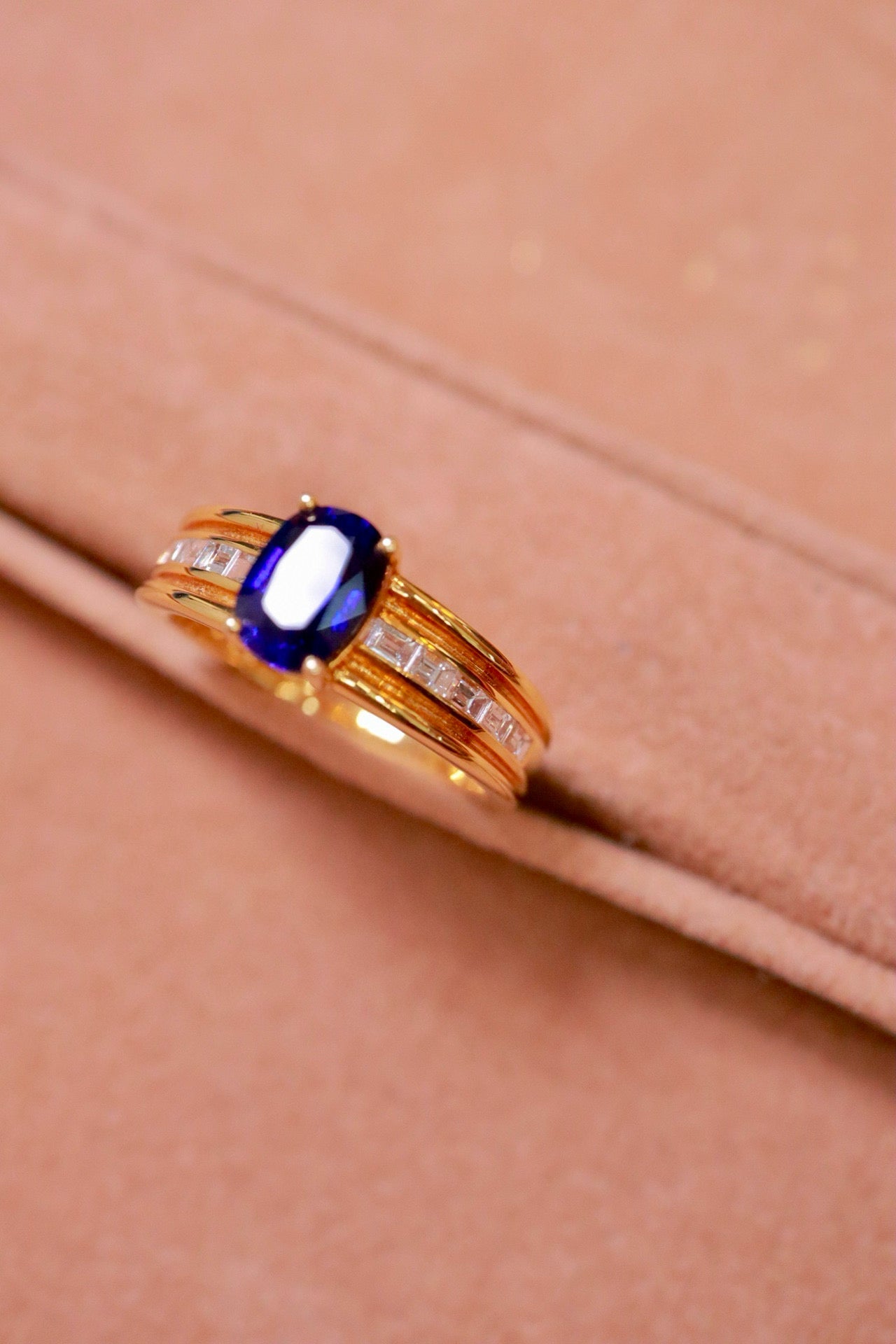 Ref:231027254 // Gold Content:14K Gold // Ring Size:7.25US // // Main Gemstone:Sapphire // Shape:Oval // Carat Weight:1.53ct // Color:Royal blue // Treatment:Natural // // Adjacent Gemstone 2 : Diamond // Shape:Baguette // Carat Weight:0.3ct // Clarity Grade:VS-SI // Color:H // Treatment:Natural //
