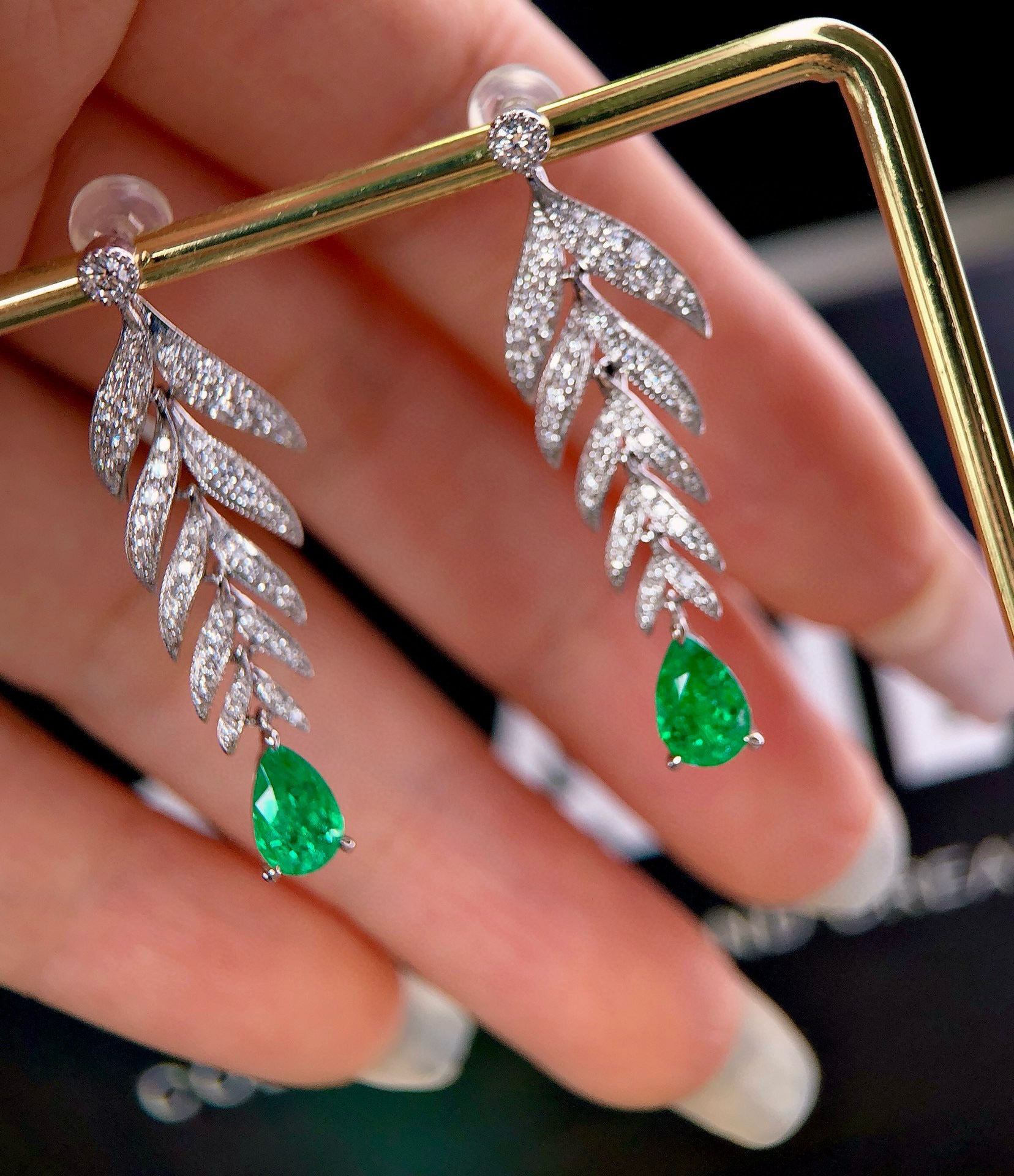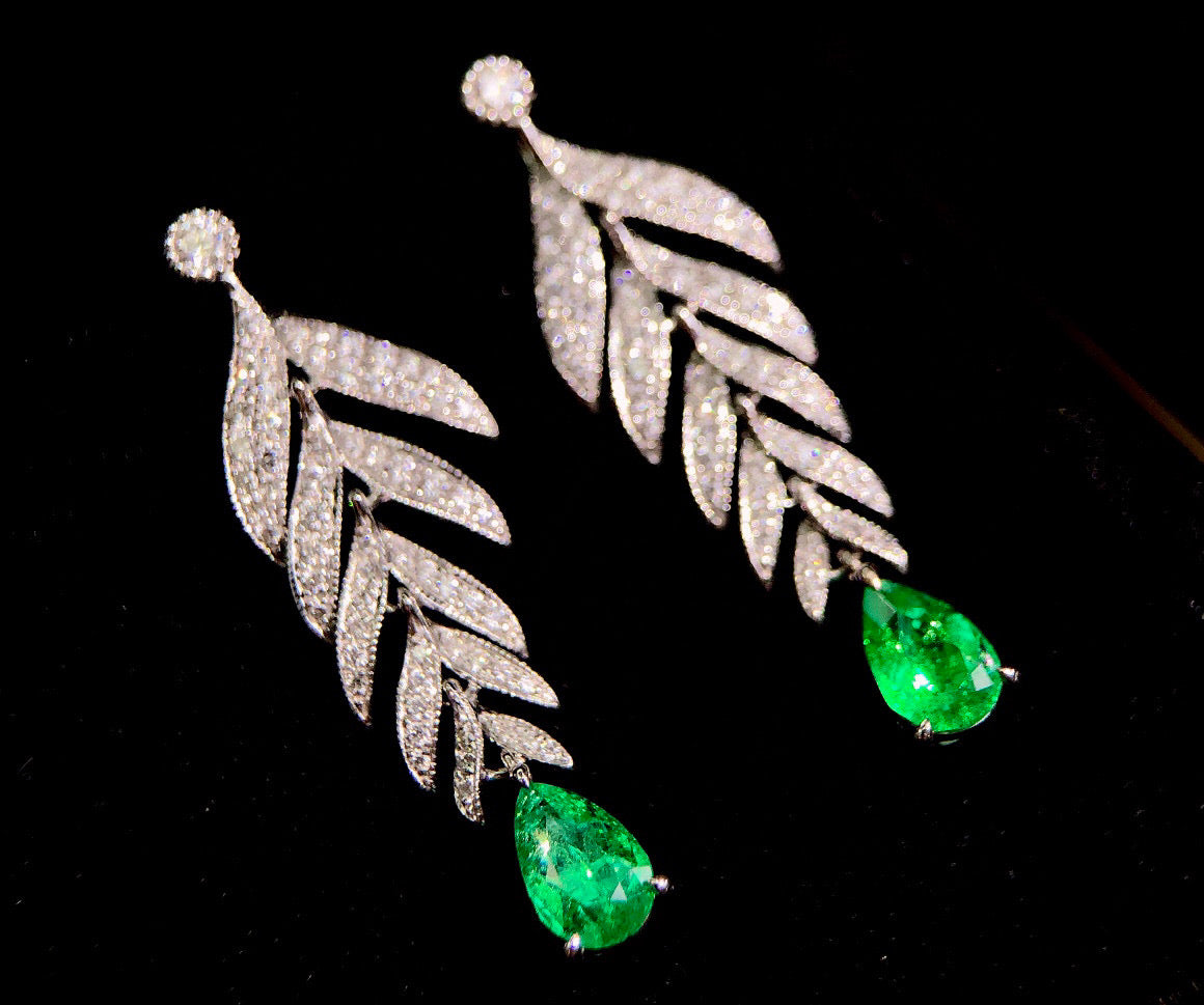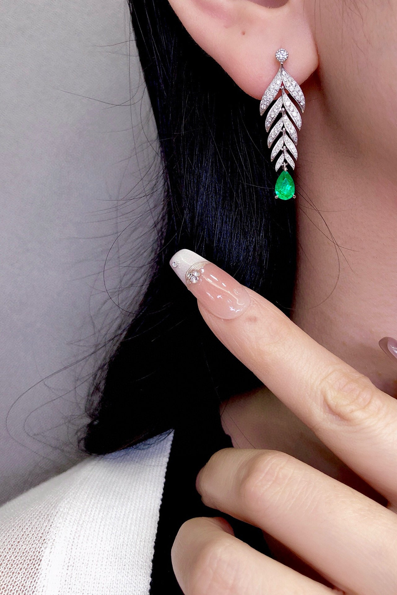 Ref:231027257 // Gold Content:14K Gold // Main Gemstone:Emerald // Shape:Pear // Carat Weight:1.06ct // Color:Vivid Green // Treatment:Natural // // Adjacent Gemstone 2 : Diamond // Shape:Round // Carat Weight:0.77ct // Clarity Grade:VS-SI // Color:H // Treatment:Natural // Cut Grade:G //