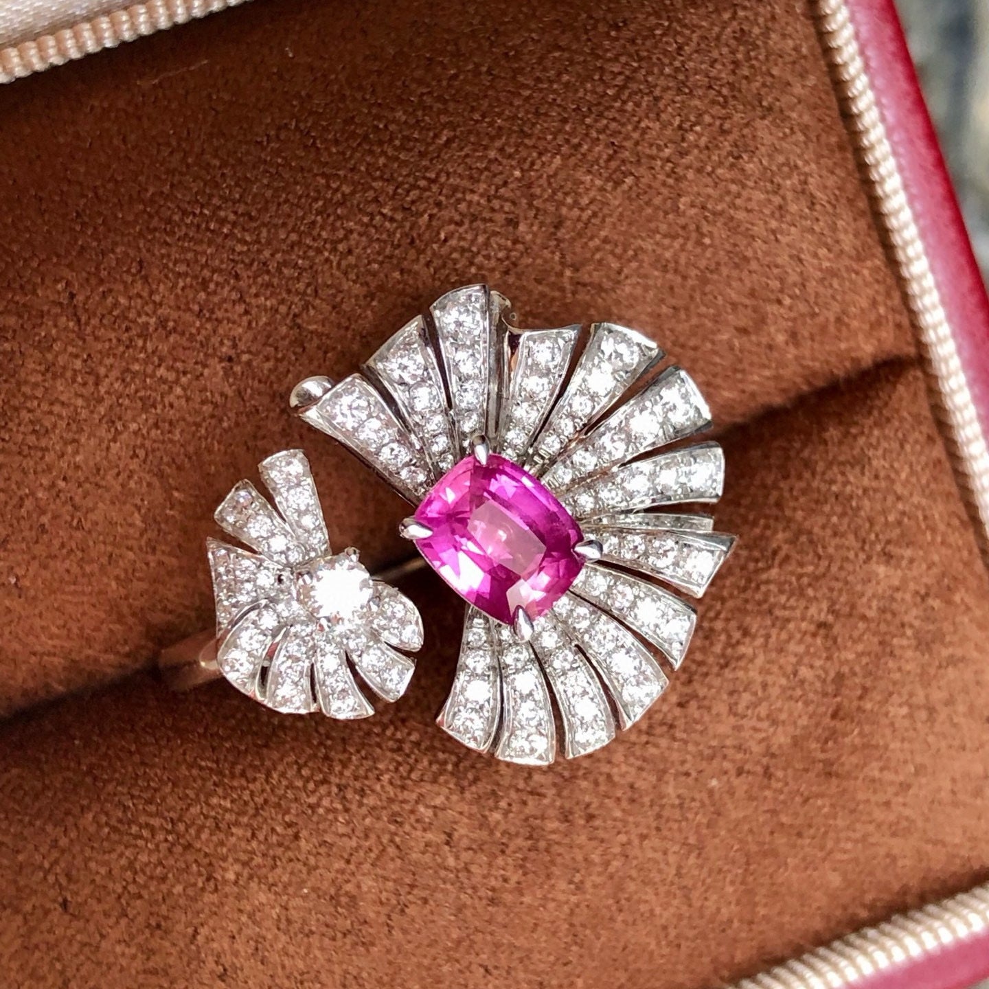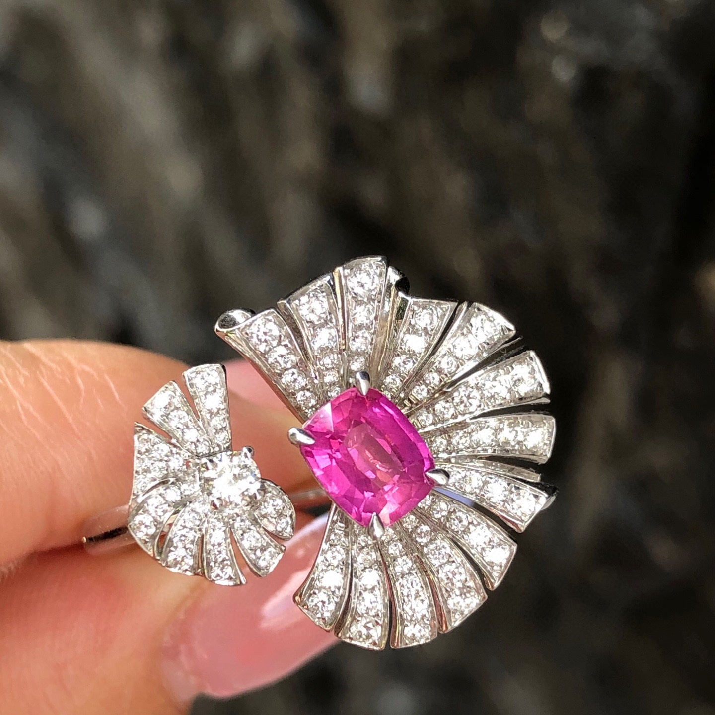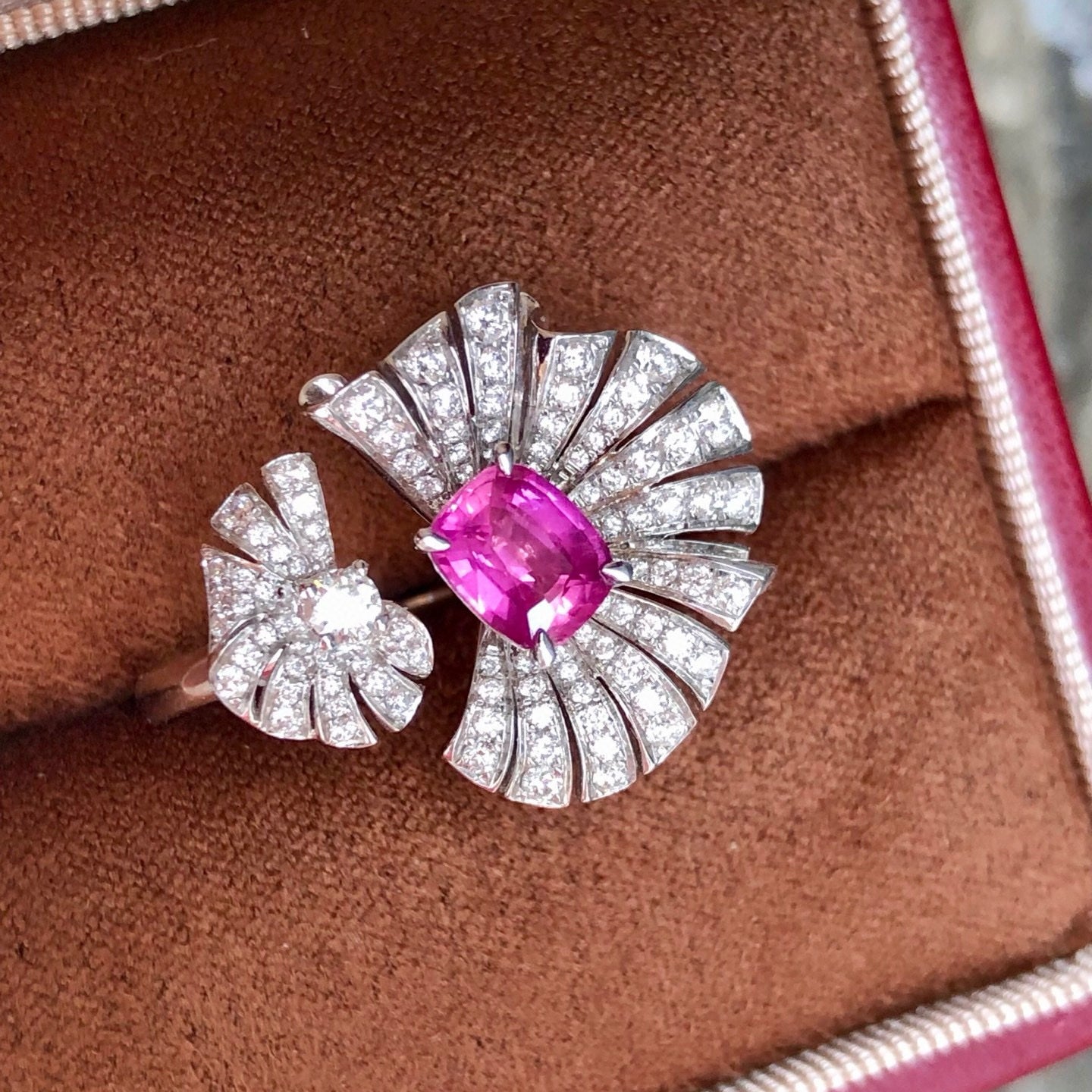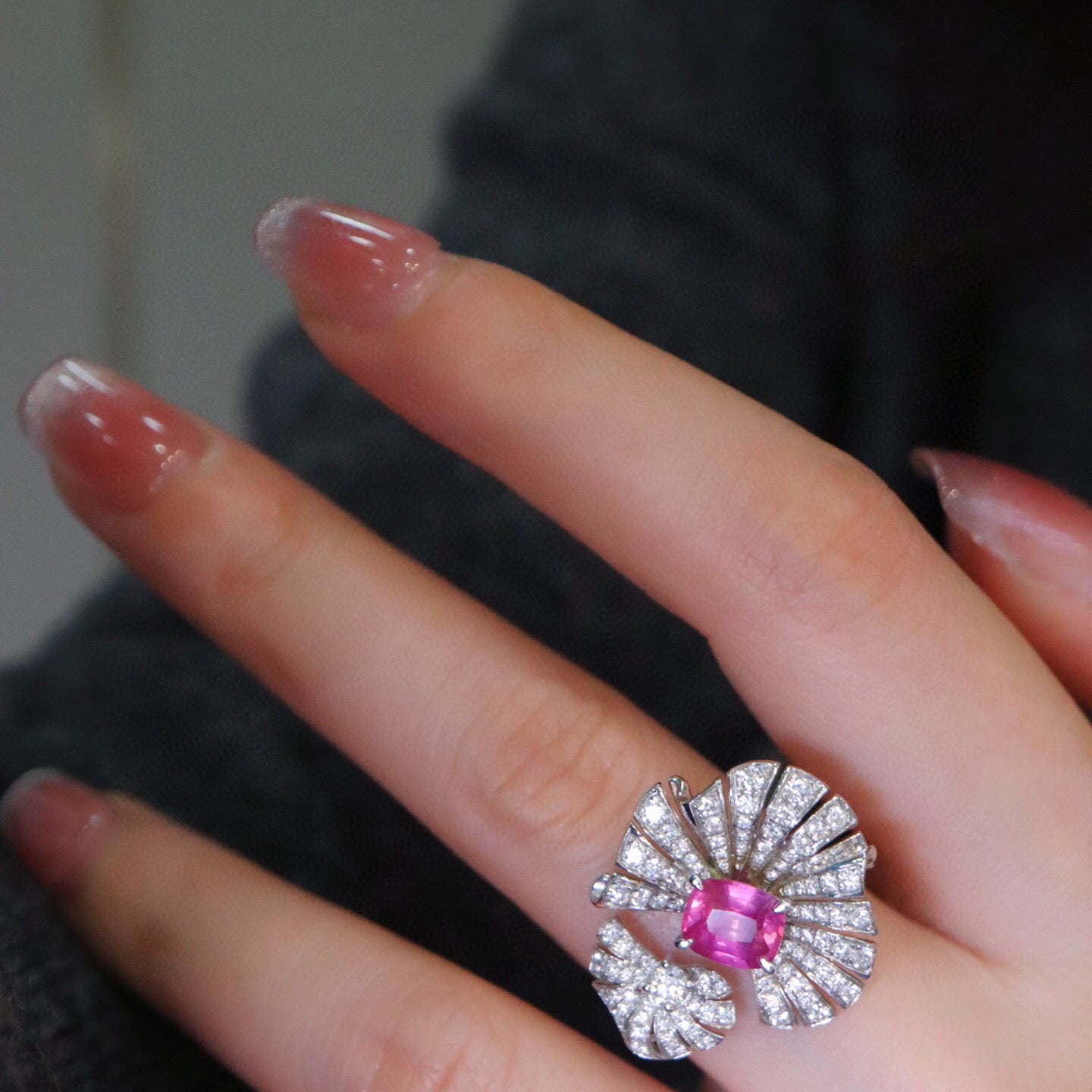 Ref:231023161 // Gold Content:14K Gold // Ring Size:7.25US // // Main Gemstone:Sapphire // Shape:Cushion // Carat Weight:1.15ct // Color:Pink // Treatment:Natural // // Adjacent Gemstone 2 : Diamond // Shape:Round // Carat Weight:0.74ct // Clarity Grade:VS-SI // Color:H // Treatment:Natural // Cut Grade:G //